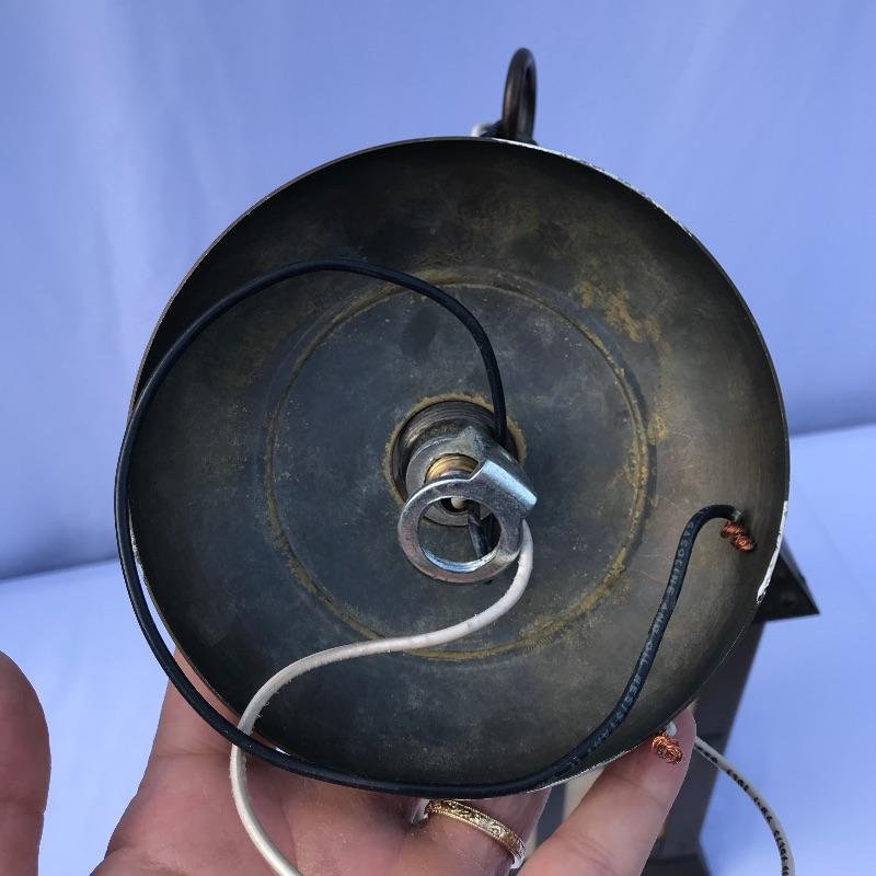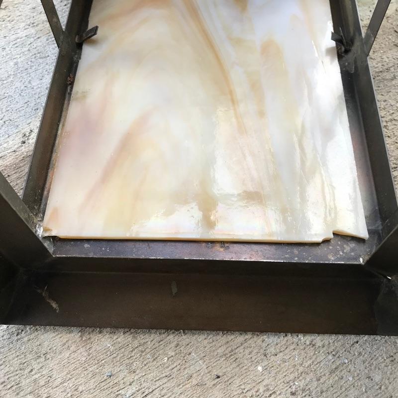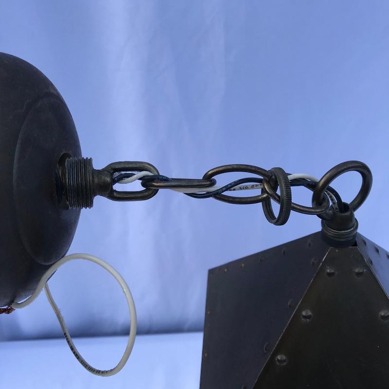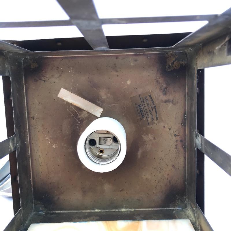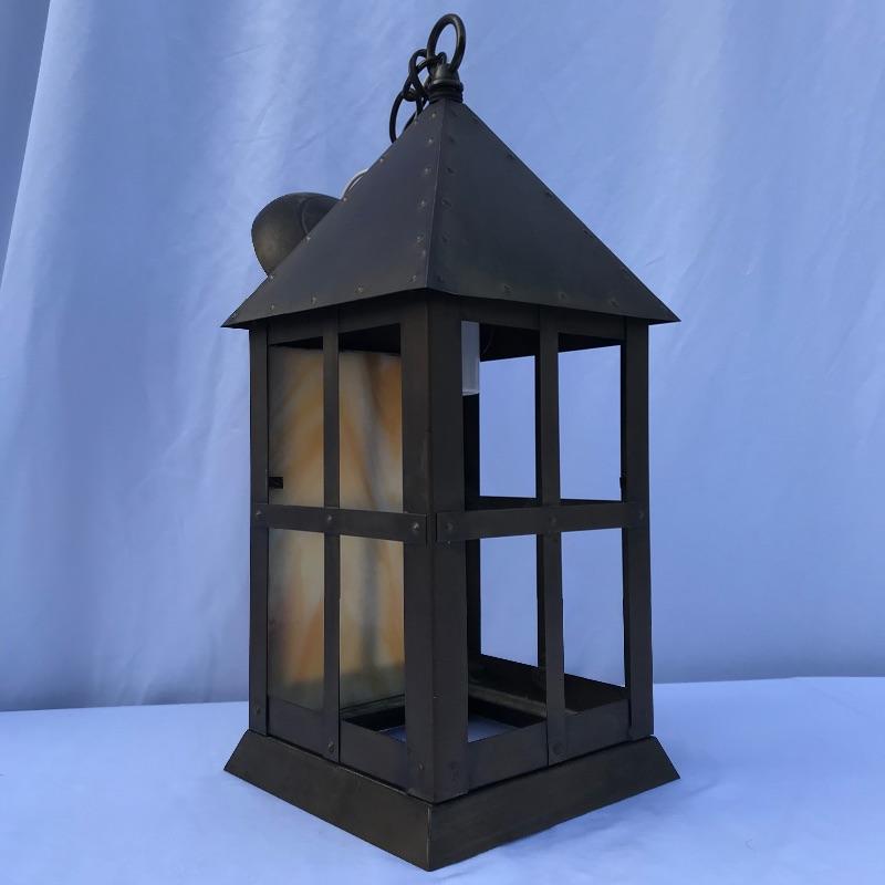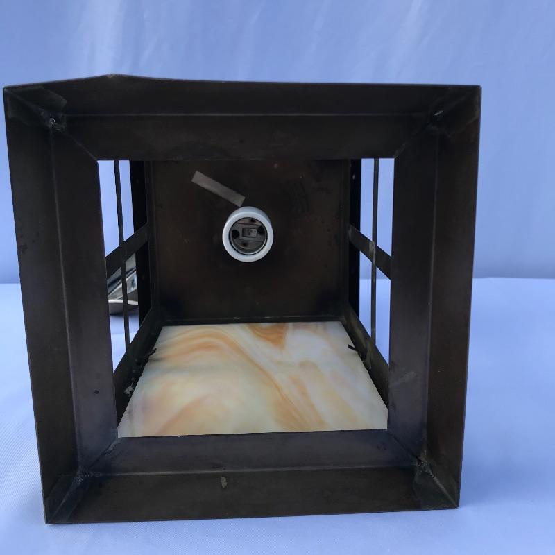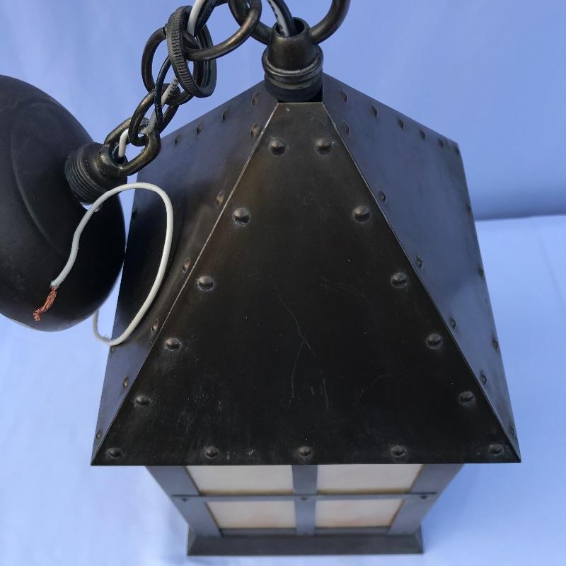 Underwriters Laboratories, Inc. hanging electric light fixture with lantern shade. It’s metal frame is in very nice shape with one panel of amber colored stained glass. The frame has each corner equipped to hold a up to a 5.75” x 9” piece of glass or whatever type of shade you choose. Current glass has a small chip at the bottom, it is unnoticeable from the outside of the lantern. Lantern itself measures approximately 7”sq x 14.75”. Chain and mount add an additional 6-7”. See photos.