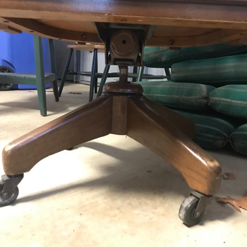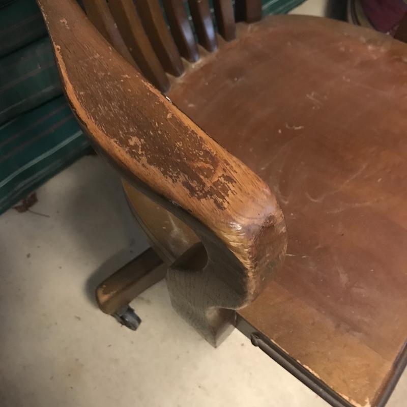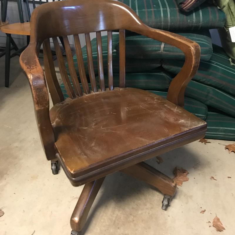 Wooden office chair that swivels and rolls. Adjustable height. Wood could use refinishing on arms. No shipping. Local pick up in Asheville, NC only.