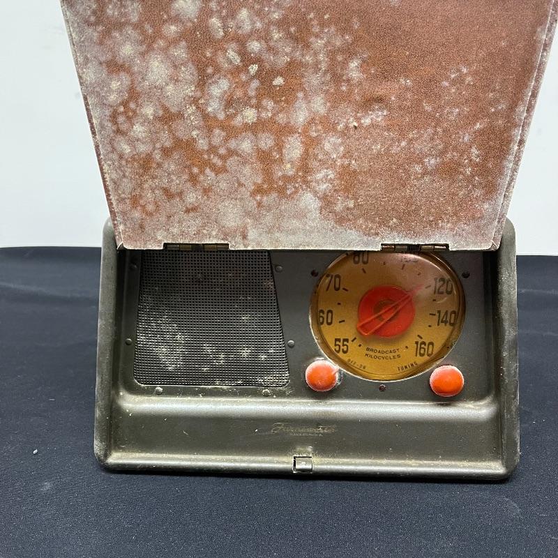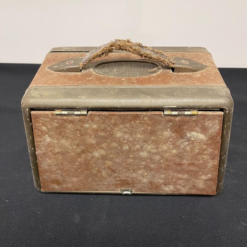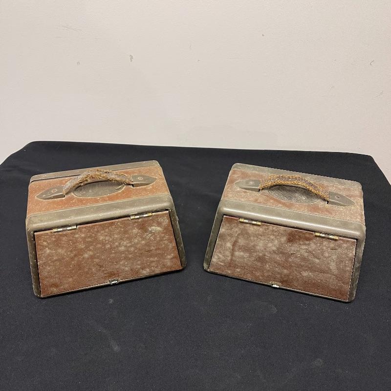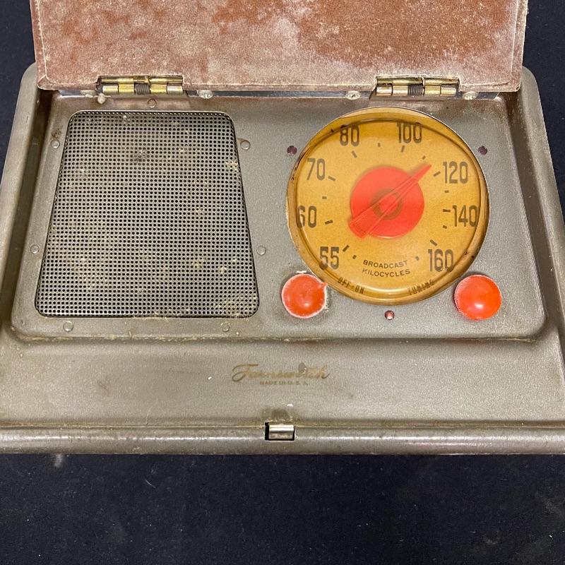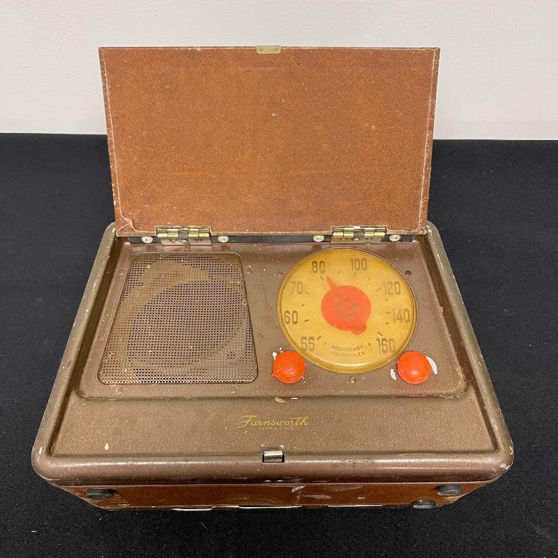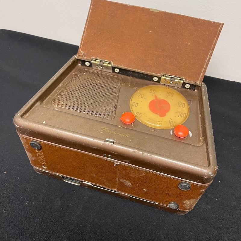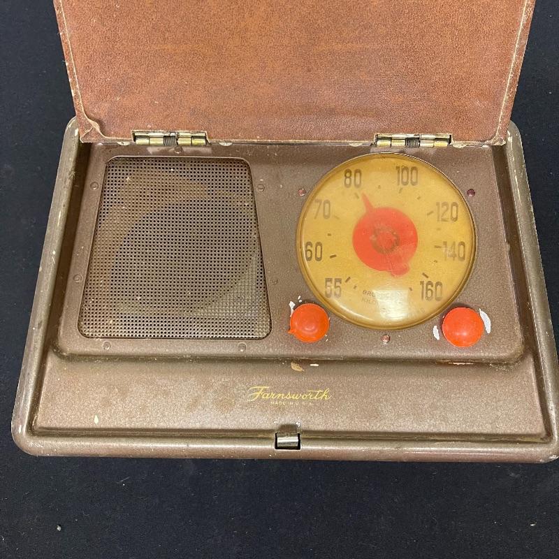 Two Farnsworth small portable radios. Model numbers for both are GP-350. Made in the USA, these small radios have some surface damage from age.