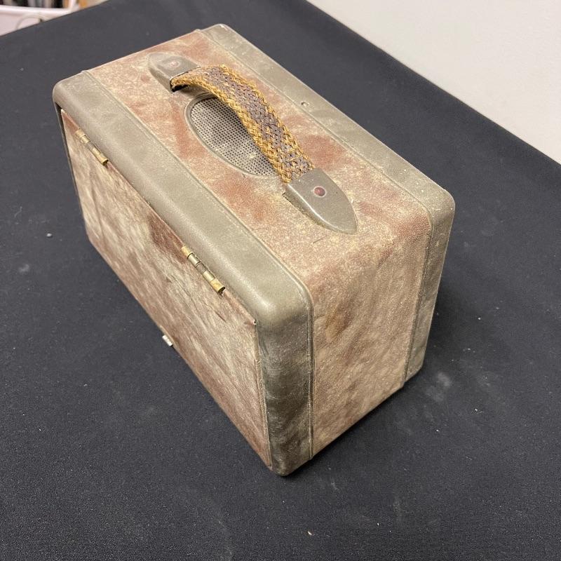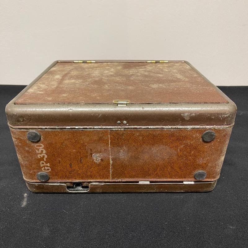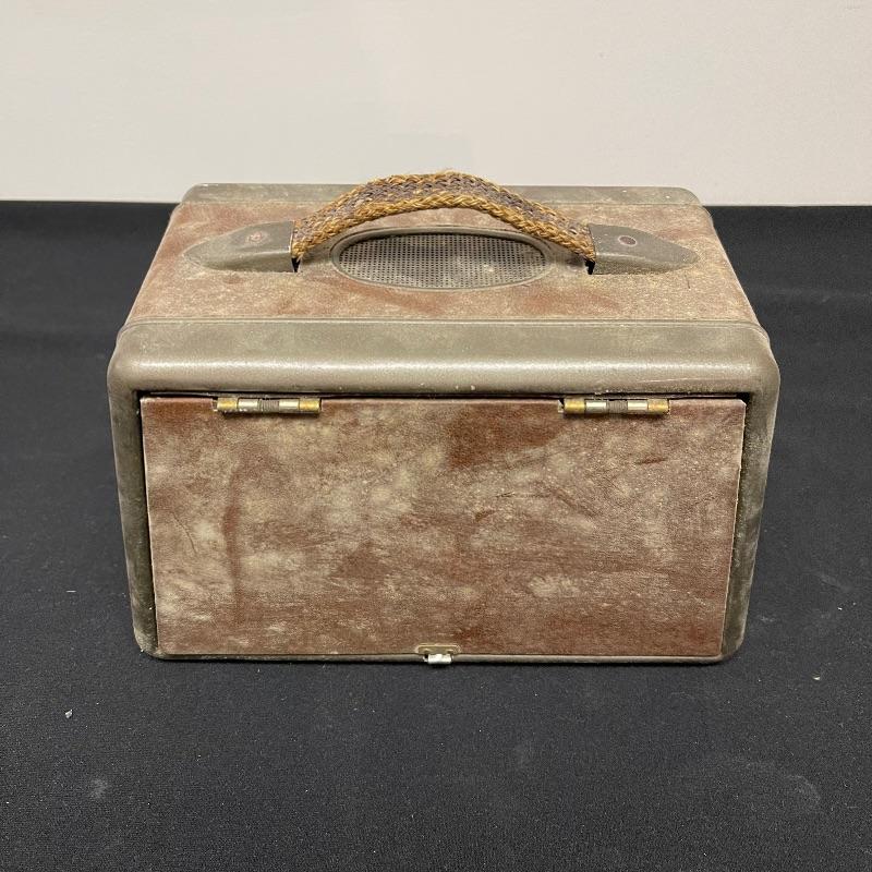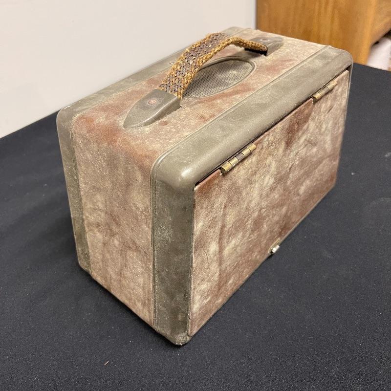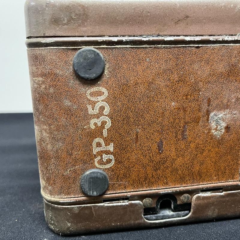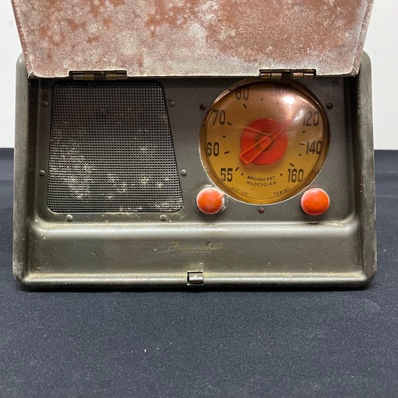 Two Farnsworth small portable radios. Model numbers for both are GP-350. Made in the USA, these small radios have some surface damage from age.