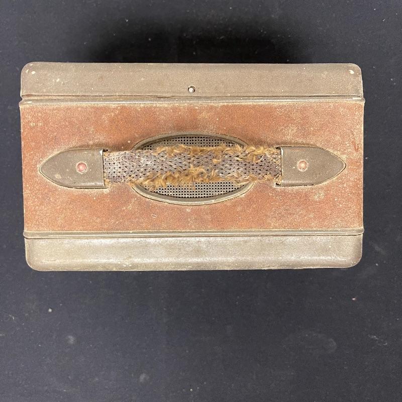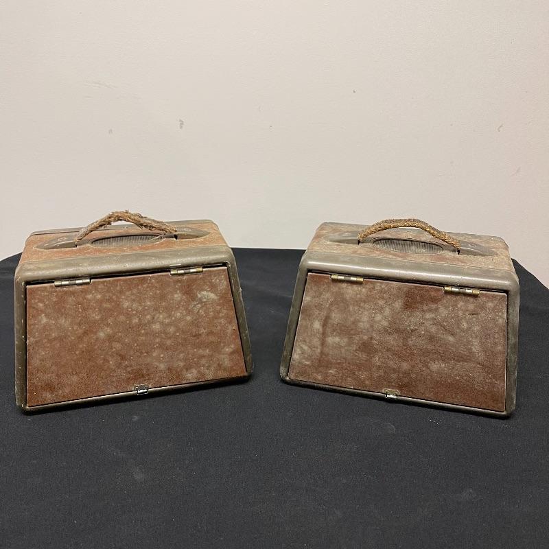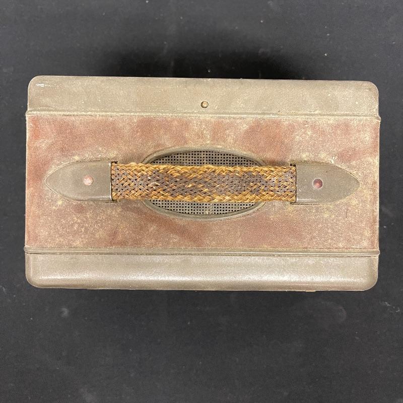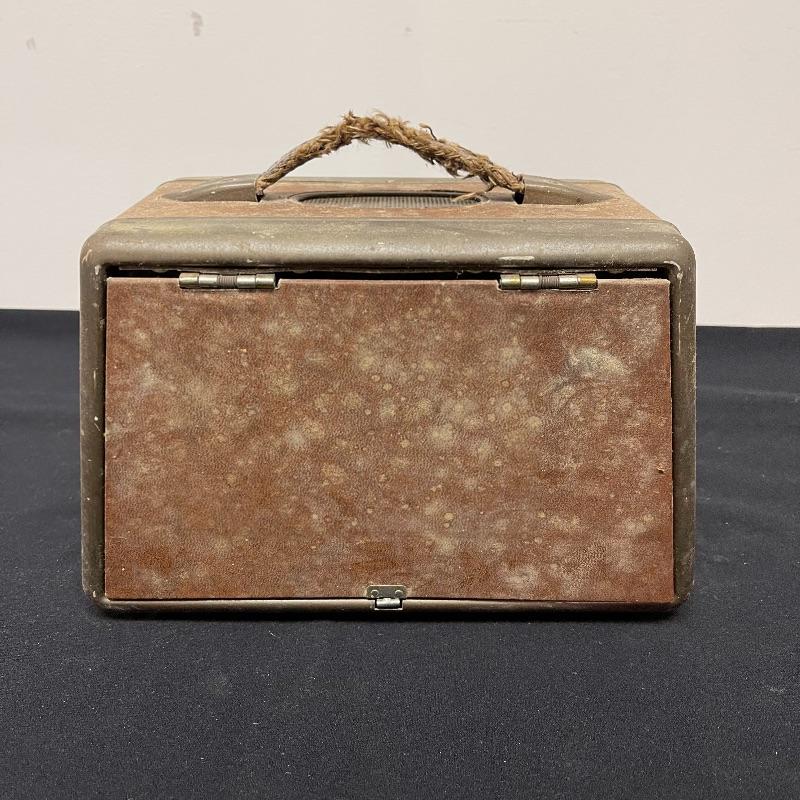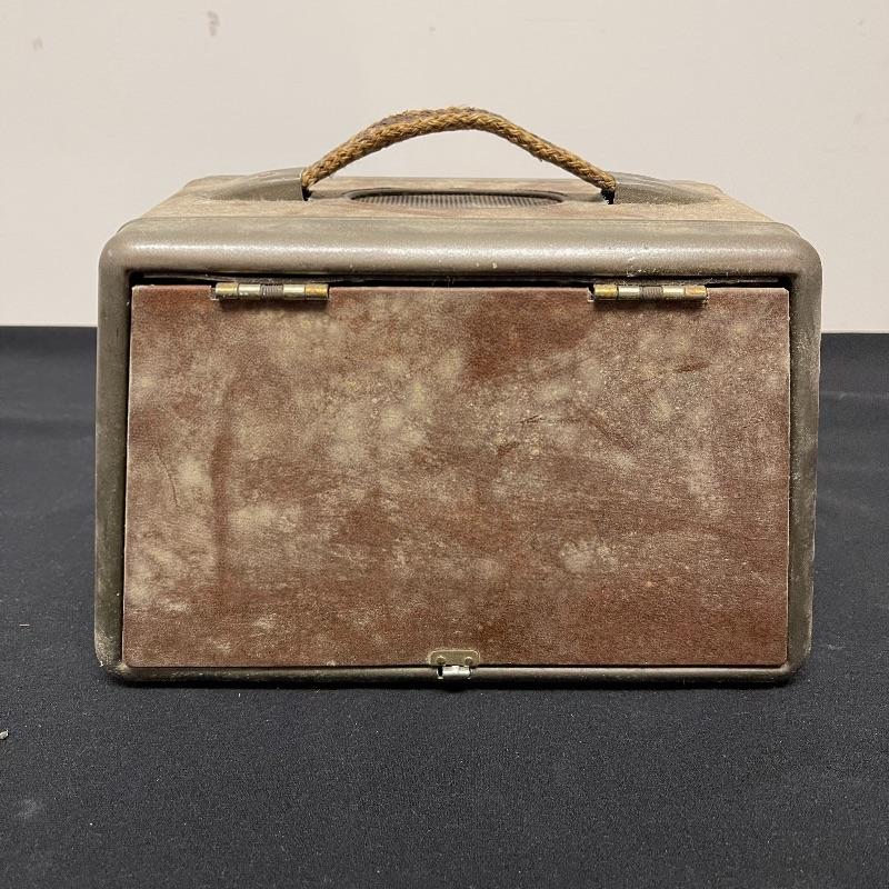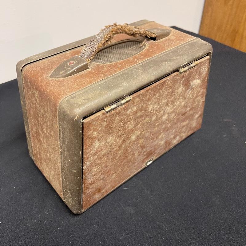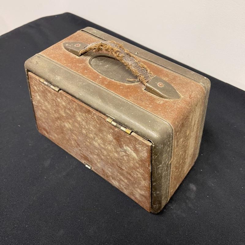 Two Farnsworth small portable radios. Model numbers for both are GP-350. Made in the USA, these small radios have some surface damage from age.