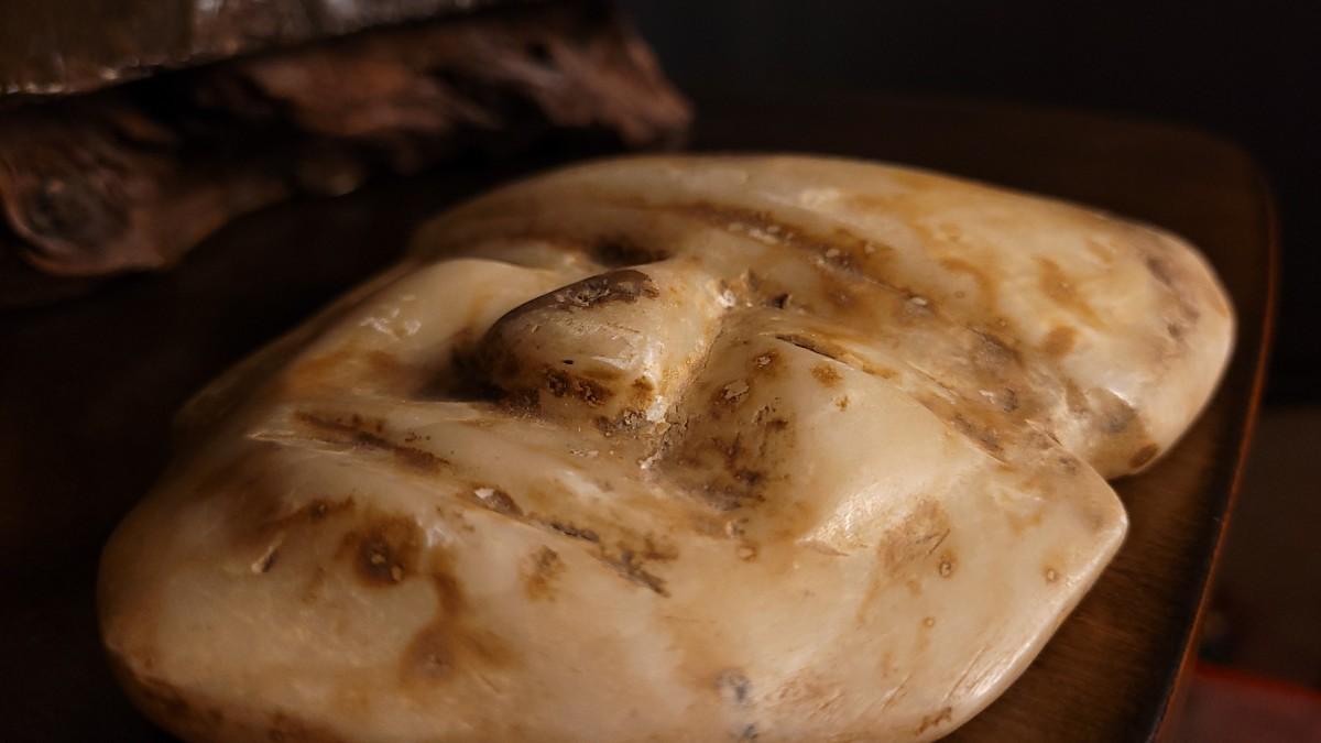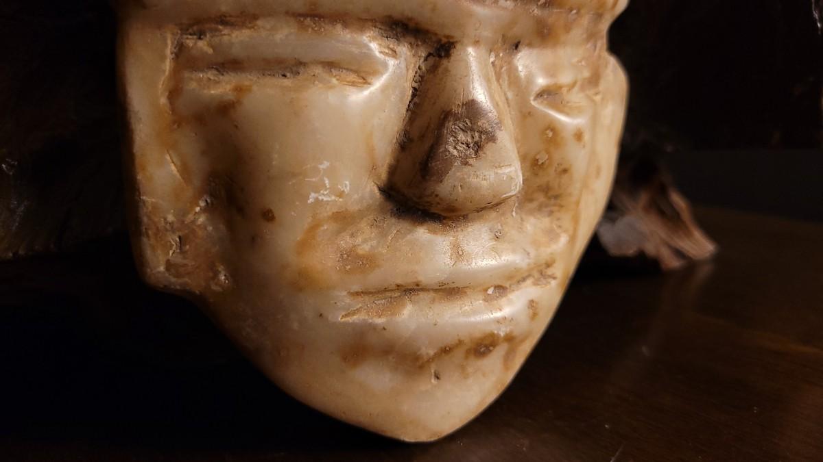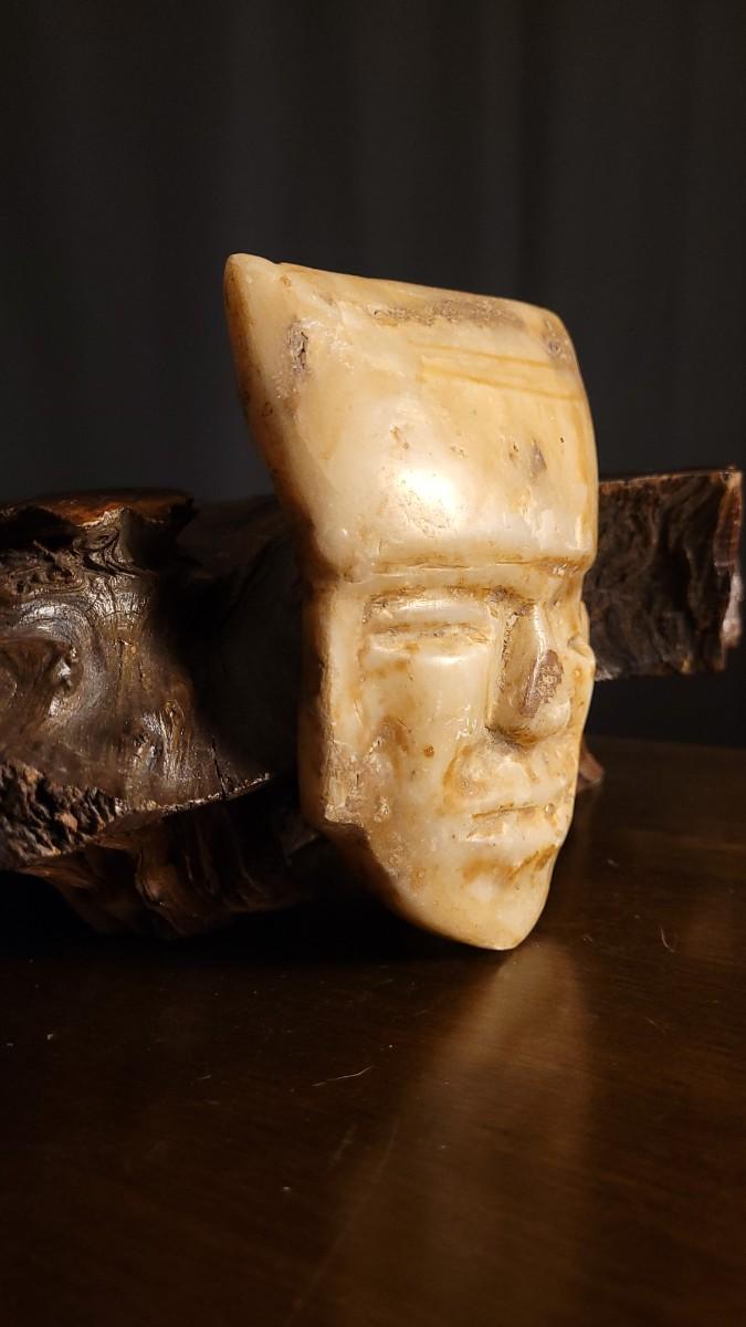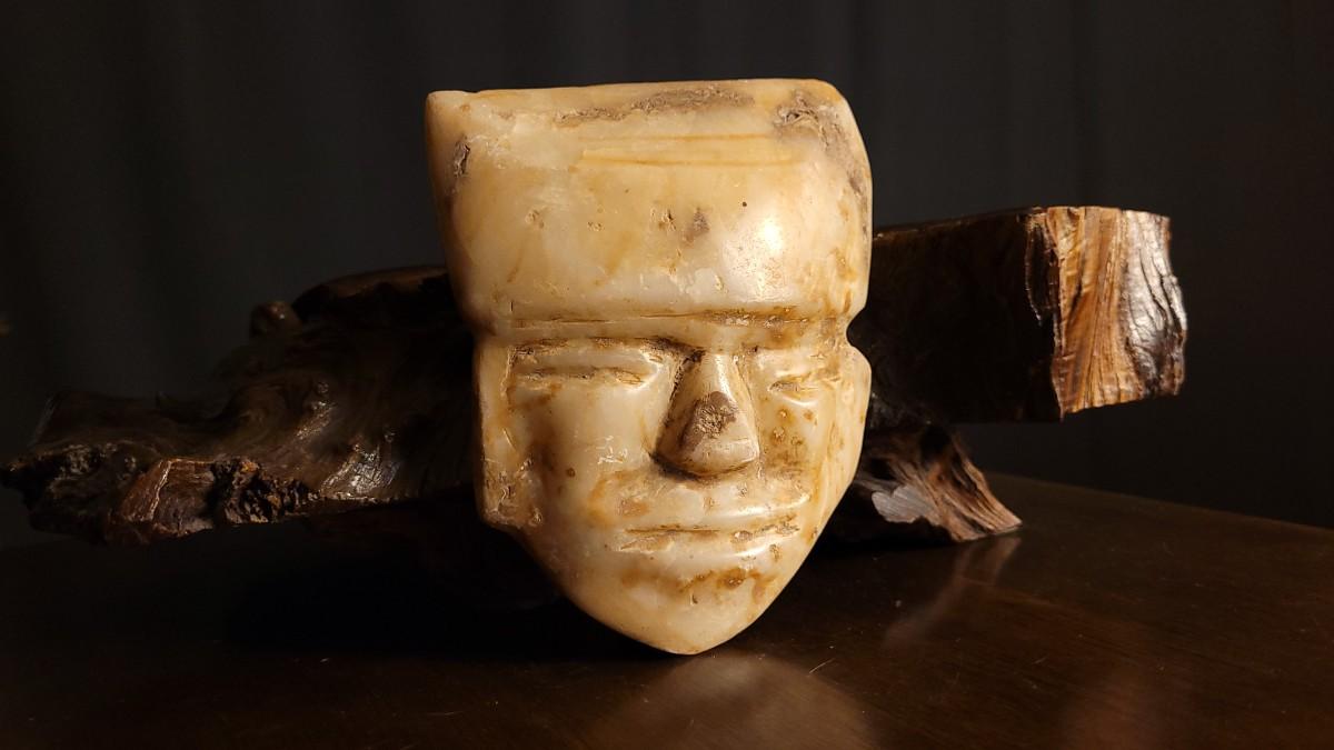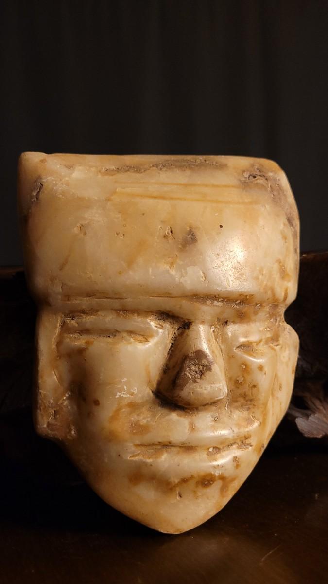 This lot features an Antique Pre Columbian Face Sculpture. Unsure if stone composition. Measures about 5.5" x 4.5" x 1" thick. A wonderful addition to any collection.