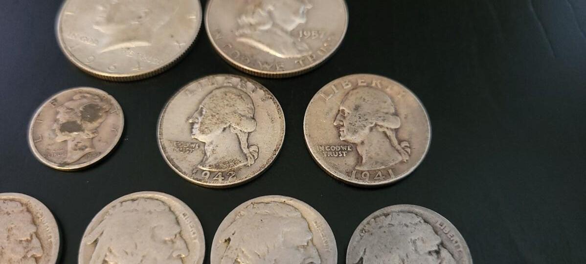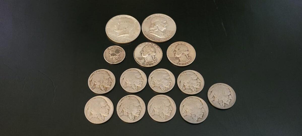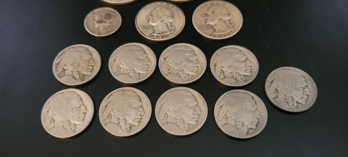 (1) 1957 US Liberty Half Dollar, (1) 1964 US Liberty Half Dollar, (1) US 1943 Liberty Dime, (1) US 1941 Quarter, (1) 1942 Quarter, (9) Assorted Buffalo Nickels.