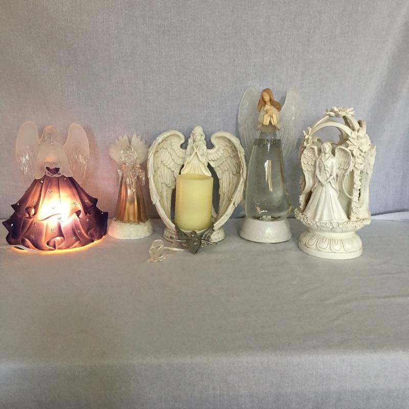 Lovely assortment of Angels that includes six in a variety of styles. Four are battery operated, one is electric and one is just metal. Everyone can use an angel in their life. Largest angel measures 12” tall with a 4”D base.