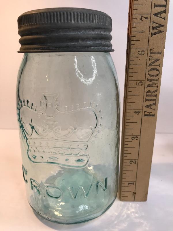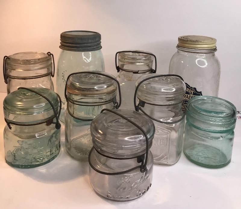 Collection of mason/fruit jars in various sizes and color with glass lids. Excellent variety. Labels may not be original to bottle. Each lot is unique and you will need to see all pictures. Pictures have been taken from all side to see condition and markings. What you see in the pictures is the actual content of the lot and the pictures are the best representation of the bottles. All bottles are sold-is according to the pictures. For further information please google the makers marks for age.