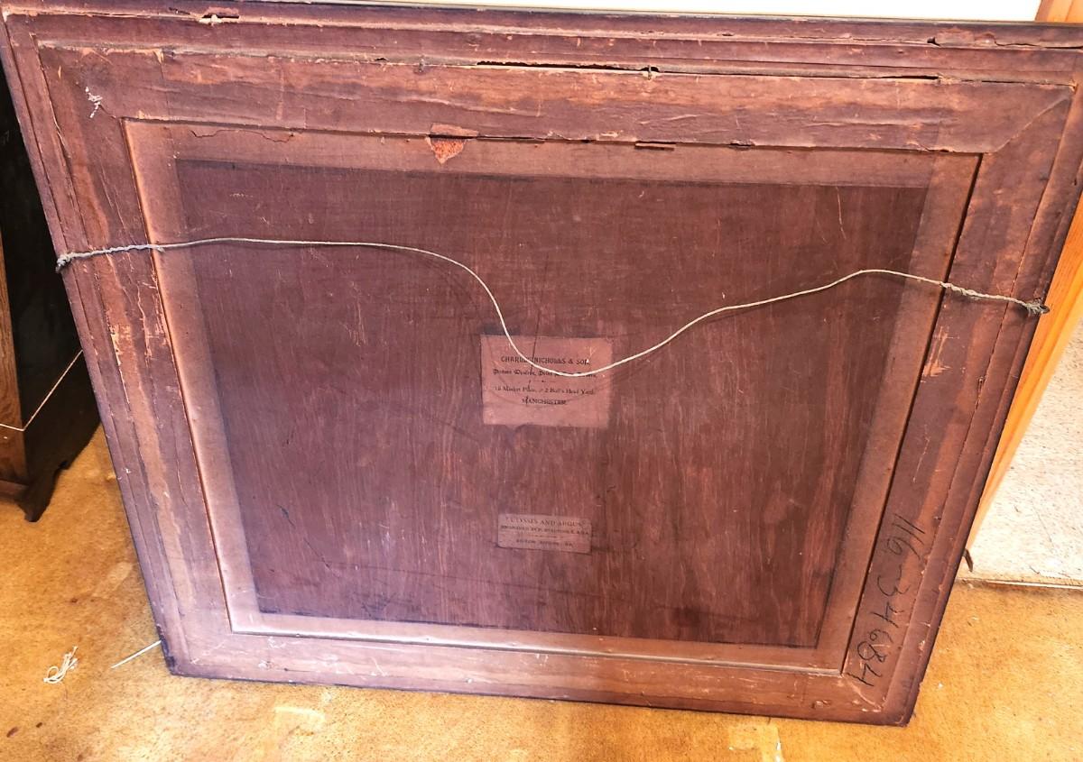 Painted in 1885, Briton Rivière's "Ulysses and Argus" captures a poignant moment from Homer's epic, "The Odyssey." The painting depicts the touching reunion between Ulysses, the hero, and his faithful dog Argus. Despite being in disguise after his long journey home, Ulysses is recognized by his loyal dog, who has been waiting for him for years. Engraved by F. Stackpoole, Royal Academy. Original antique frame - an English piece - framed by Charles Nicholls & Sons, Manchester, England. 37" x 33".