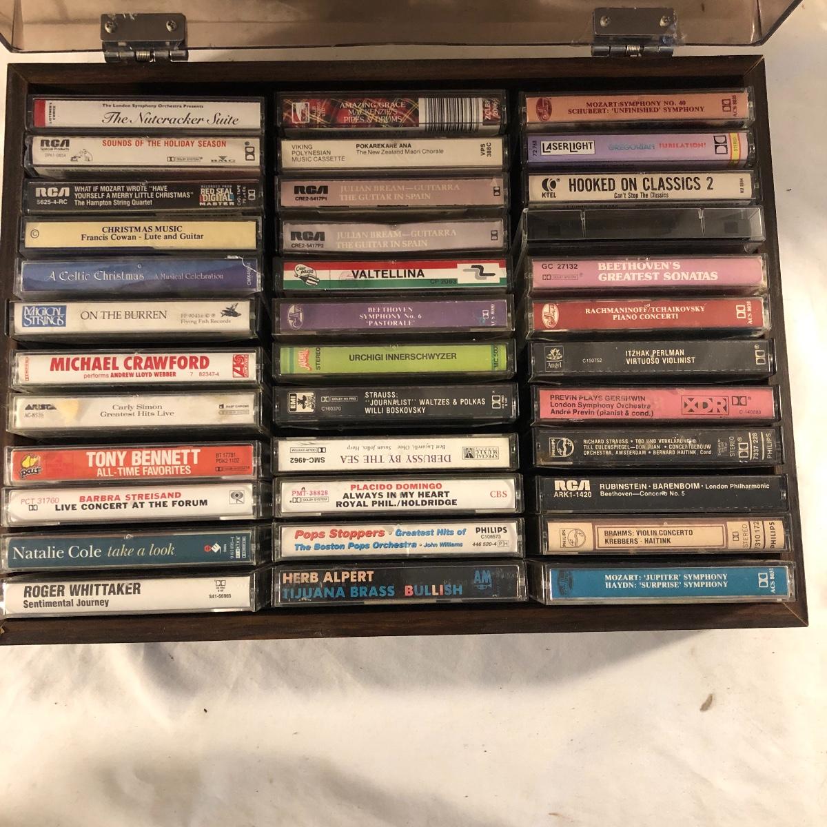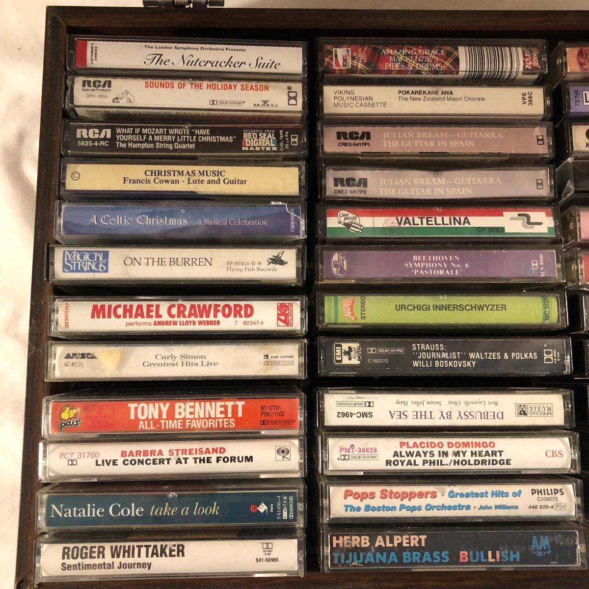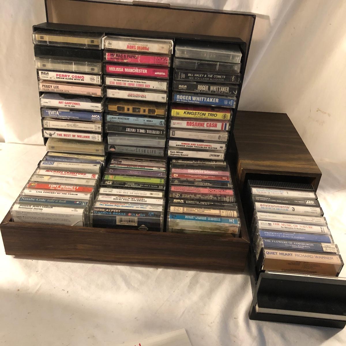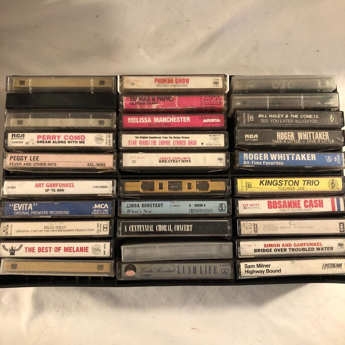 Go old school with this collection of cassette tapes. Lot includes I’ve sixty five cassette tapes in a variety of genres. Includes Perry Como, Simon & Garfunkel, Rosanne Cash, Placido Domingo, Kingston Trio, Bill Haley and the Comets and more. Largest storage box measures 10.5” x 14.5” x 4” and holds thirty six cassette tapes and is coming apart on corner, see pictures.