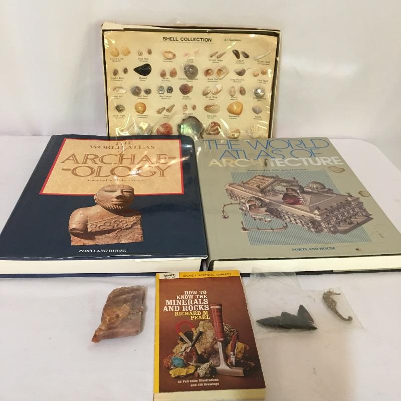 Coffee table books and more. Lot includes The World Atlas of Archaeology and the World Atlas of Architecture coffee table books , shell collection, sea horse and a few arrowheads.