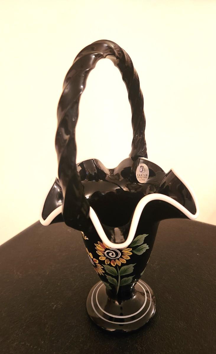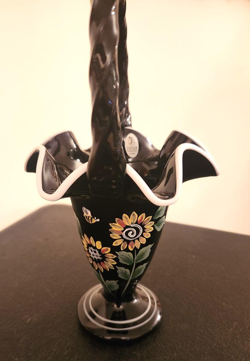 Made in 2002 - Snowcrest rim, hand painted, signed, label. Striking black Fenton Art Glass basket with sunflower/bee motif. Good condition.