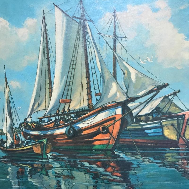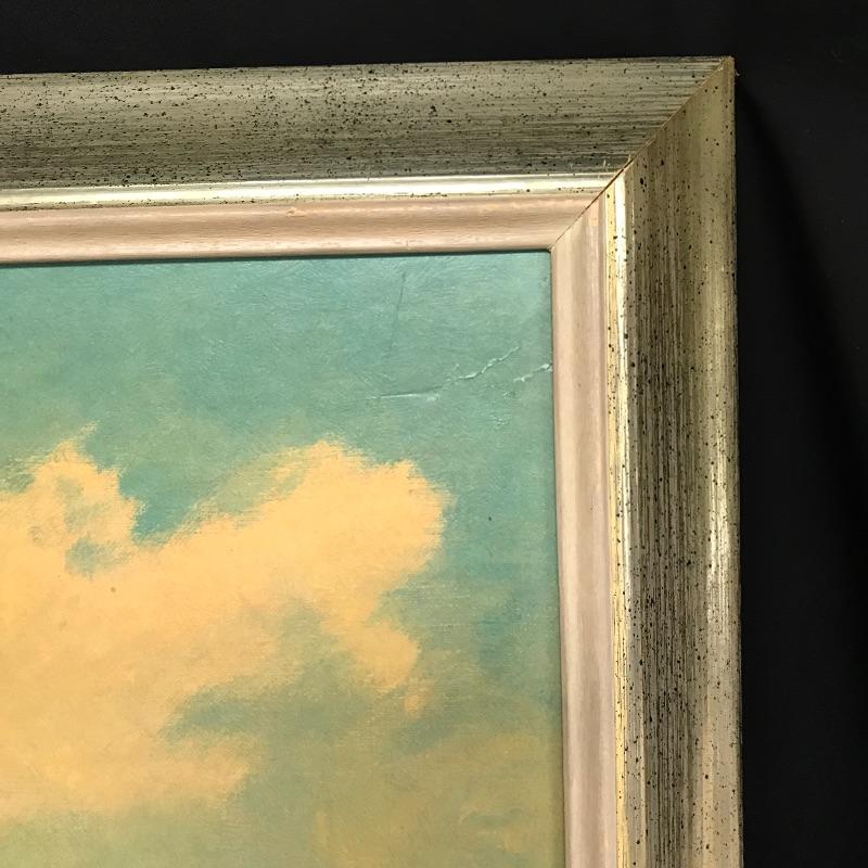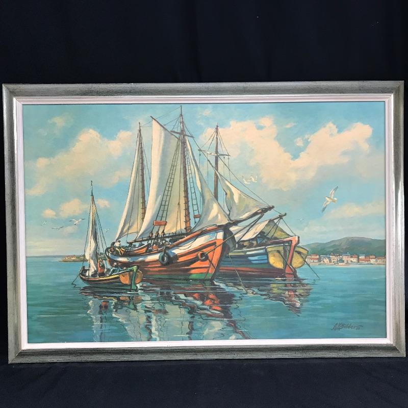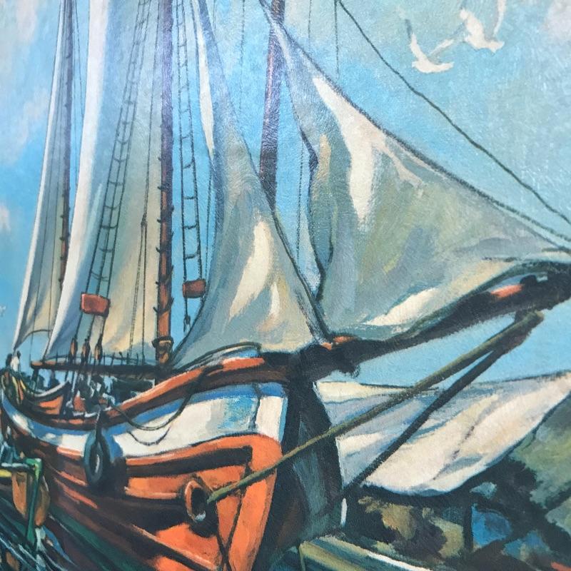 You can almost smell the ocean with this nice large boating print framed and ready to hang. Sign “A.K. Bilder 66”. Appears to be a print on board. There is a minor blemish on the corner that is barely noticeable, see photos for details. Framed 40” x 28”. Shipping available but please get a shipping quote from UPS 828-252-6930 prior to bidding.