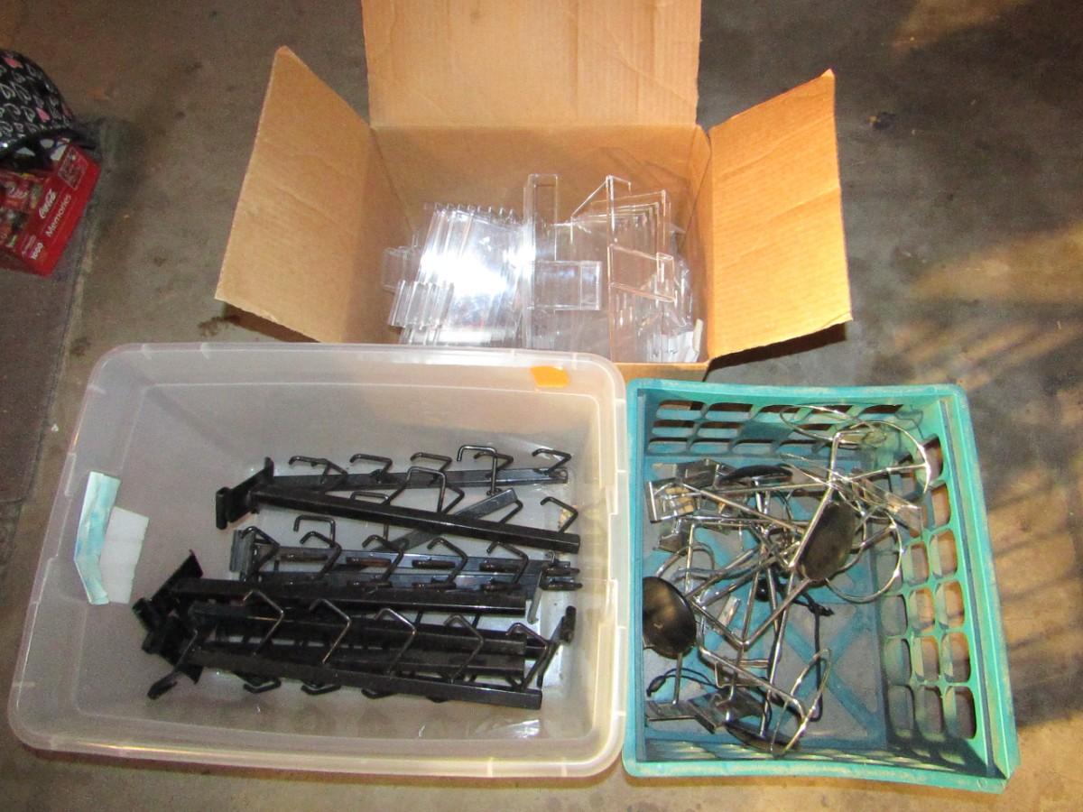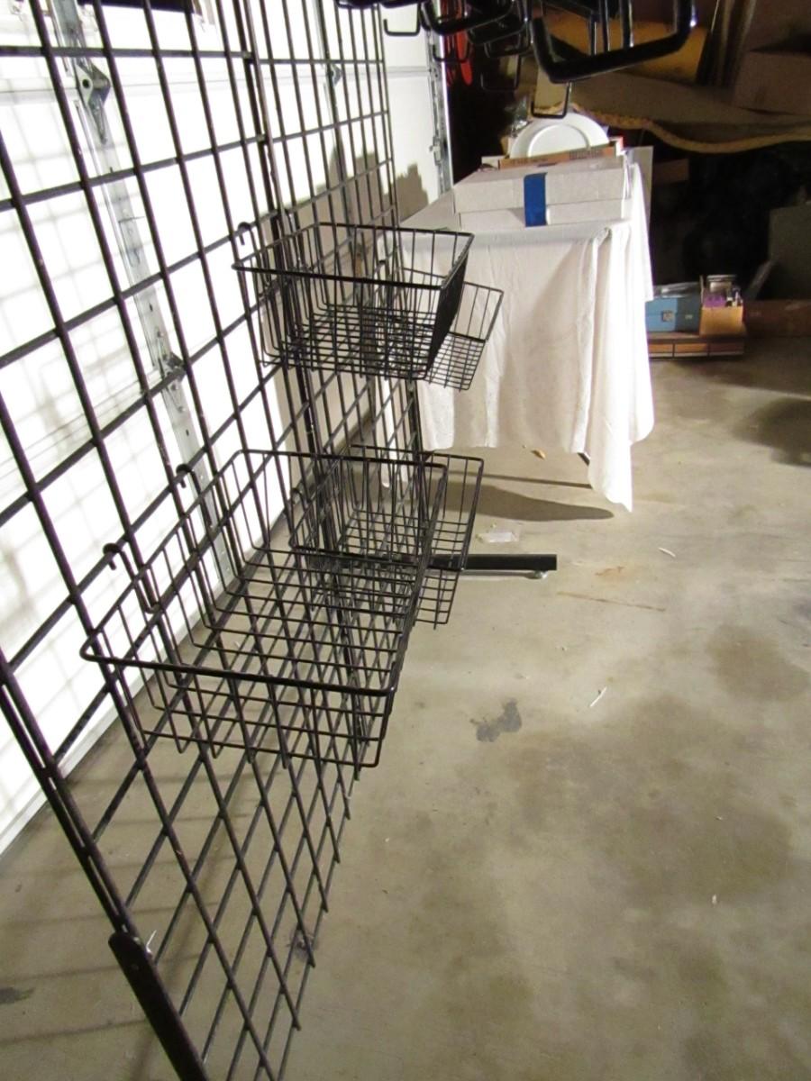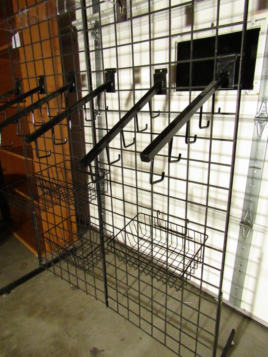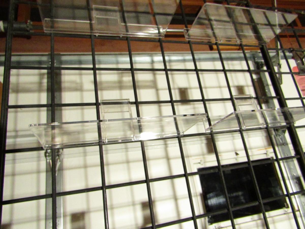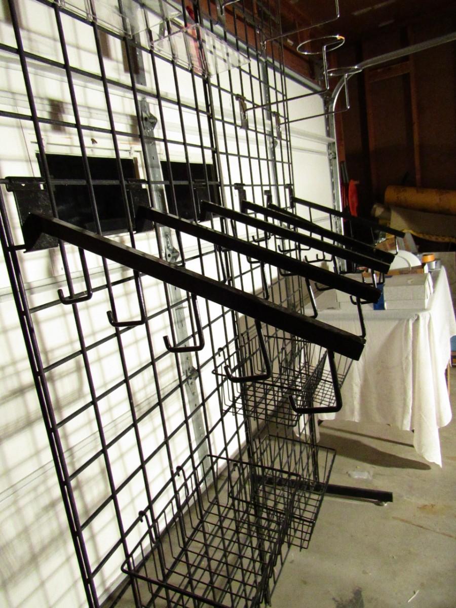 ALL METAL, DURABLE STANDS WITH CLEAR PLASTIC SHELVES, PERFECT FOR DISPLAYING A SHOE OR SIMILIAR ITEMS. BARS WITH 5 HOOKS GREAT FOR PURSES OR ANYTHING TO BE HUNG. METAL MESH BASKETS AND HAT HOLDERS
