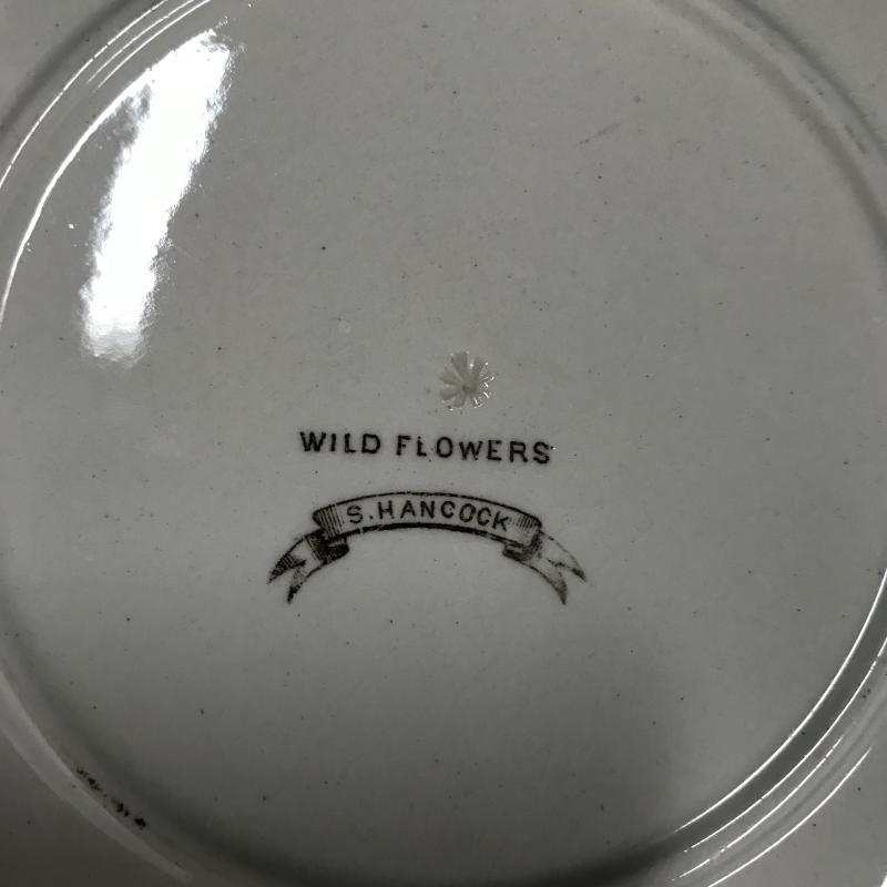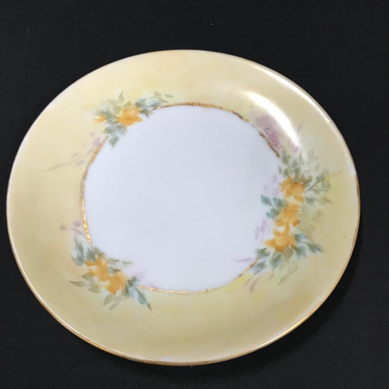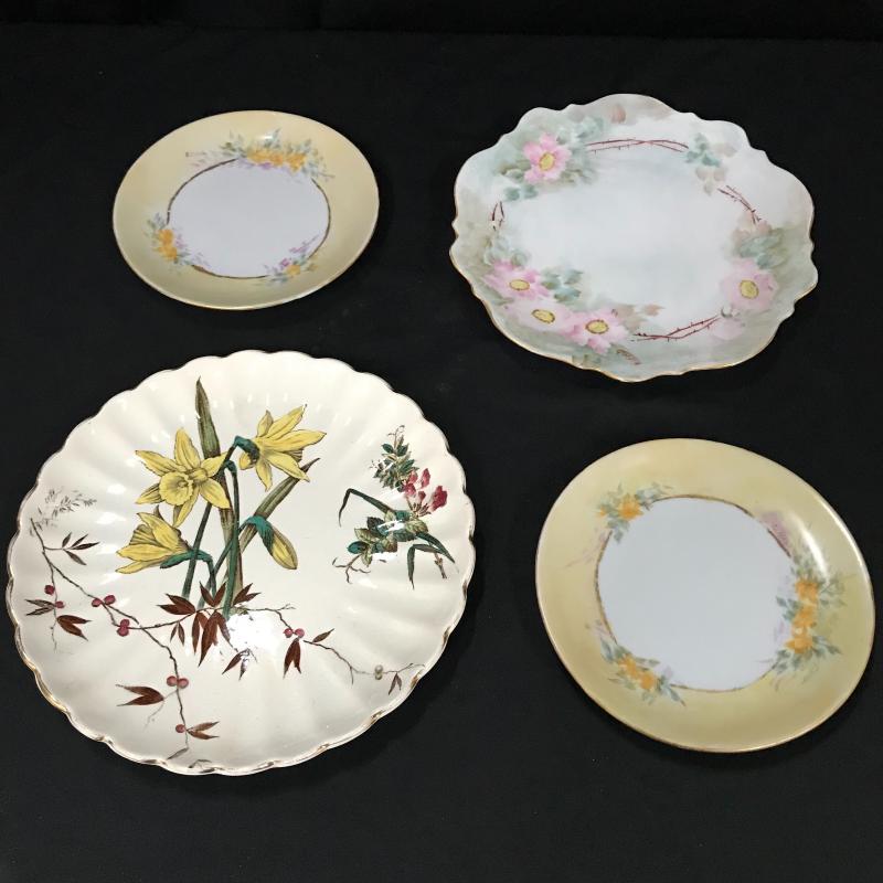 Four hand-painted plates. Smaller two are approx. 6” in diameter with no markings, pink floral plate is approx. 8.5” in diameter with marking “CT,” and yellow floral plate is also approx. 8.5” in diameter with markings that read “Wild Flowers S. Hancock.” Shipping available or local pickup in Asheville, NC.