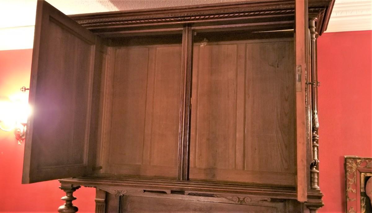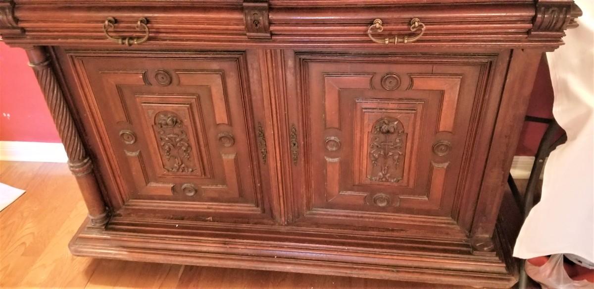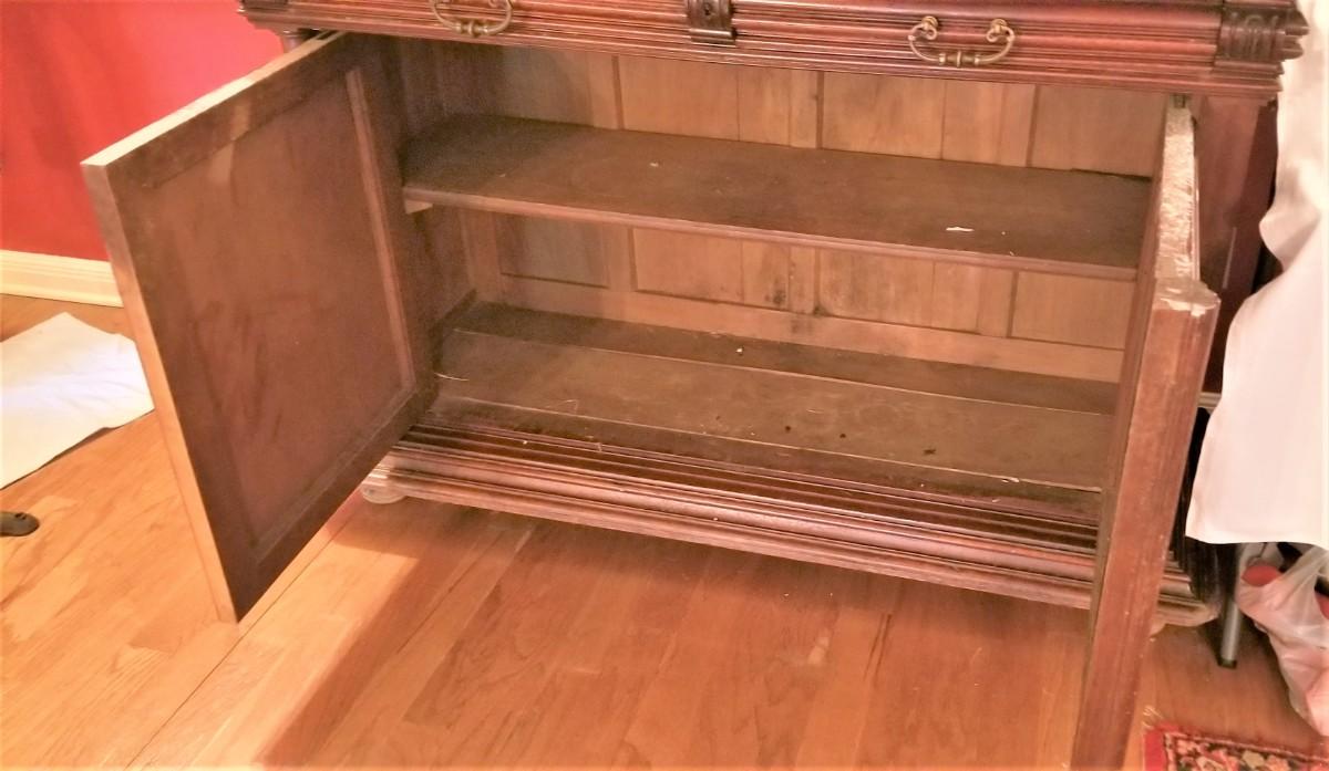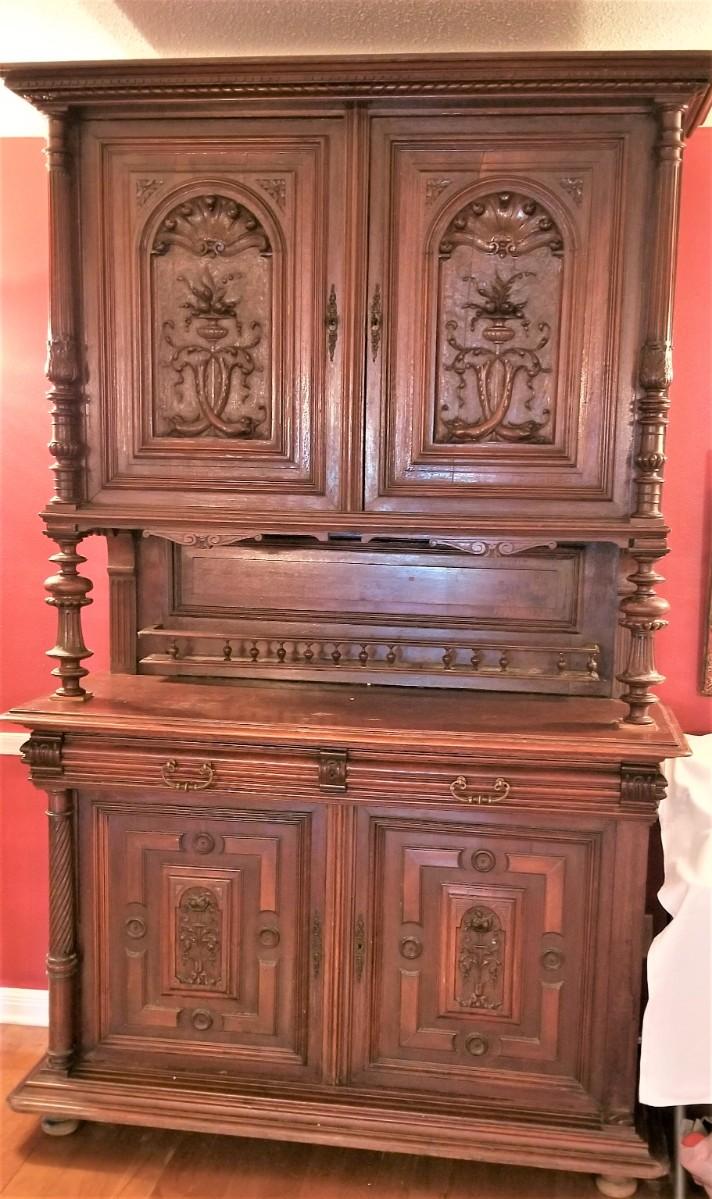 This large antique turn of the century Oak Jacobean style sideboard is just the piece to "anchor" a room - hide your flat screen tv behind its upper doors. Lots of carved decoration, plenty of storage - the upper cabinets lock (we have the key) - 2 drawers, 57" across, 91" tall, 22" deep. Look at all the photos, as they are part of the description - there are some minor losses on this piece - this piece is in used antique condition. Purchaser must be able to remove from the house load themselves with no assistance from us. Solid oak - heavy.