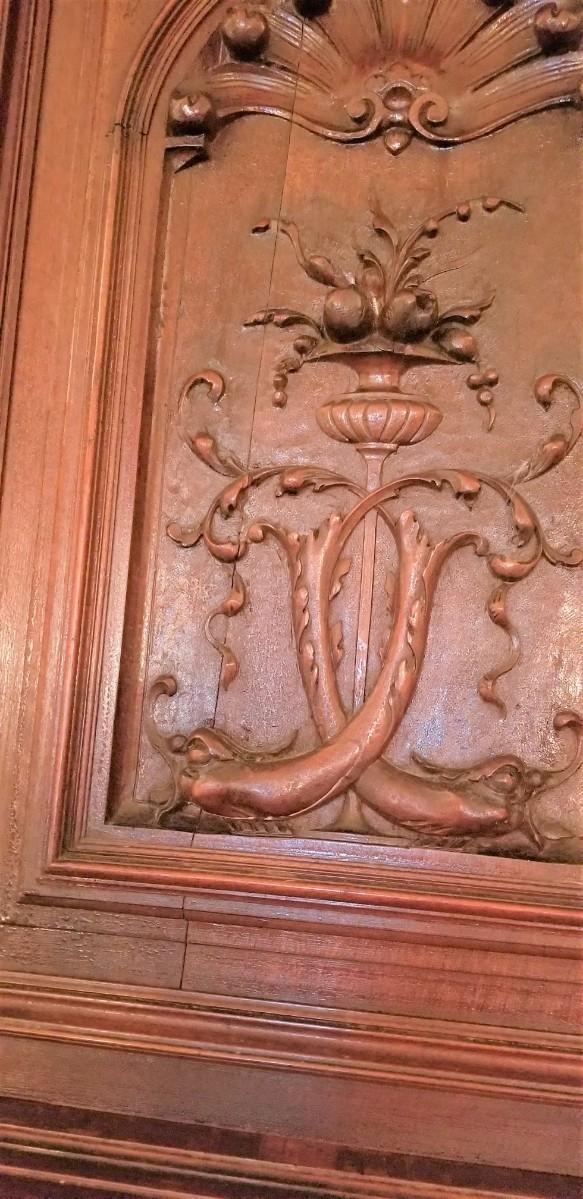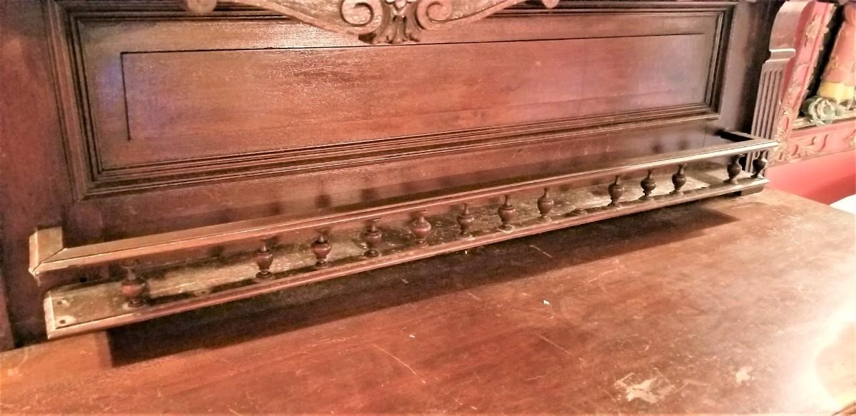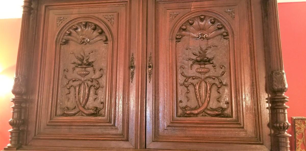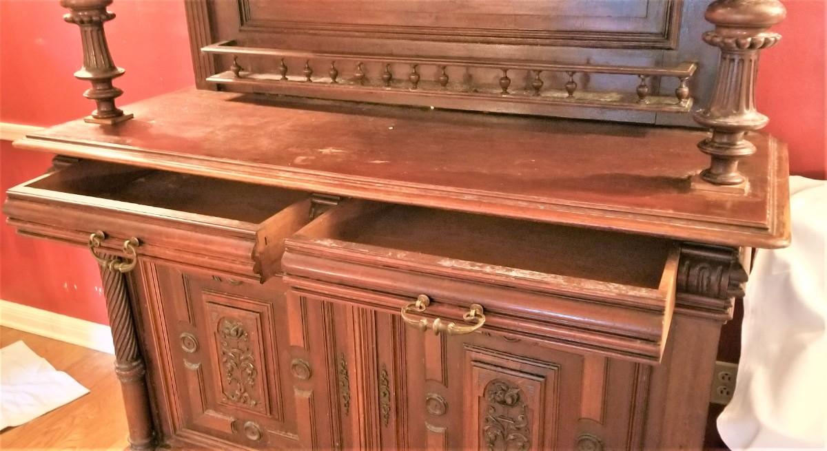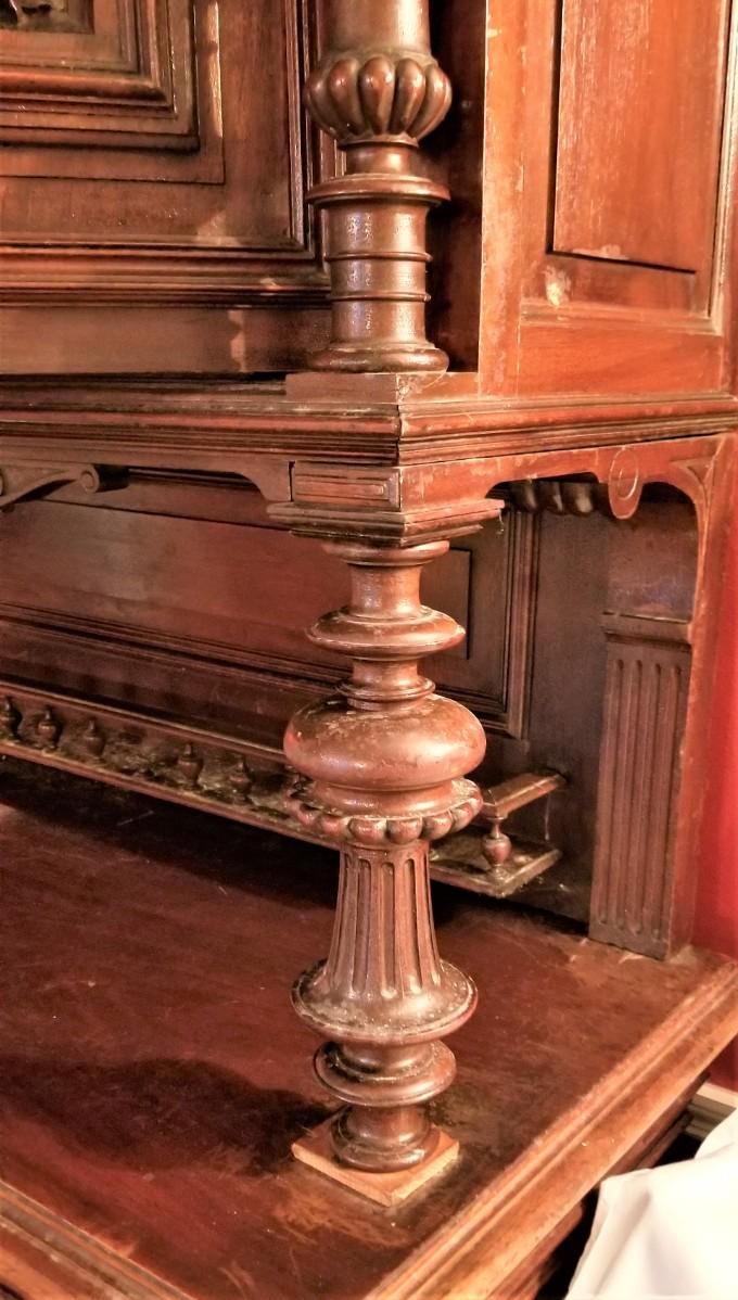 This large antique turn of the century Oak Jacobean style sideboard is just the piece to "anchor" a room - hide your flat screen tv behind its upper doors. Lots of carved decoration, plenty of storage - the upper cabinets lock (we have the key) - 2 drawers, 57" across, 91" tall, 22" deep. Look at all the photos, as they are part of the description - there are some minor losses on this piece - this piece is in used antique condition. Purchaser must be able to remove from the house load themselves with no assistance from us. Solid oak - heavy.