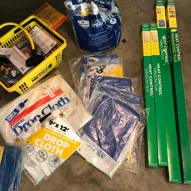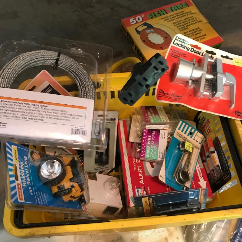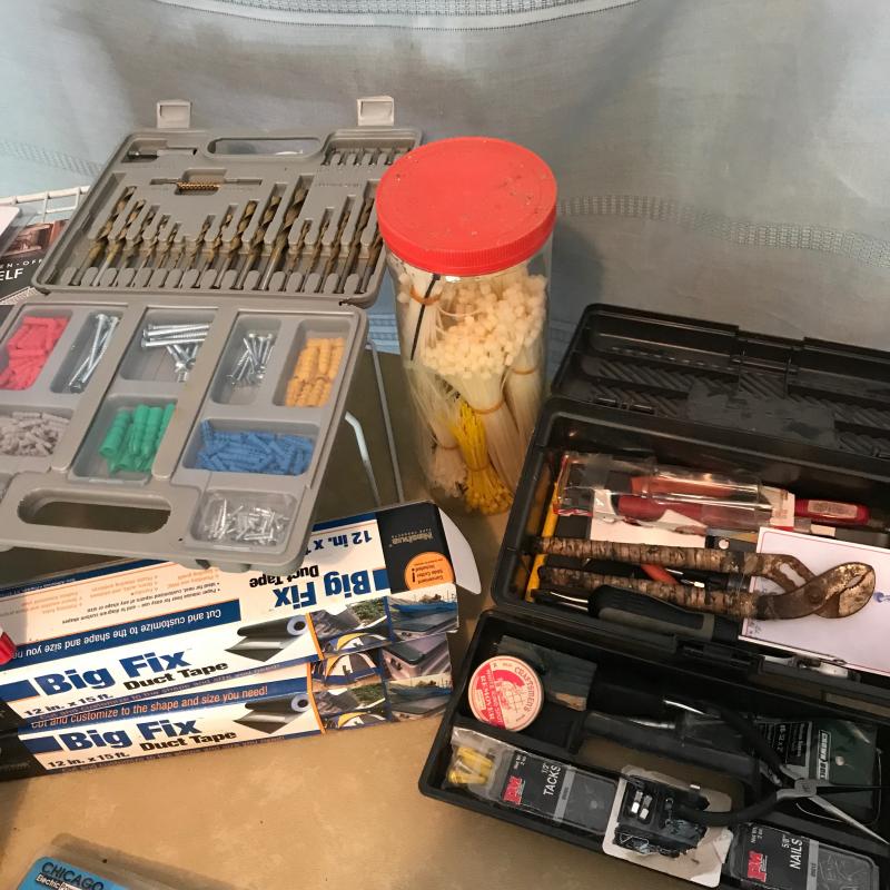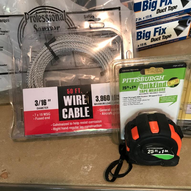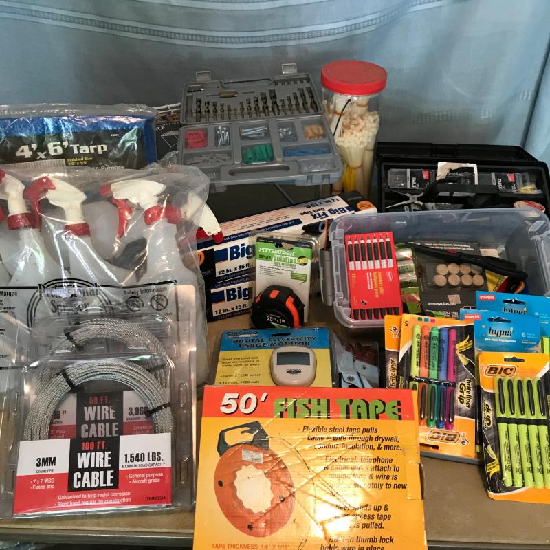 Lots of miscellaneous household supplies. Includes empty sprayers, zip ties, tarps, duck tape, wire cable, highlighters and more. See photos. No shipping. Local pick up only.