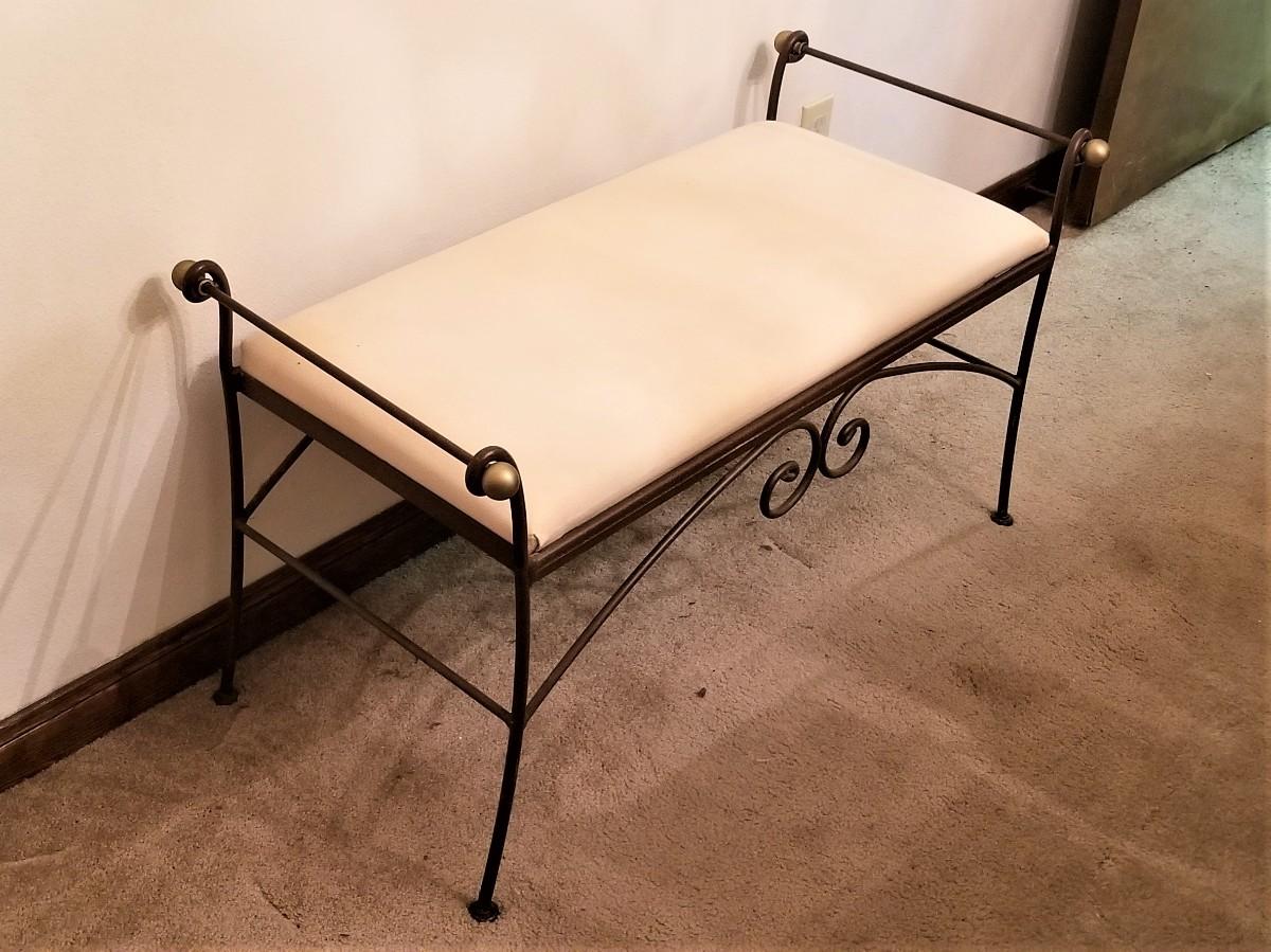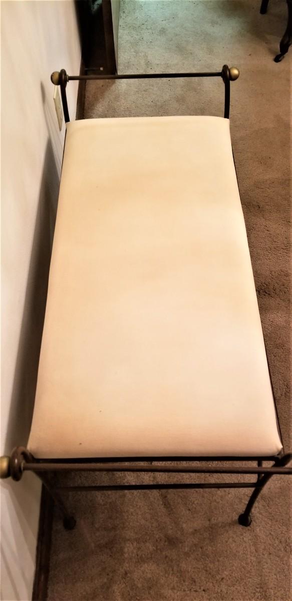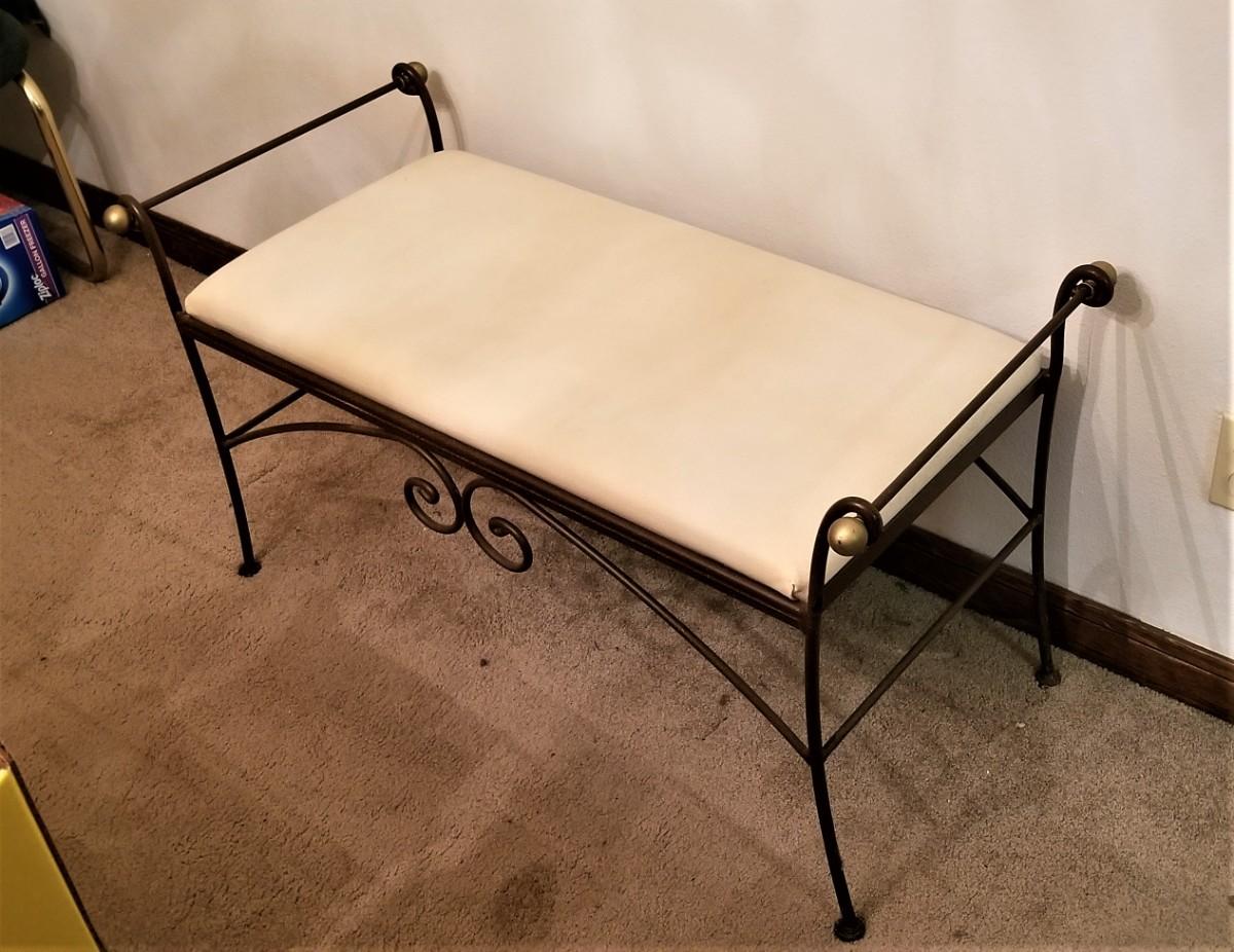 Gently used metal/upholstered bench for the foot of the bed or a side bench. Clean - the knobs on one side have a bit of wear from where they rubbed against something - nothing major. 38.5" across, 18" deep, 21" tall.