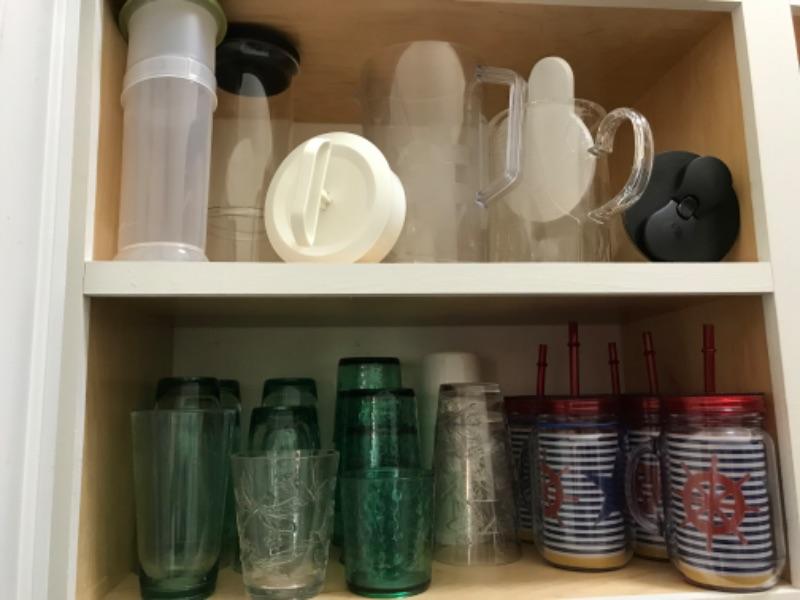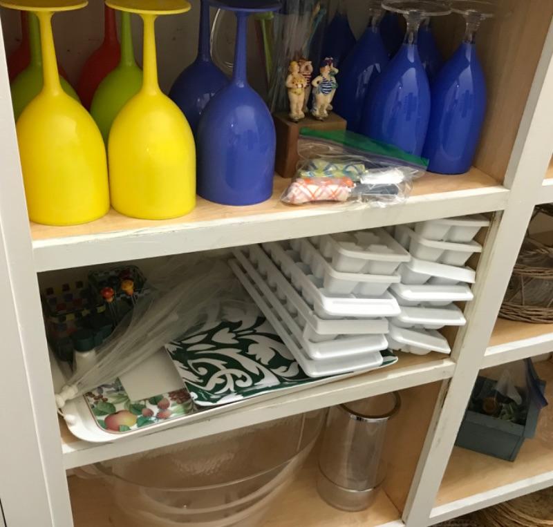lot of plastic serving lot with pitchers cups, stirrers, trays, ice cube trays, bowls, ice bucket