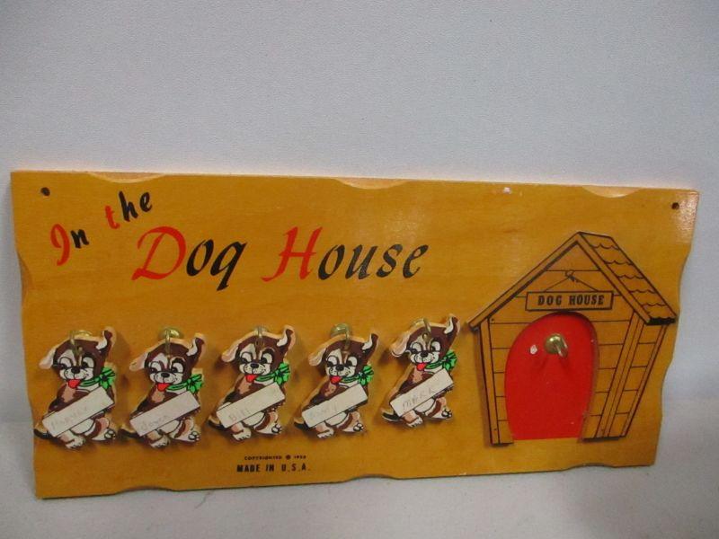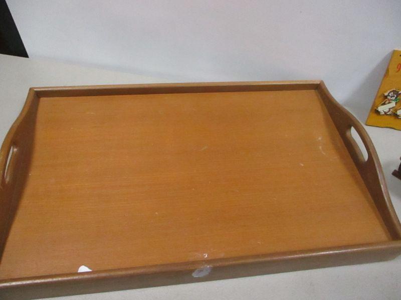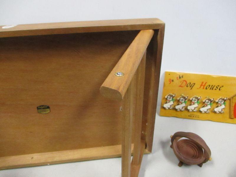 1958 In The Dog House All the Family USA Wooden Plaque Sign - Teak Wood Serving Tray w Handles, Folding Legs Dolphin Bed Breakfast
