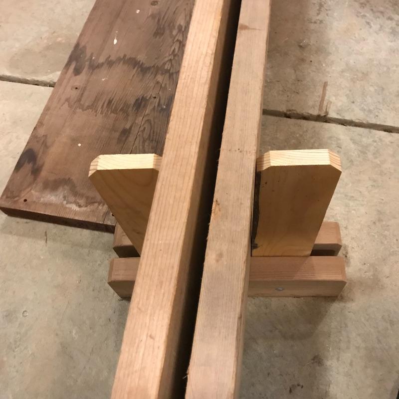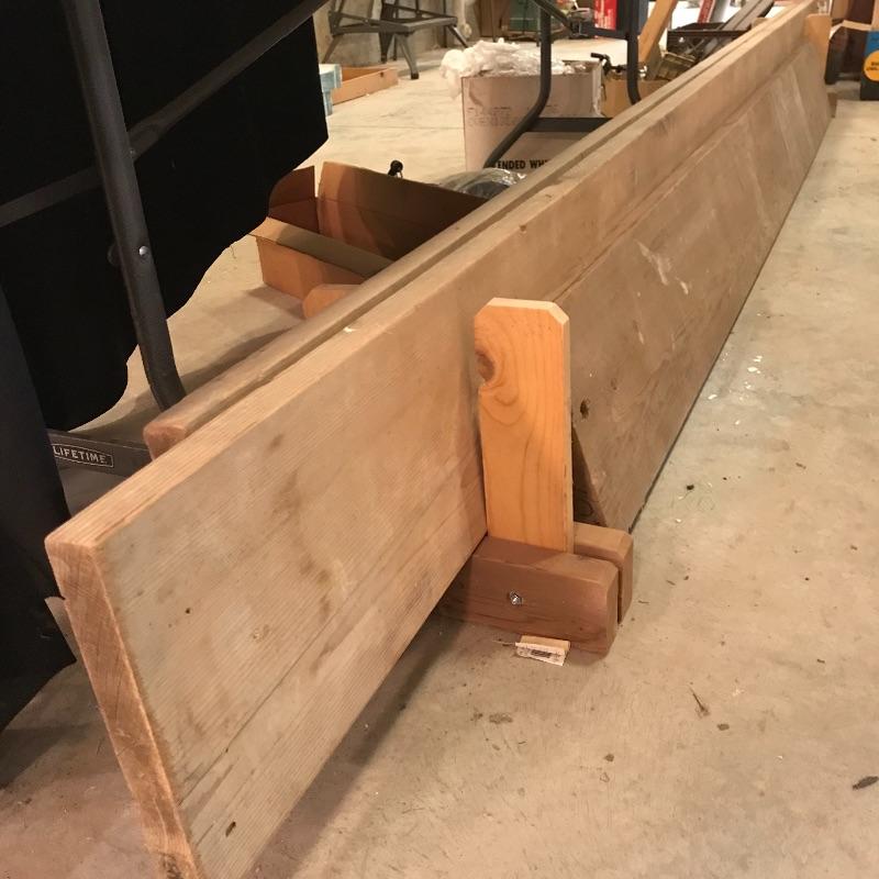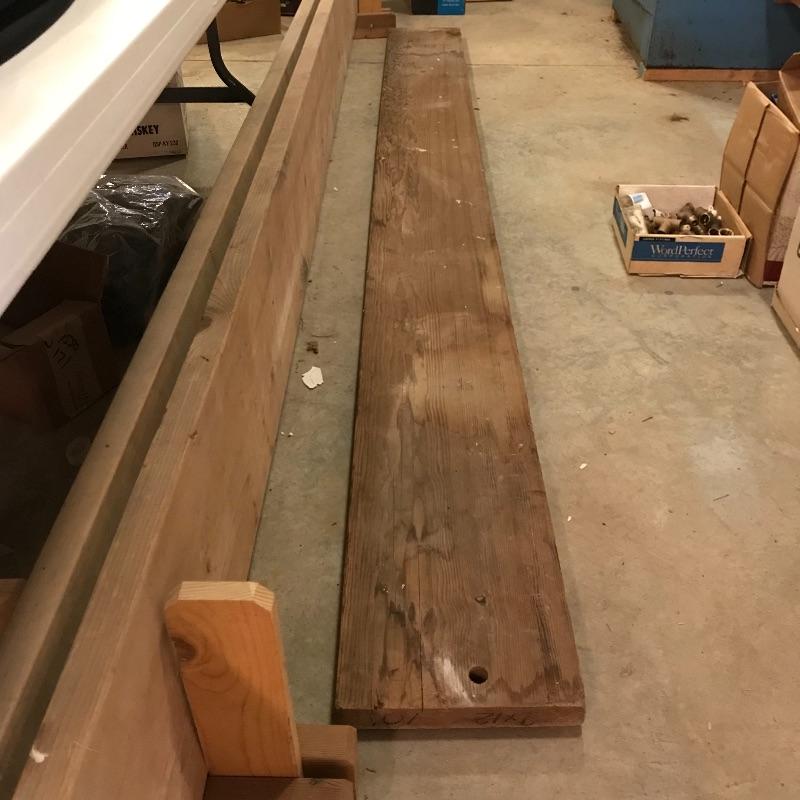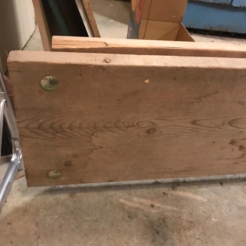 Two matching boards over fourteen foot long (11” x 168.75”) and one ten foot long (11” x 120”). Board appear treated and the long boards have hardware in place (see photos) the shorter bird is slightly darker and with one hole for hardware. Stands pictured with the longer boards are included in lot. No shipping.
