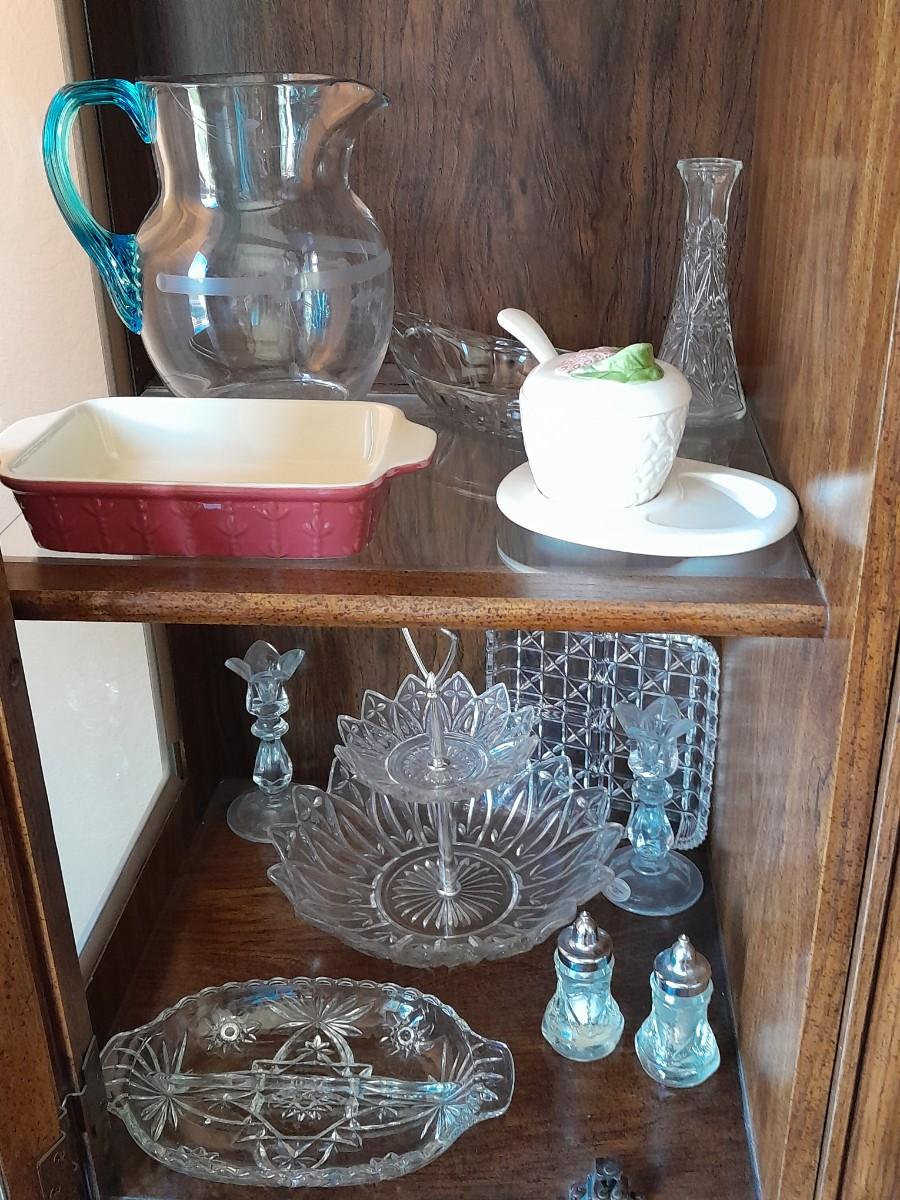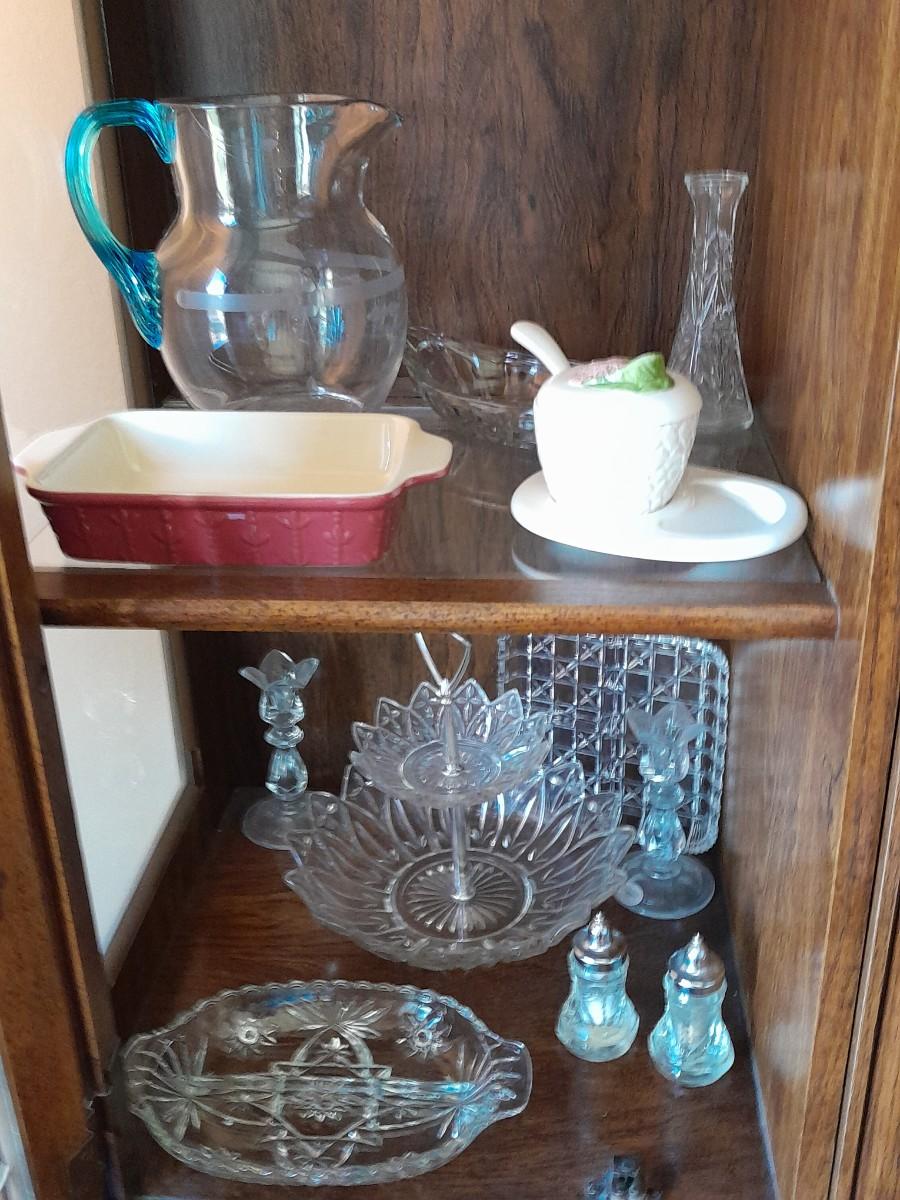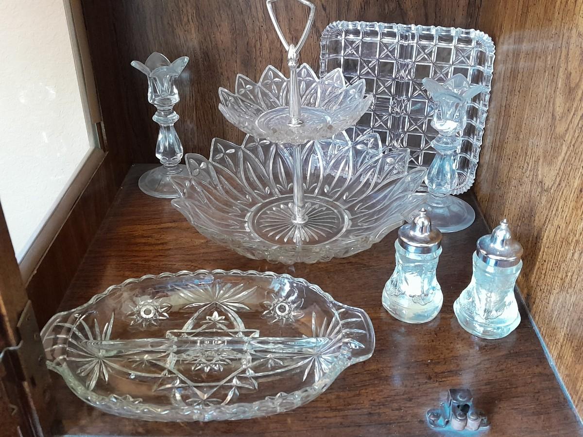 BEAUTIFUL PRESSED GLASS VASES, TWO-TIERED ORDOURVE DISH, SALT AND PEPPER SHAKERS, GLASS ETCHED PITCHER, AND OTHER KITCHENWARE.