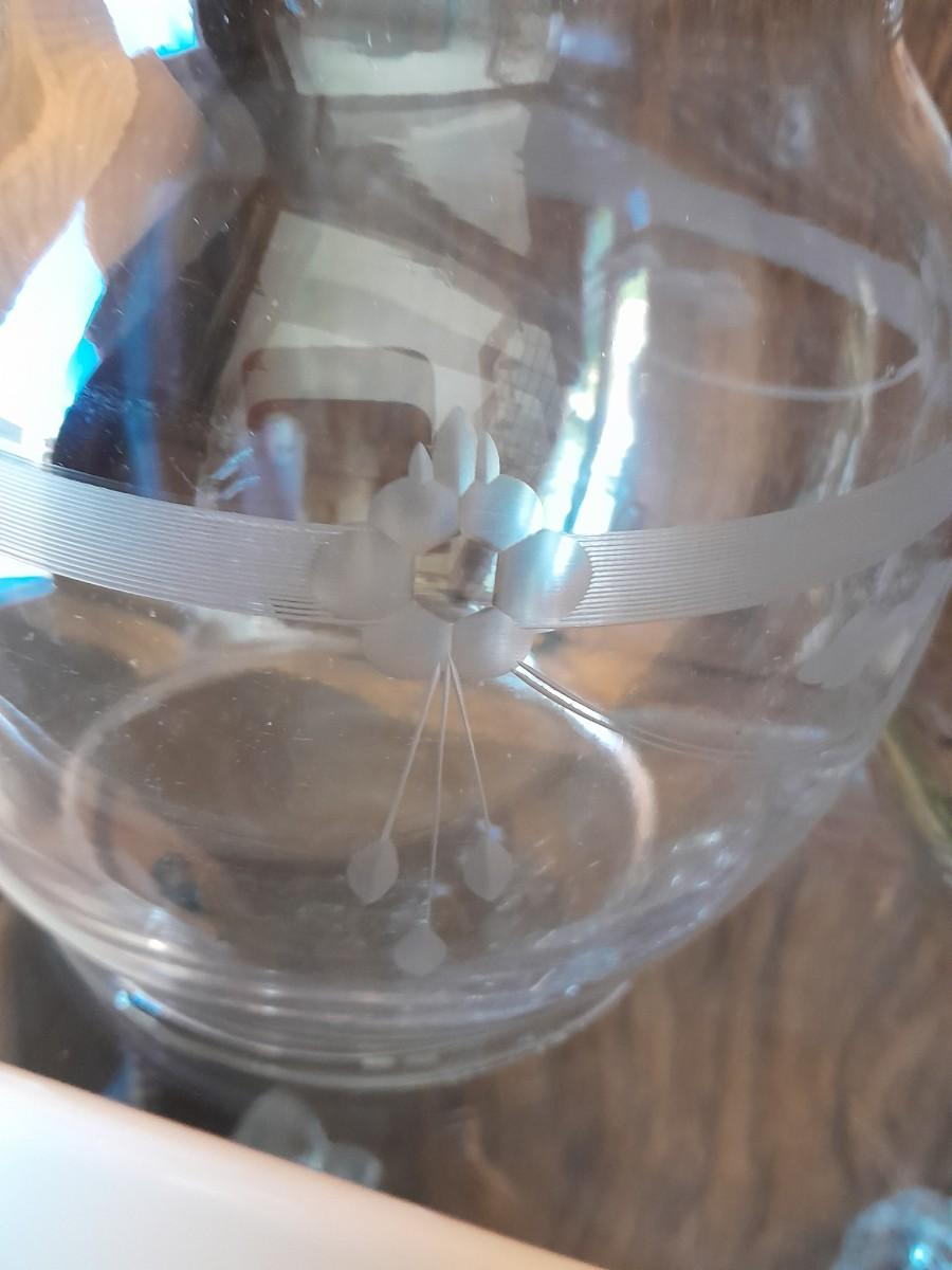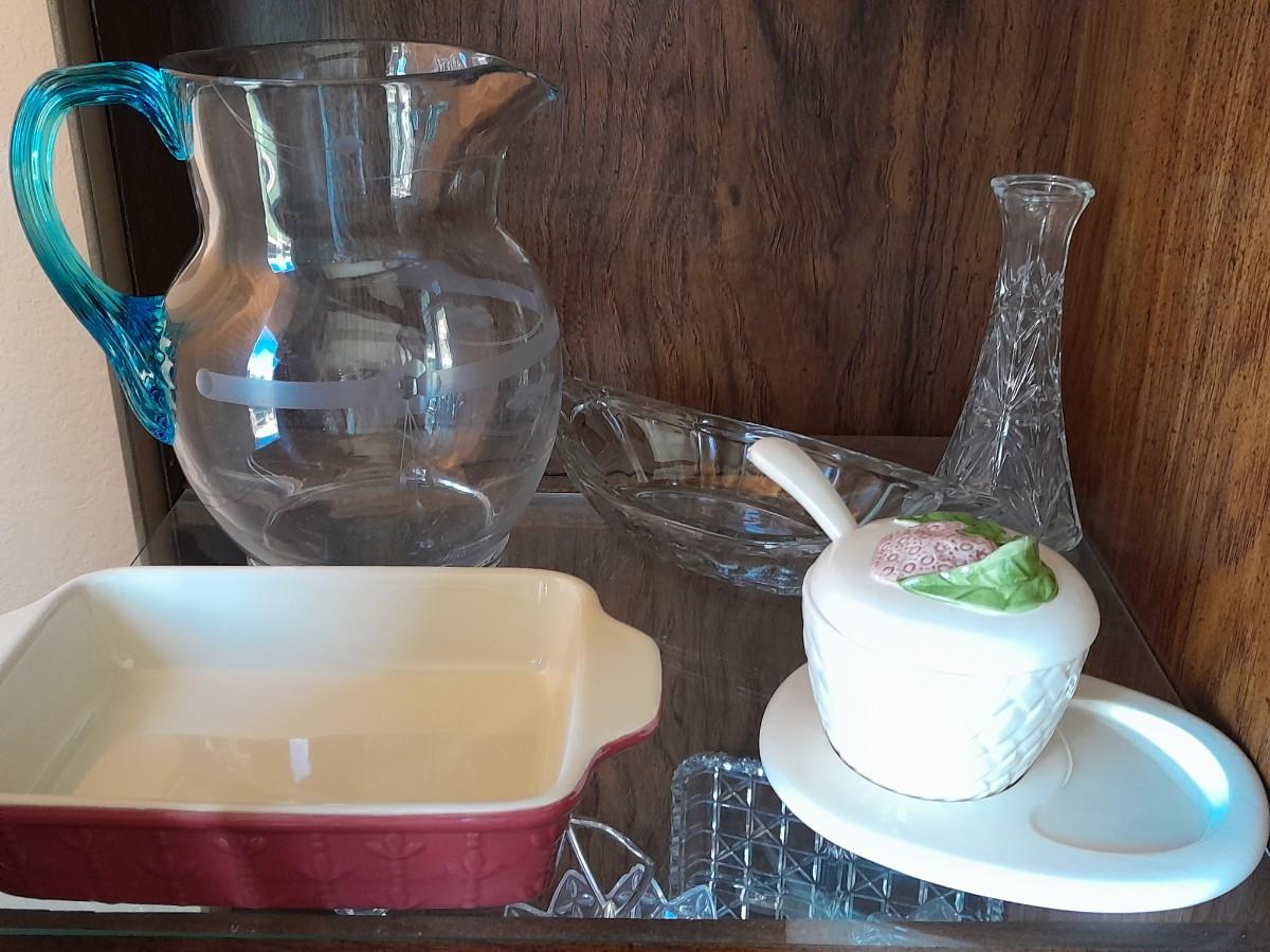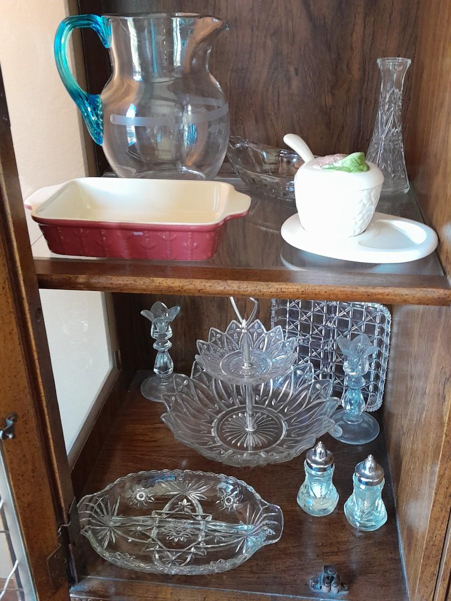 BEAUTIFUL PRESSED GLASS VASES, TWO-TIERED ORDOURVE DISH, SALT AND PEPPER SHAKERS, GLASS ETCHED PITCHER, AND OTHER KITCHENWARE.