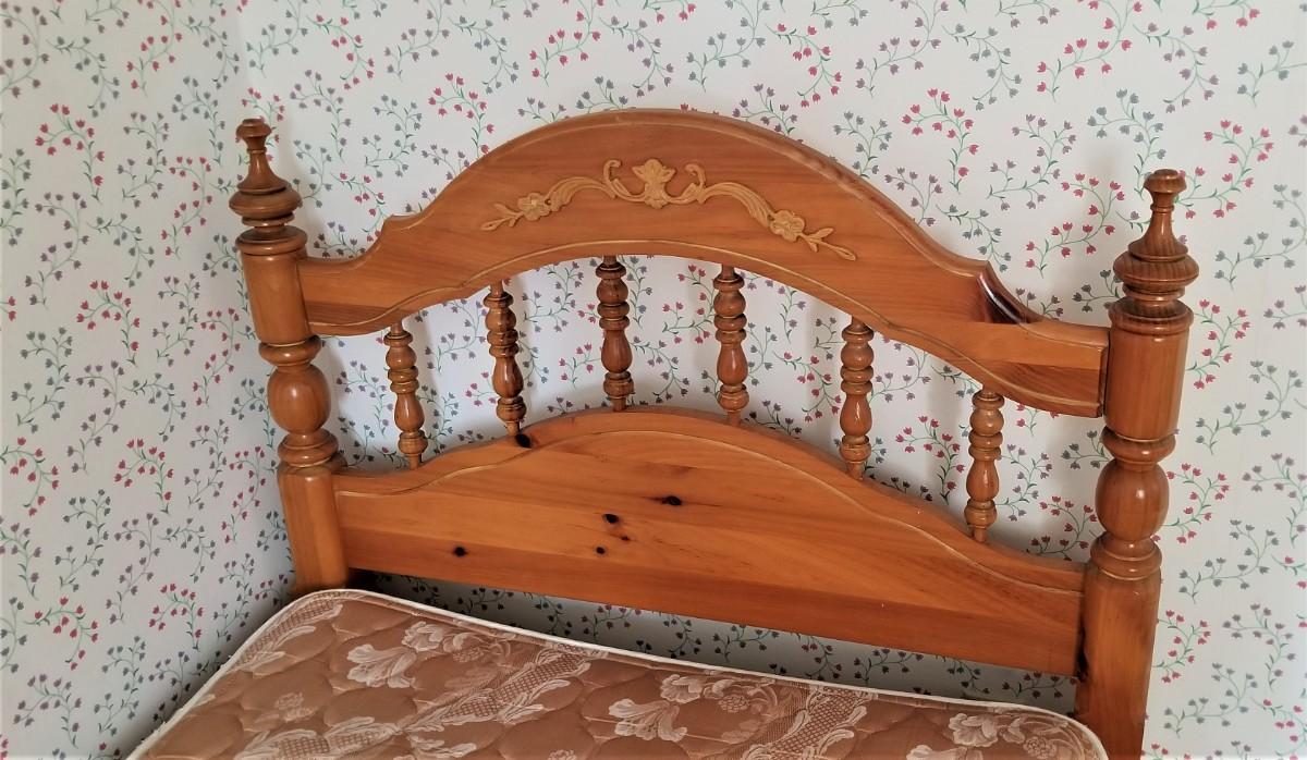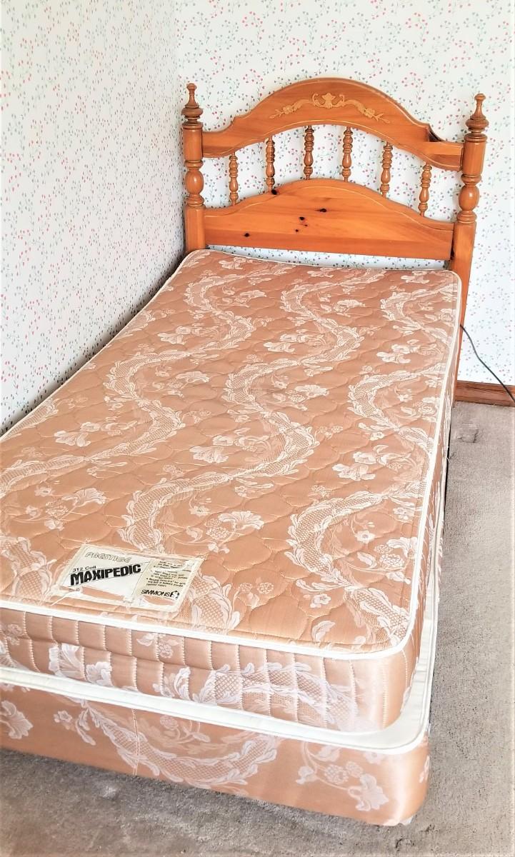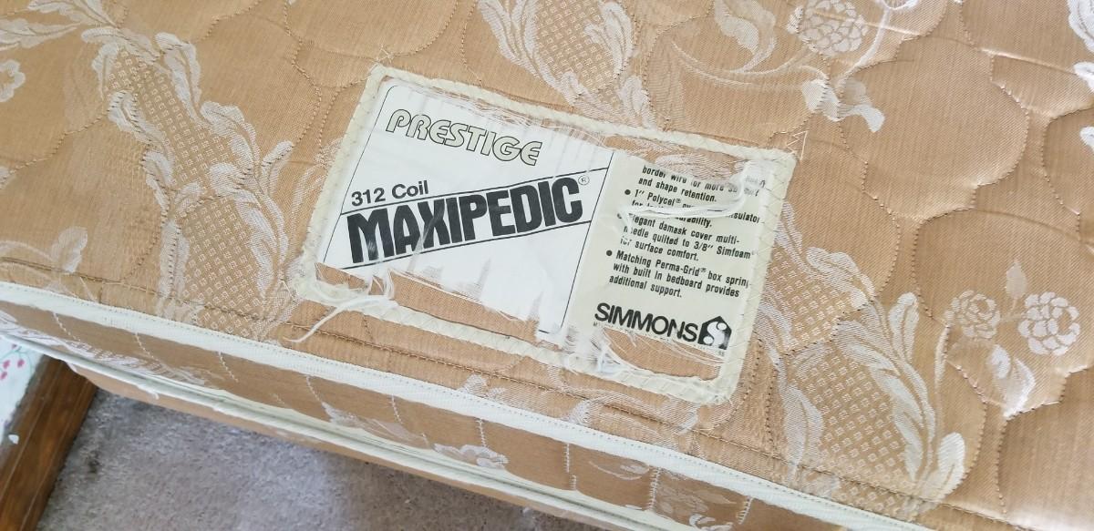 The final piece in this bedroom suite - Henry Link Furniture twin bed with headboard and rails. You also get the Maxipedic prestige mattress set (if you want it - you can leave it if you wish). Mattress is older, but clean. Headboard 38" across, 44" tall at tallest point. Great for a kid's room.