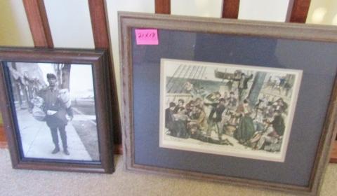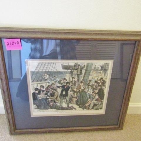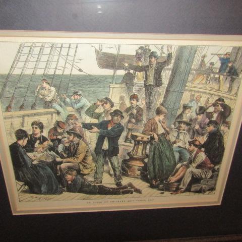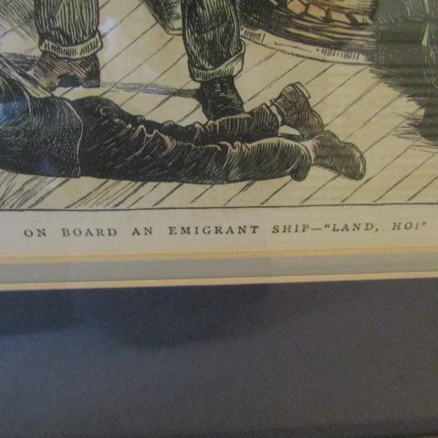 ANTIQUARIAN NEWSPRINT CIRCA 1875 "ONBOARD AN EMIGRANT SHIP, LAND HOI" MEASURES 21" X 18"