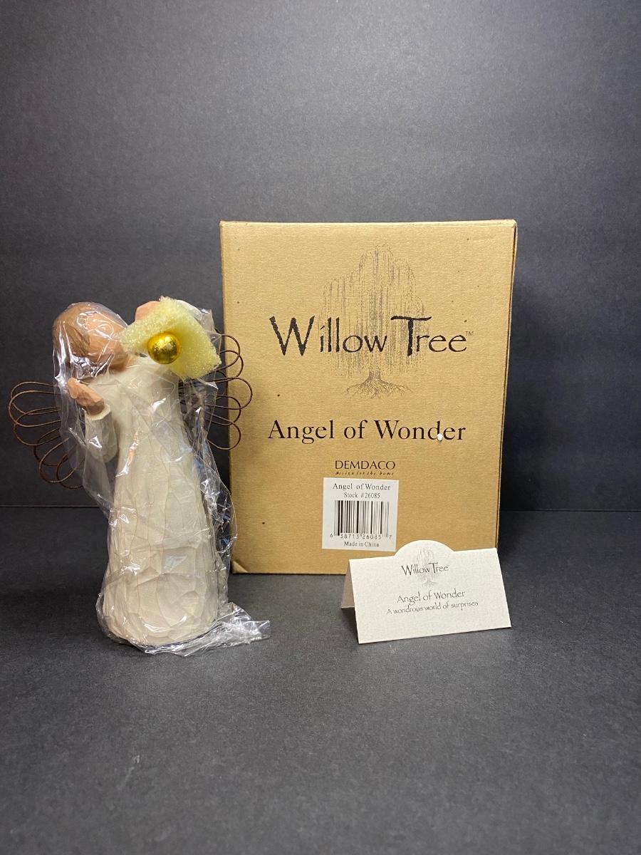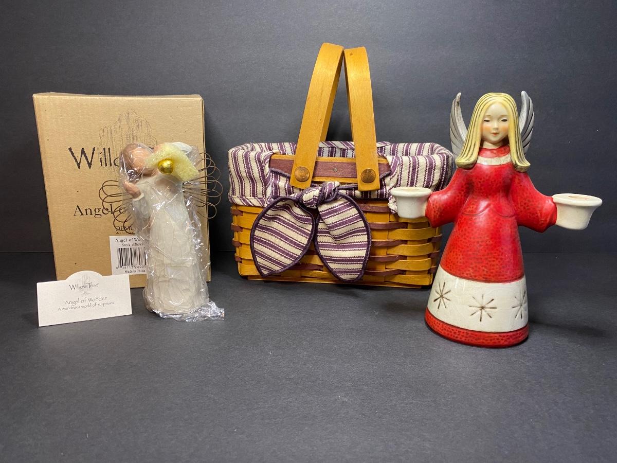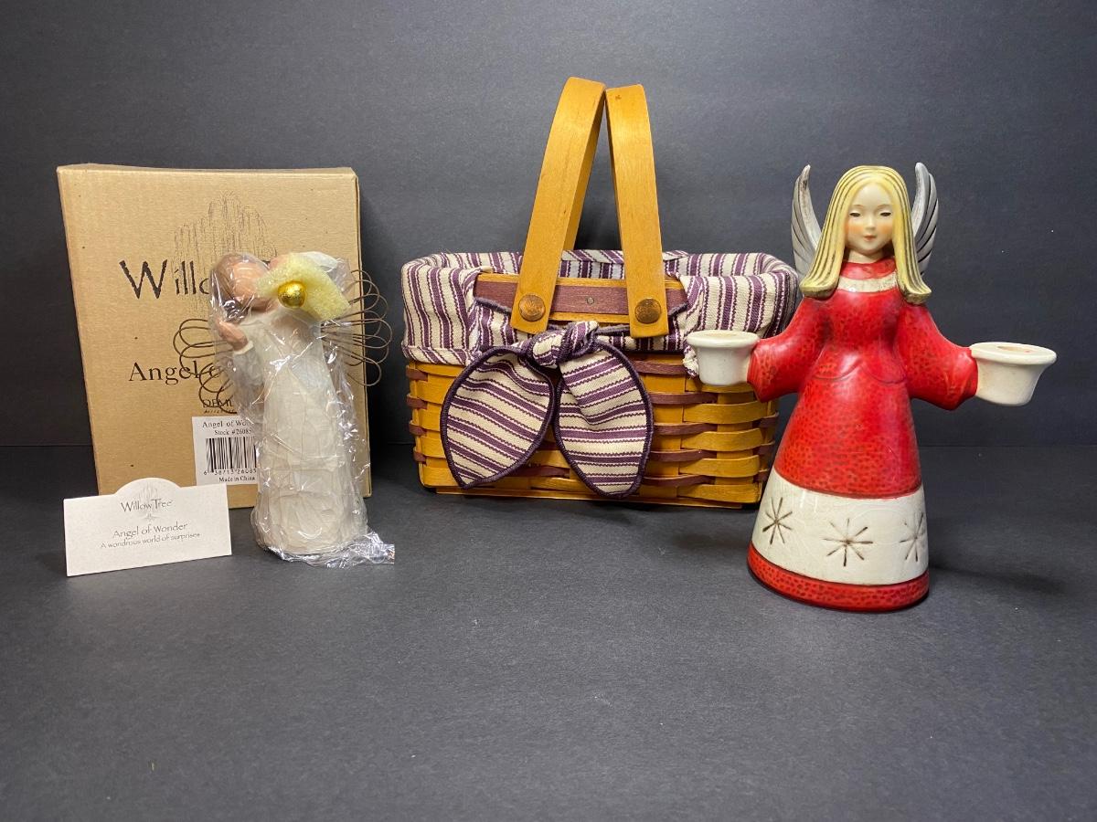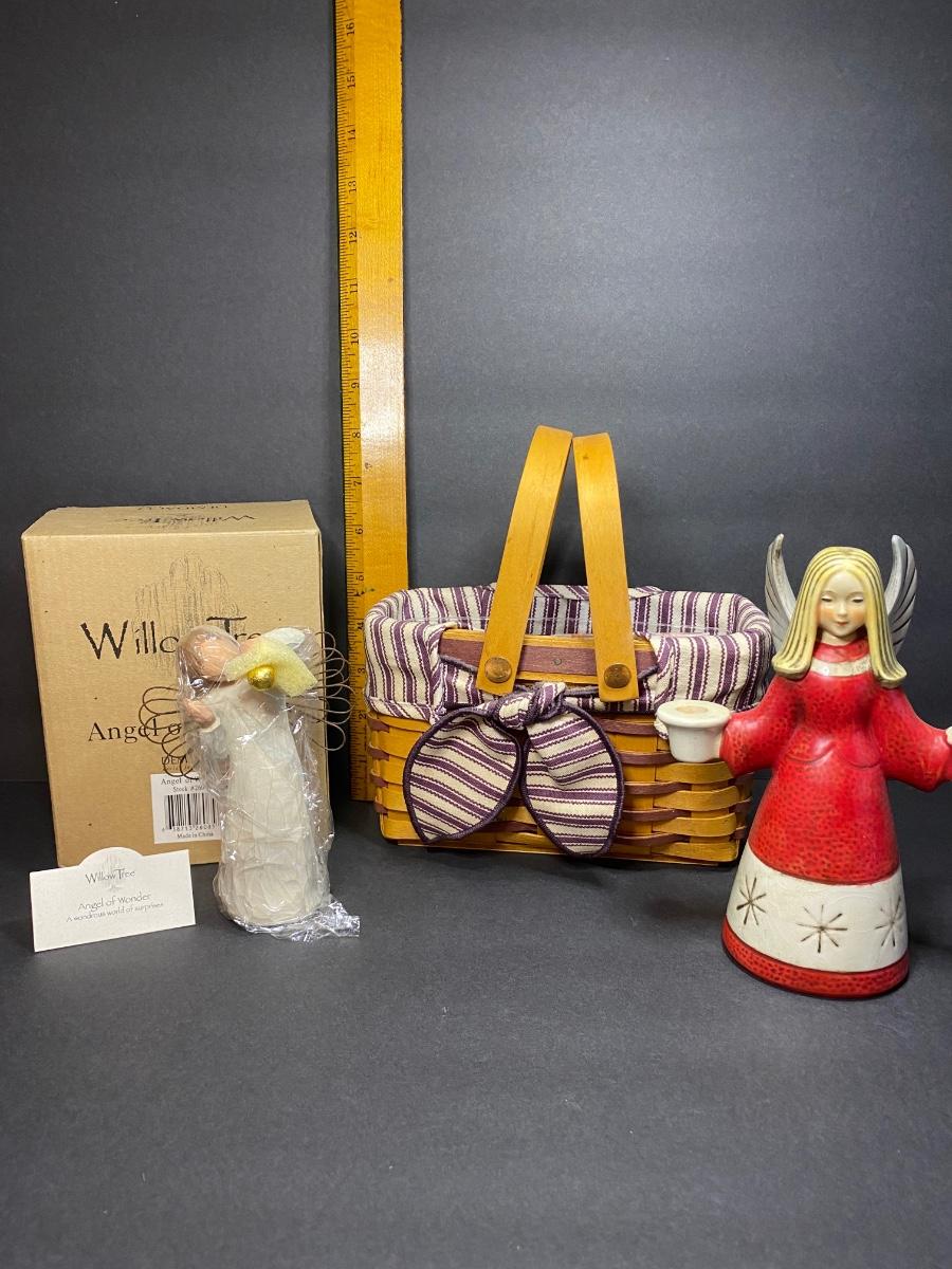 Longaberger basket, Goebel angel candle holder and angels of wonder Willow Tree.