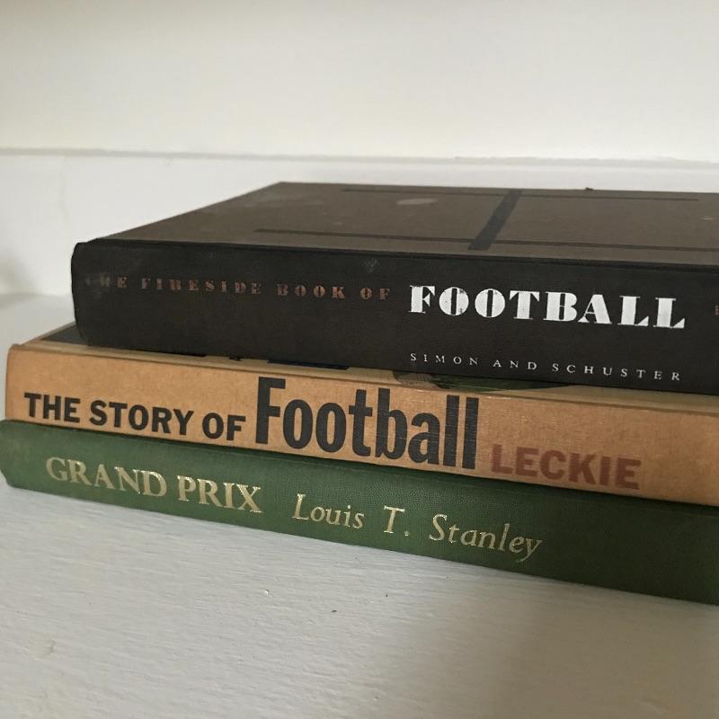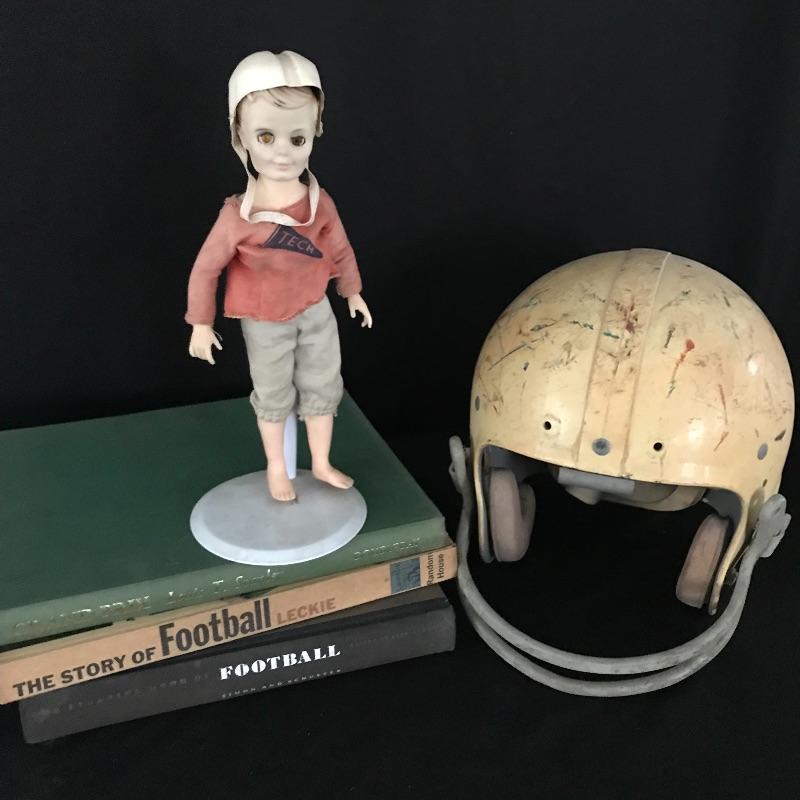 Lot contains fun football collectibles uncluding antique helmet, three antique books, and antique Uneeda “Bob” Teenage Boy Doll. Doll is approx. 10.5” tall. We threw in a Grand Prix book in the mix. See pics. Shipping available.