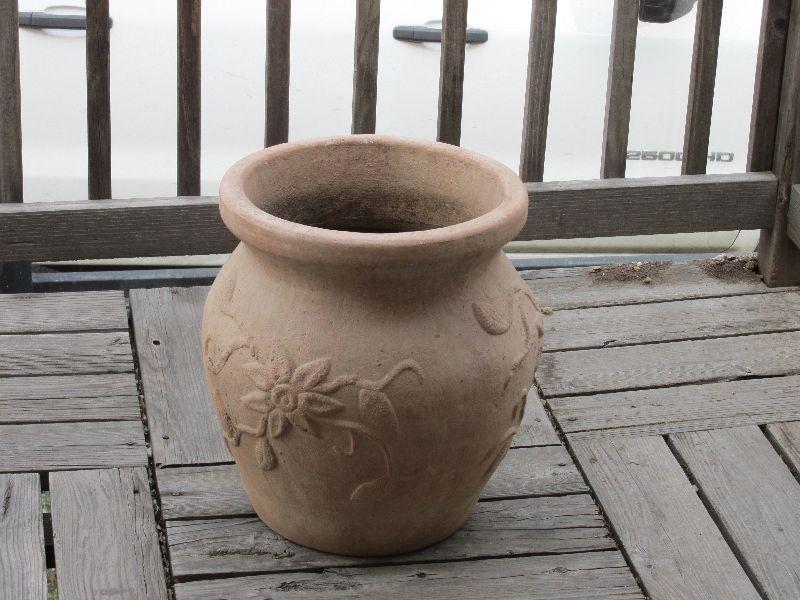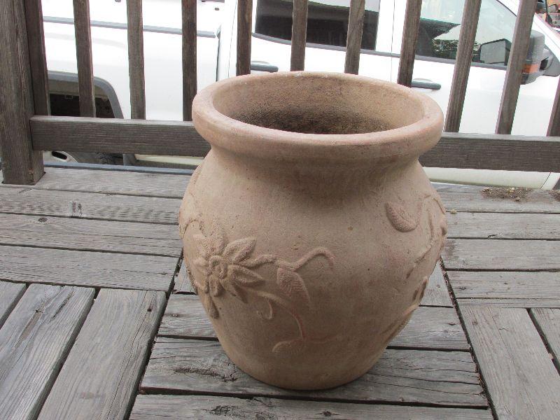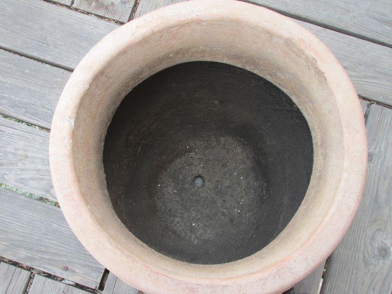 Very large ceramic pot. Very heavy. Must be about 50-60 lbs or more. Was previously used for tomato plants.