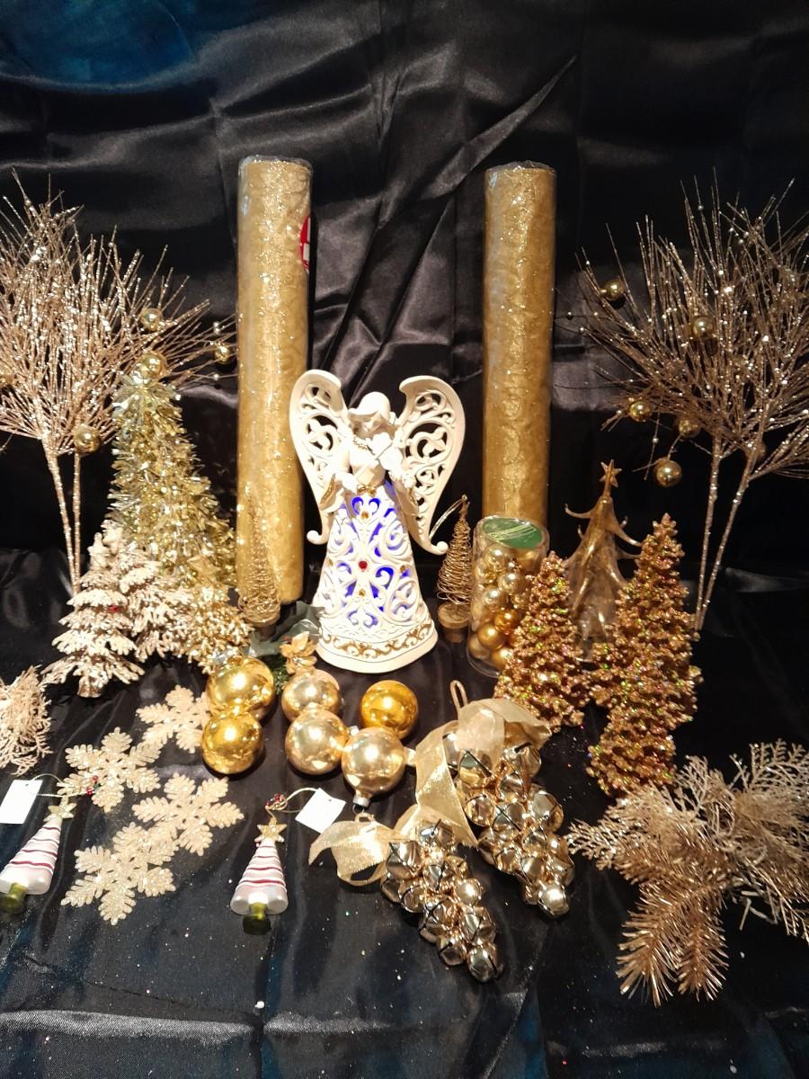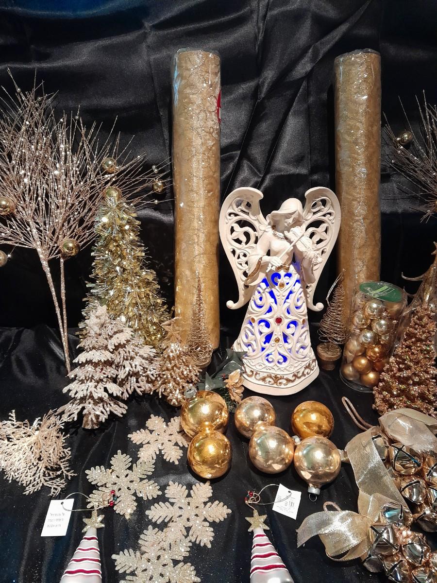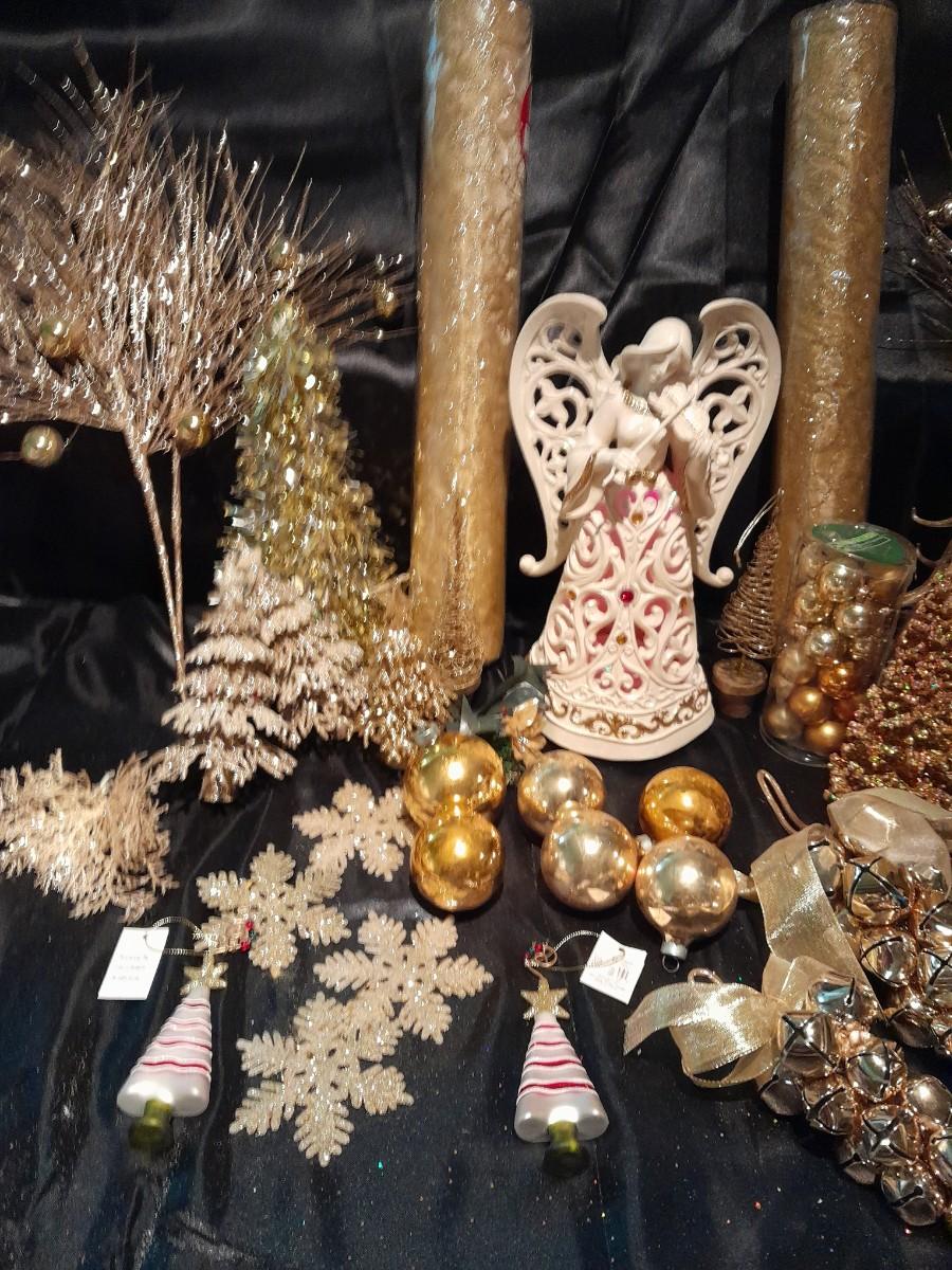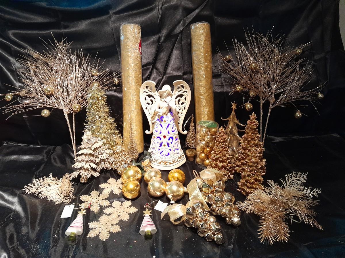 LOT 215 GOLD THEMED CHRISTMAS DECORATIONS WITH LIGHT CHANGING ANGEL