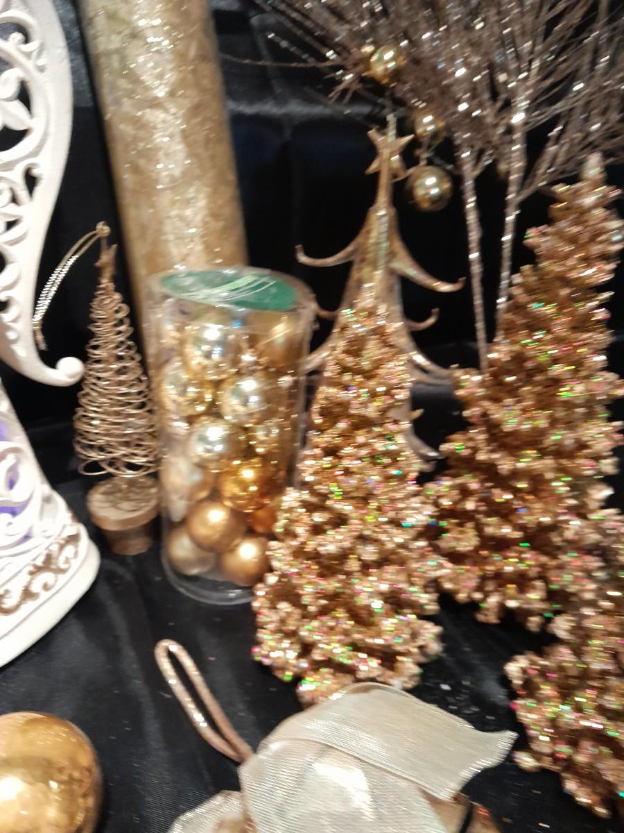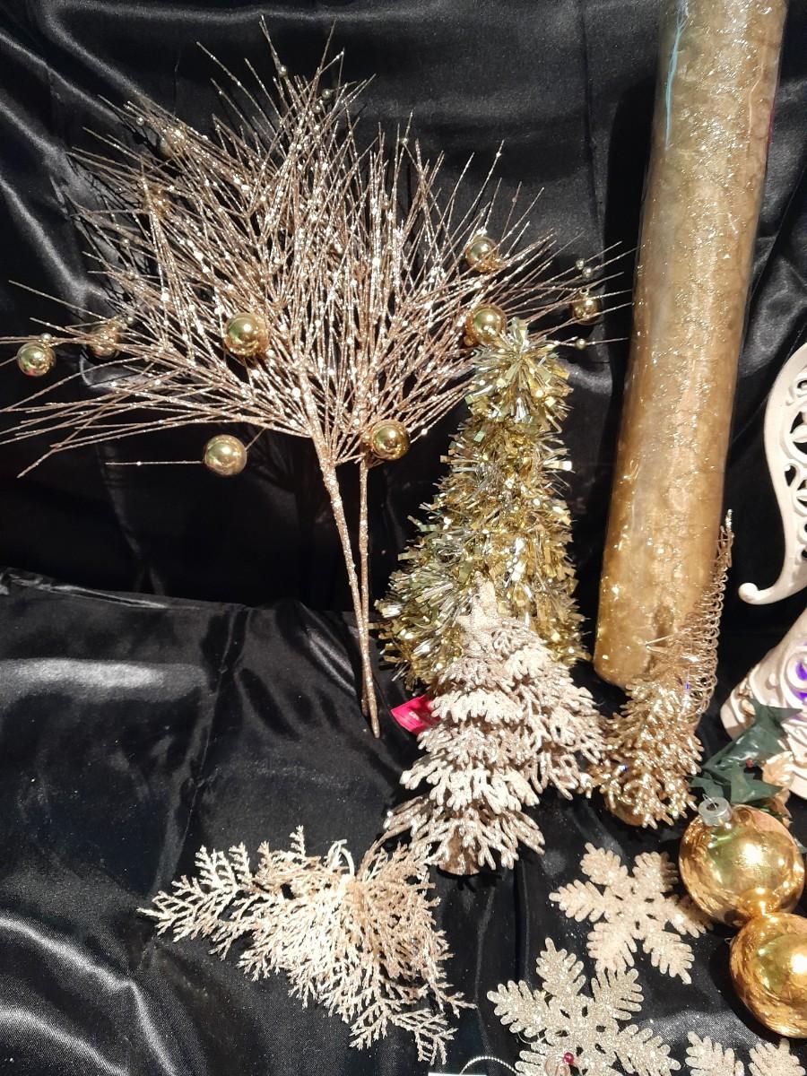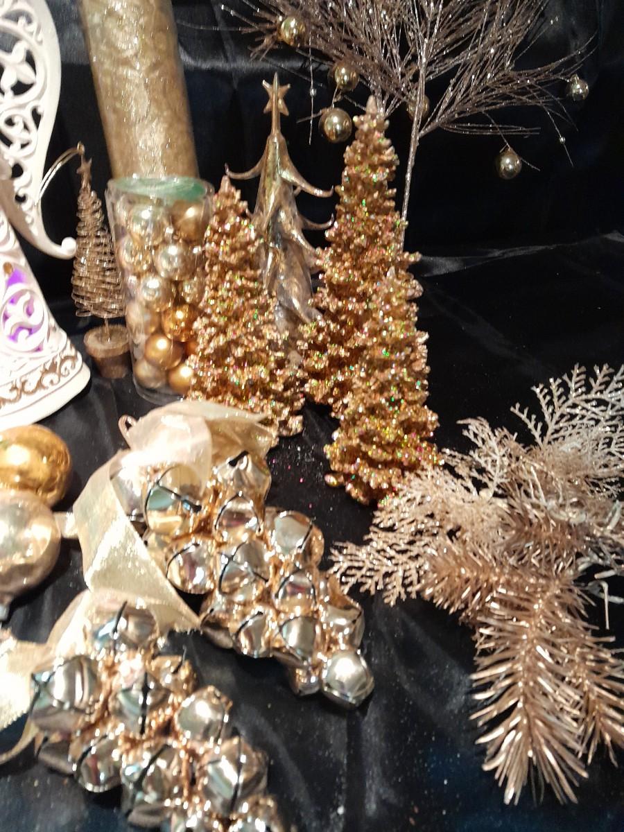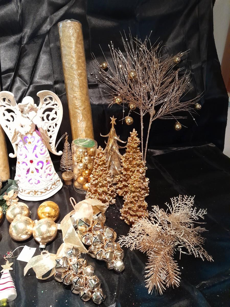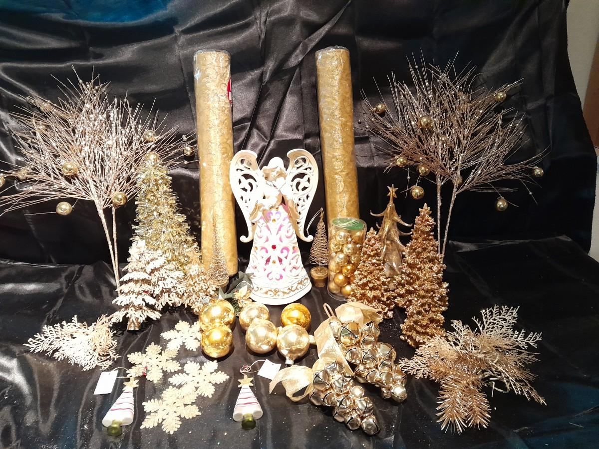 LOT 215 GOLD THEMED CHRISTMAS DECORATIONS WITH LIGHT CHANGING ANGEL