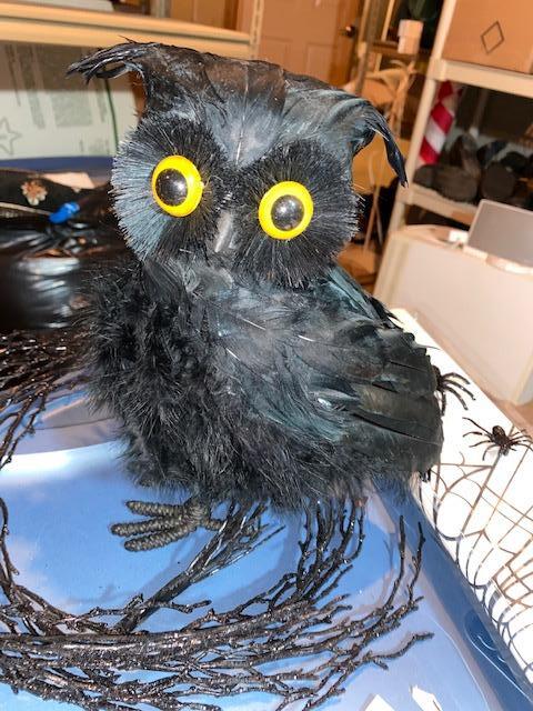Black owl, glitter ornaments,large stick on spiderwebs, black glitter stick looking garland