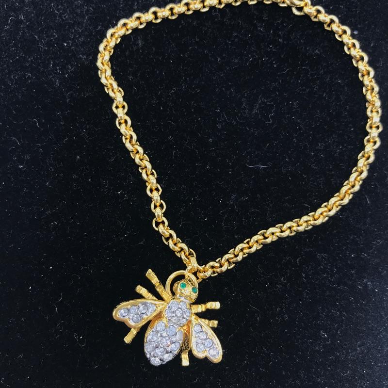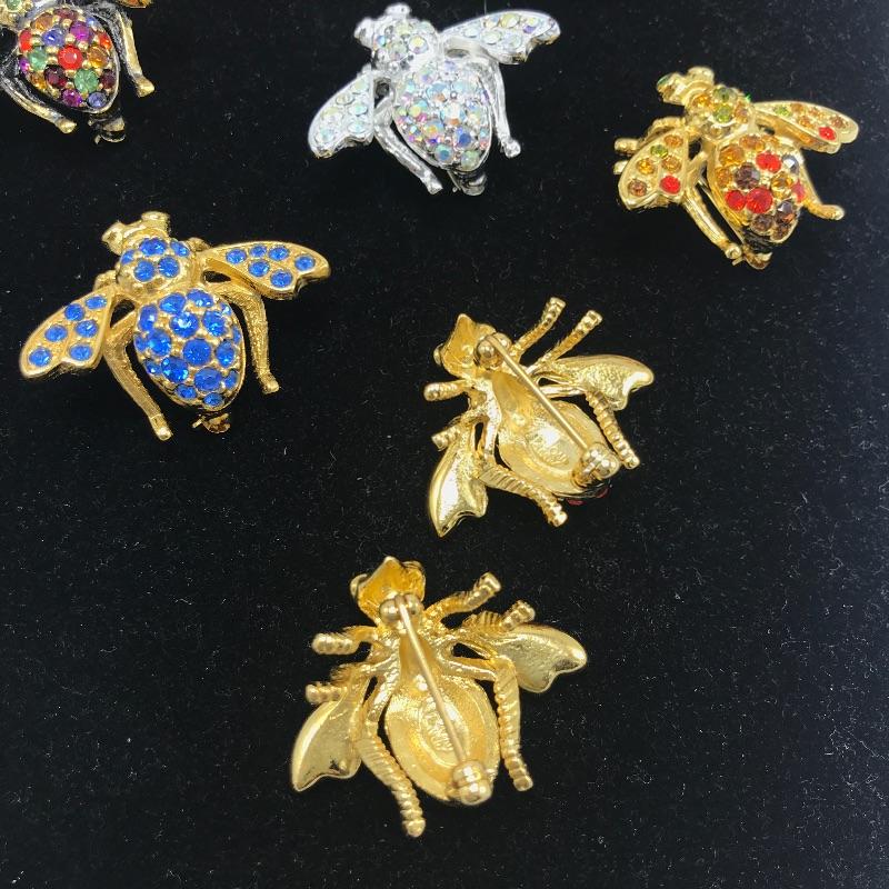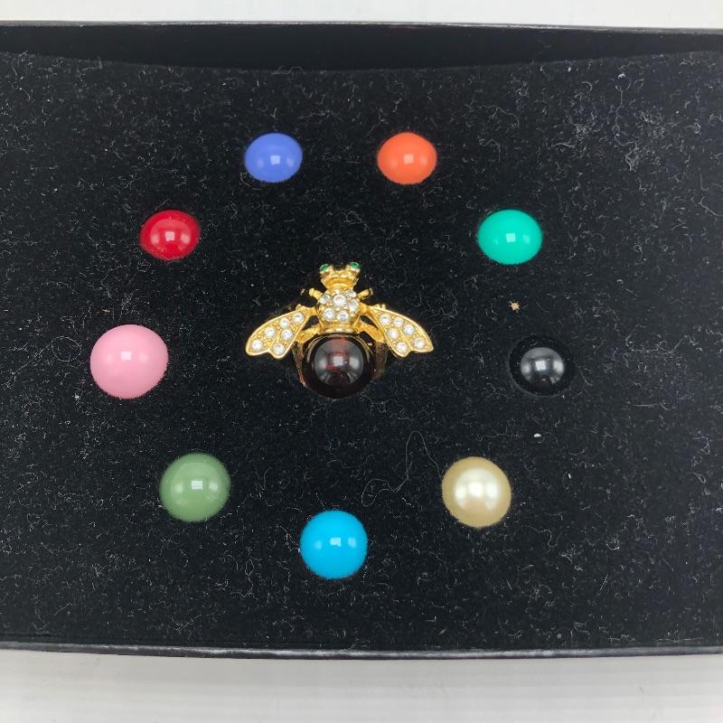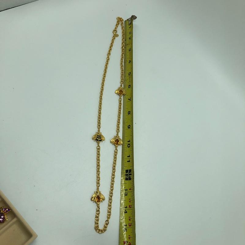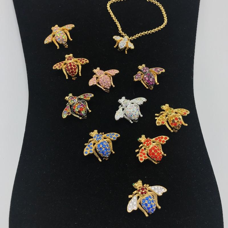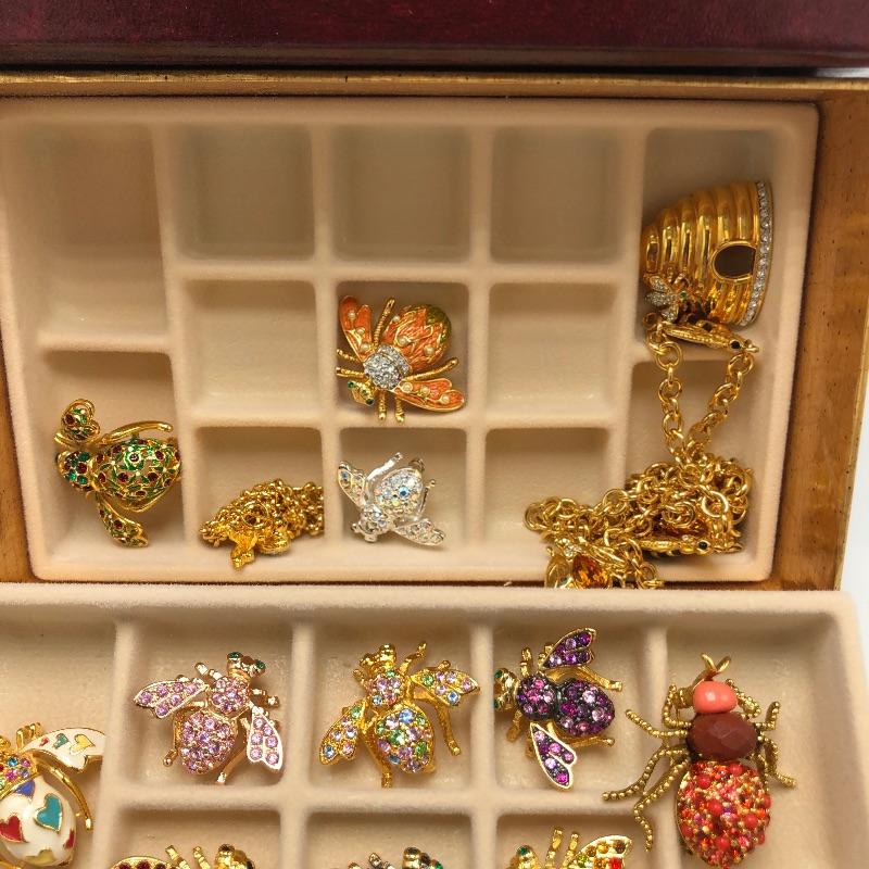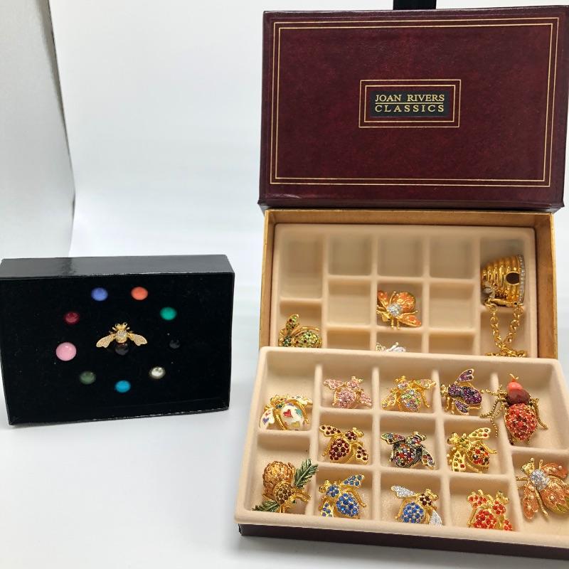 Sparkling and dazzling, this superb Bee collection by Joan Rivers contains one necklace, a bracelet and nineteen bee pin brooches. This includes one bee that has ten interchangeable color choices for the bee’s abdomen. Pieces come in a Joan Rivers Classic two shelf case.