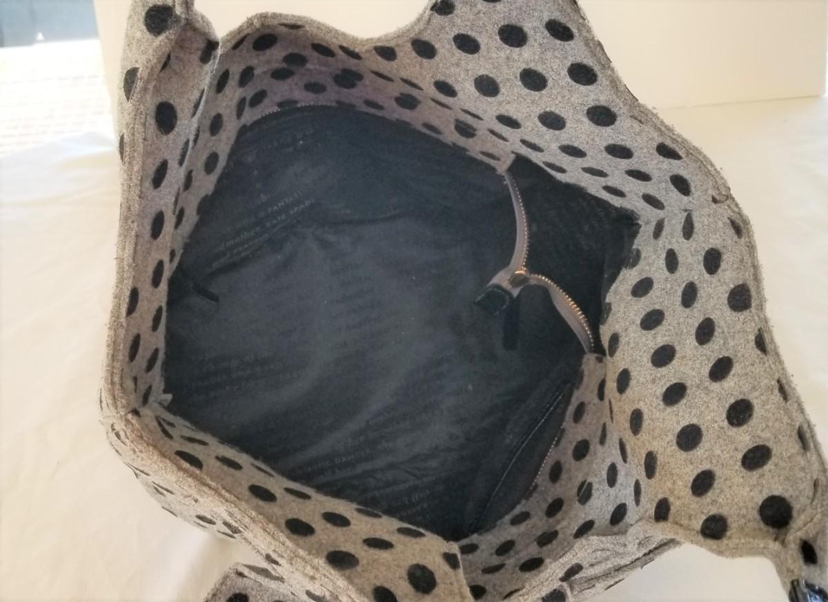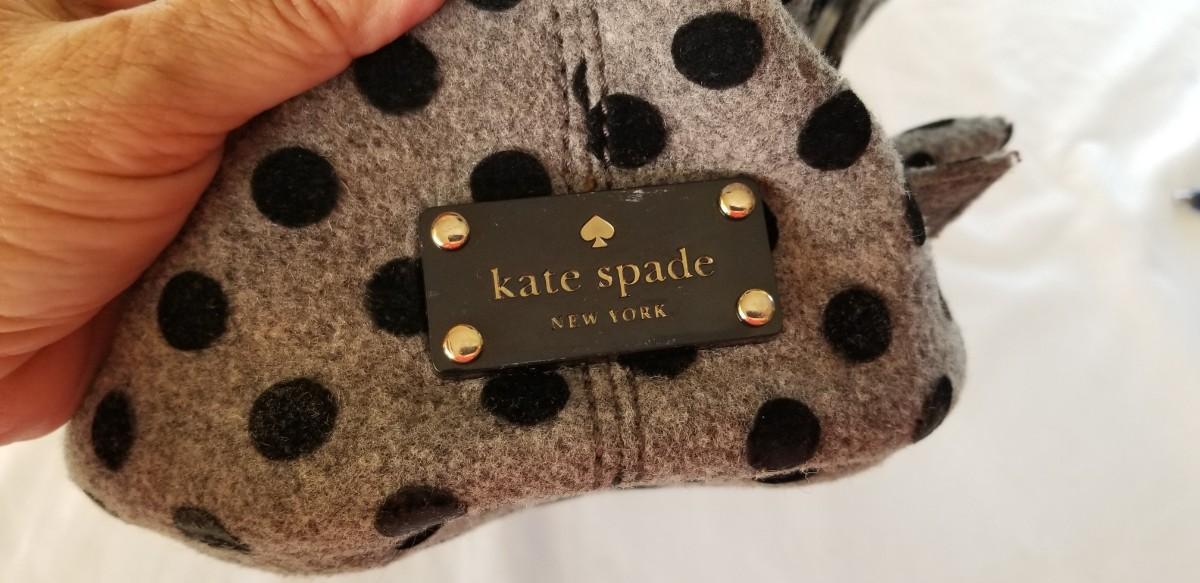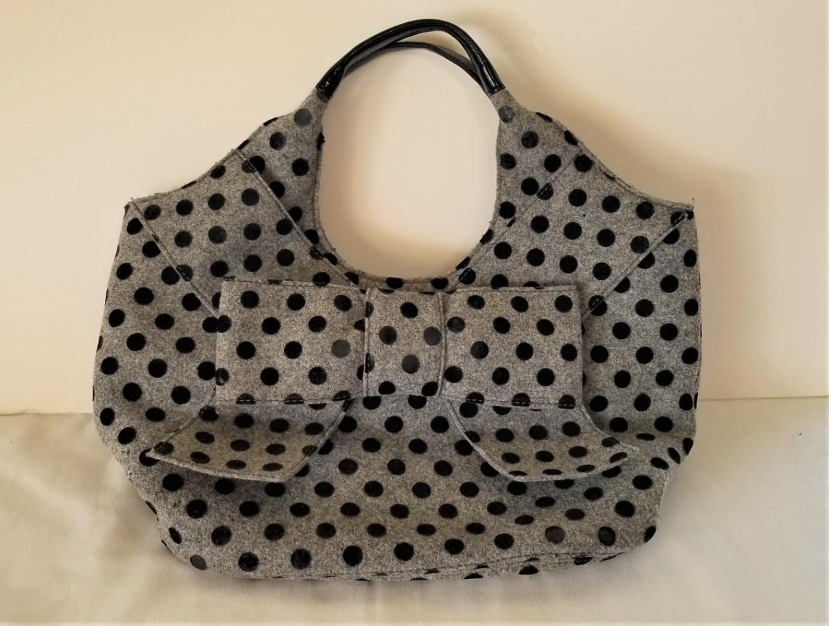 Cute Fall/Winter KATE SPADE handbag with her signature bow. Gently used - clean. Black polka dots on Grey wool. 17" across, 17" tall.