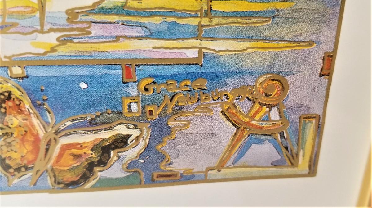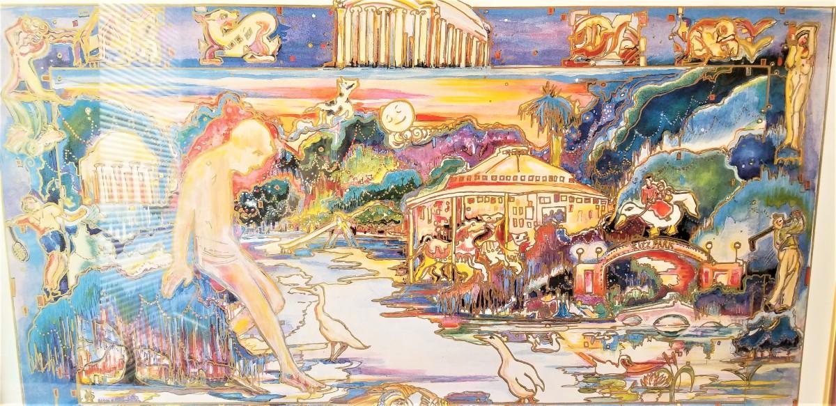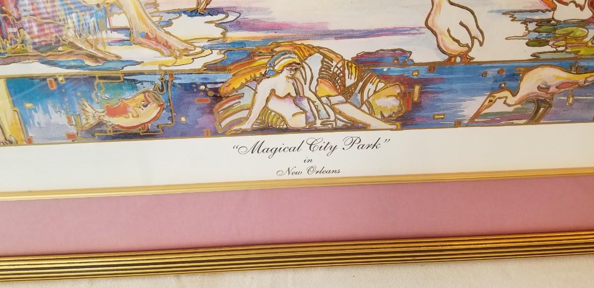 Framed print by New Orleans artist Grace Newburgge "Magical City Park" (New Orleans). 28.5" across, 20.75" tall. Good condition. This print was sold as a fundraiser by the Friends of City Park.