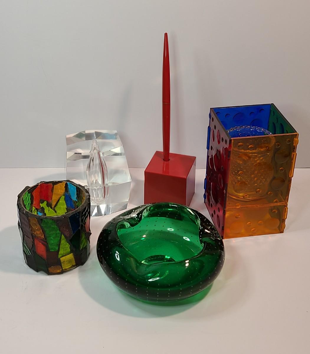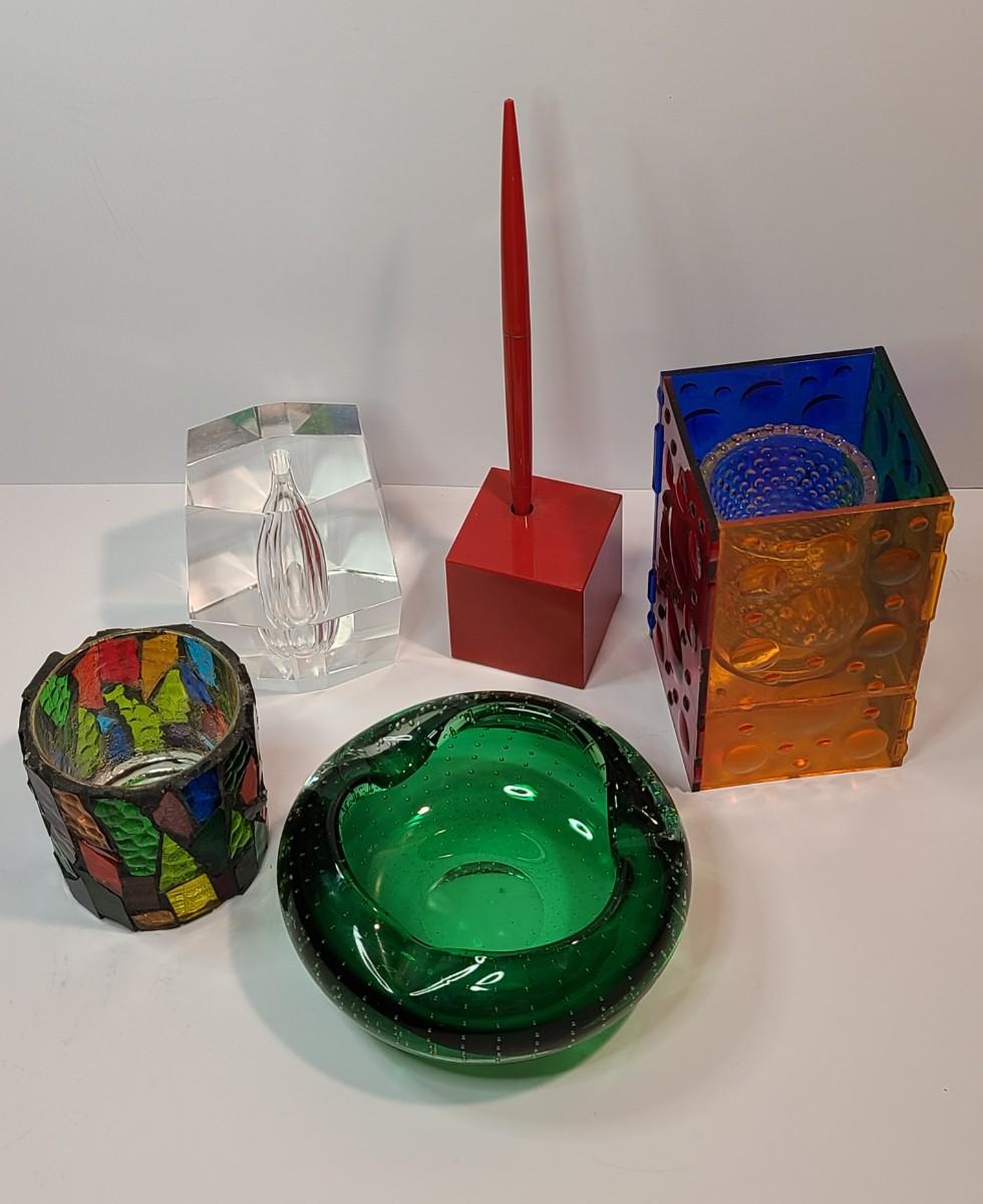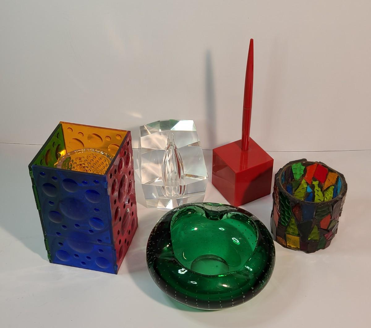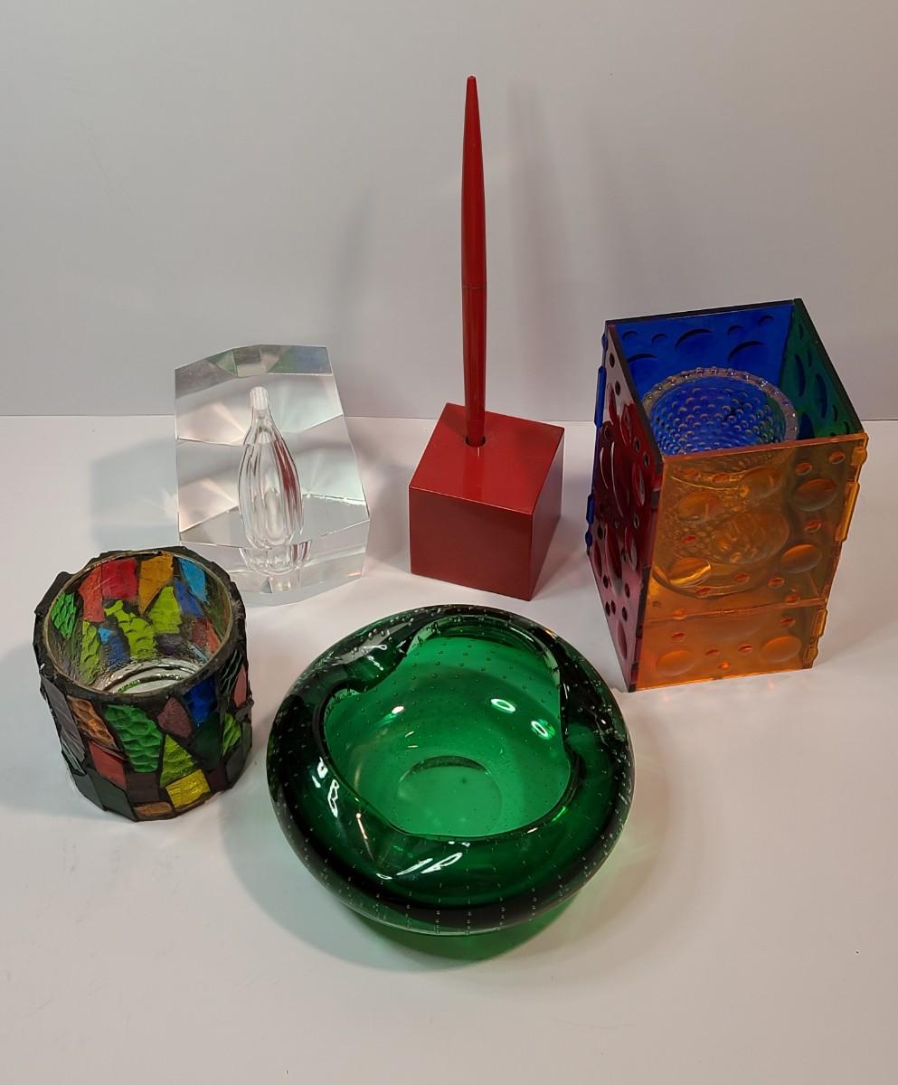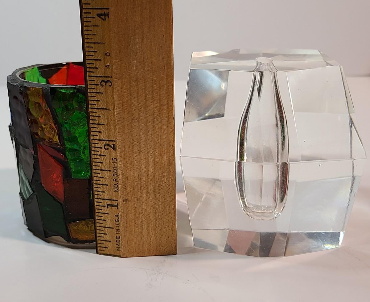 Vintage MCM votive holders, one is like stained glass mosaic around, and the other is a plastic cube that glows through when lit. Also included is a glass paperweight that can hold pen or flower stem, and green bubble art glass bowl. Fun lot of vintage decor. Please see all pictures as they are the best representation of the items. The pictures show condition, measurements if taken, and what is included in the lot. Due to the large amount that we photograph and the time frame, we are not always able to take measurements. All items unless noted, are pre-owned and have been used. If you purchased furniture, you must bring help. We do not allow one person to carry large furniture out on their own. Bring help, tools and a truck for the safety of our client’s homes, and your personal safety. Company policy. Thank you.