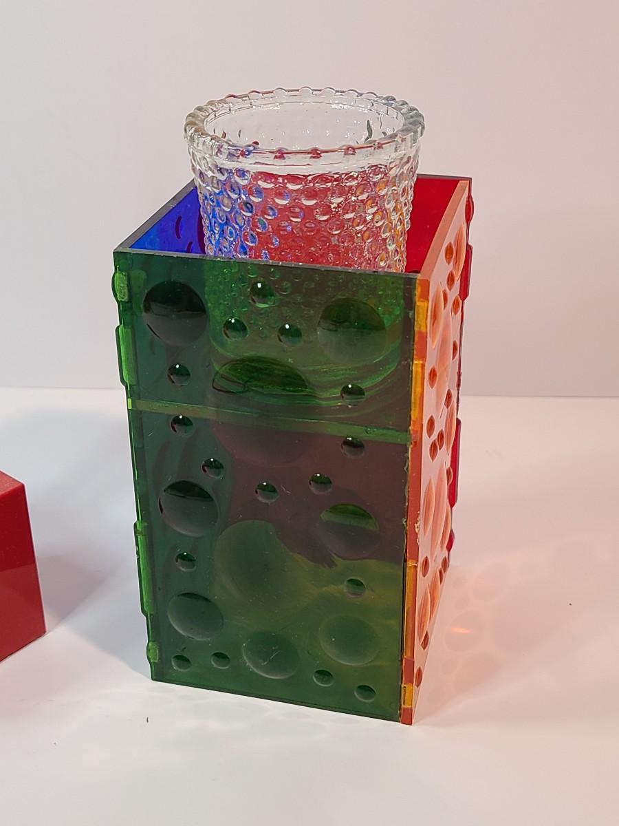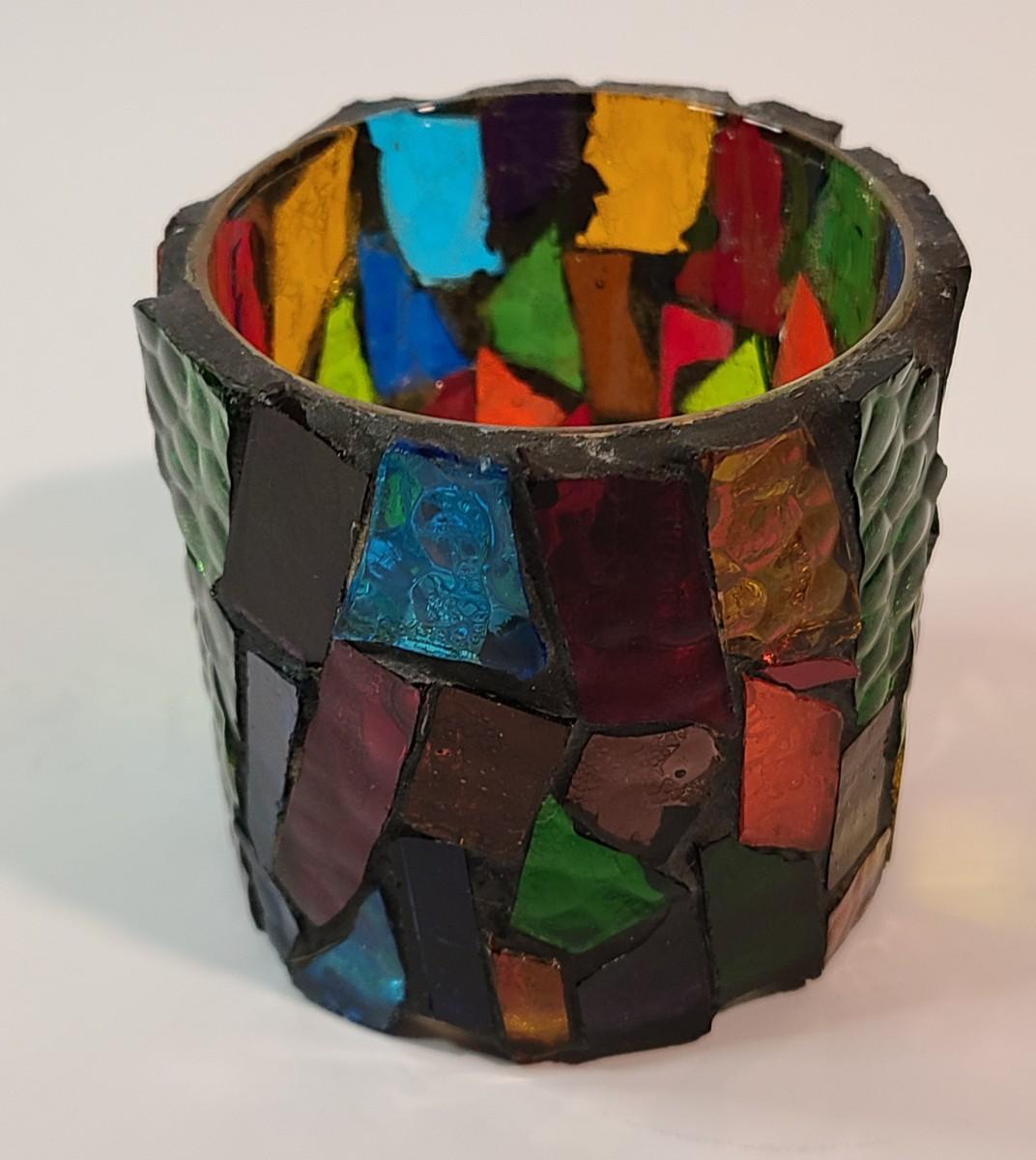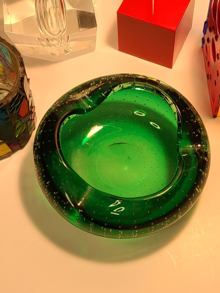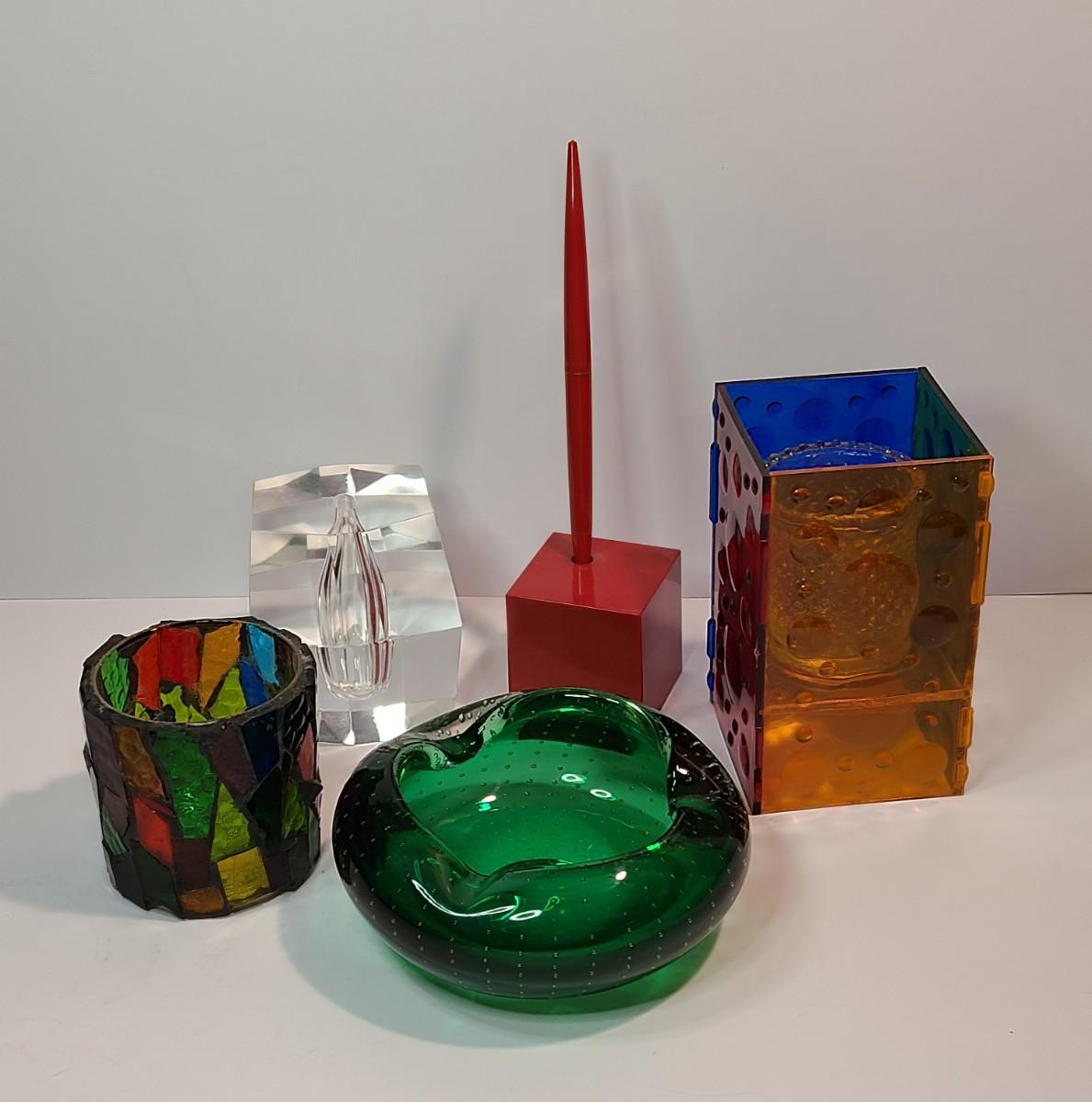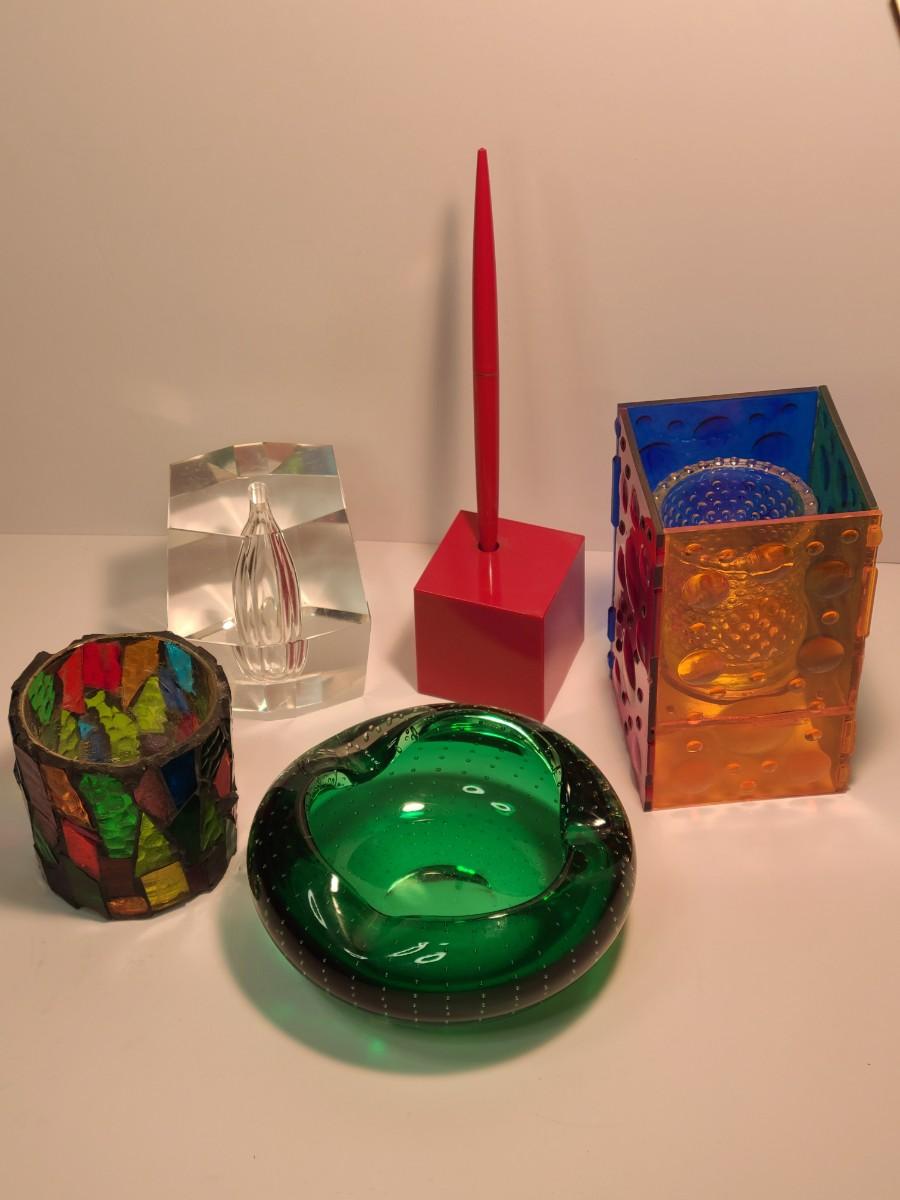 Vintage MCM votive holders, one is like stained glass mosaic around, and the other is a plastic cube that glows through when lit. Also included is a glass paperweight that can hold pen or flower stem, and green bubble art glass bowl. Fun lot of vintage decor. Please see all pictures as they are the best representation of the items. The pictures show condition, measurements if taken, and what is included in the lot. Due to the large amount that we photograph and the time frame, we are not always able to take measurements. All items unless noted, are pre-owned and have been used. If you purchased furniture, you must bring help. We do not allow one person to carry large furniture out on their own. Bring help, tools and a truck for the safety of our client’s homes, and your personal safety. Company policy. Thank you.