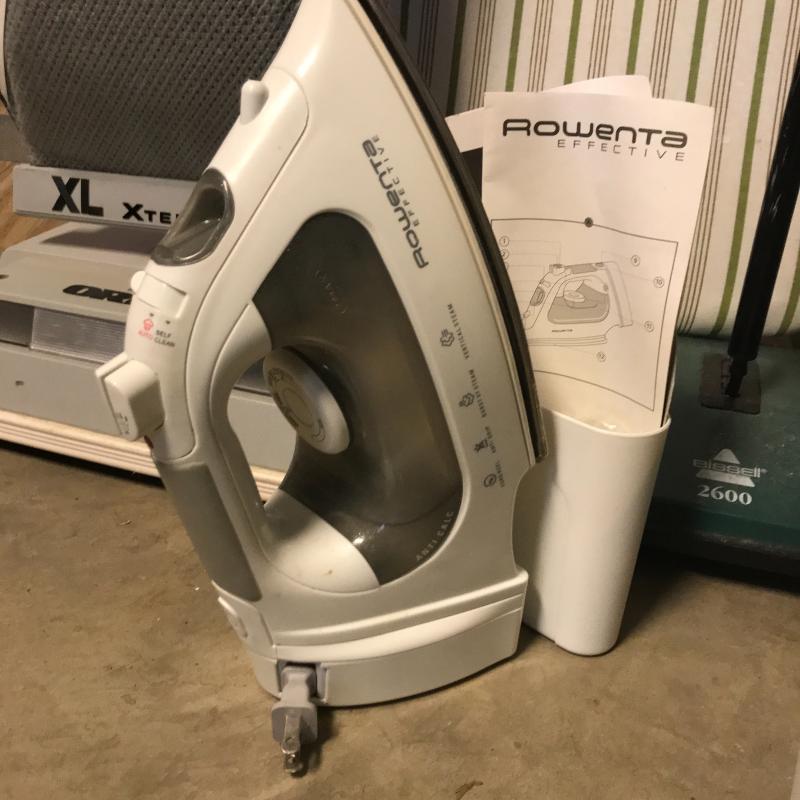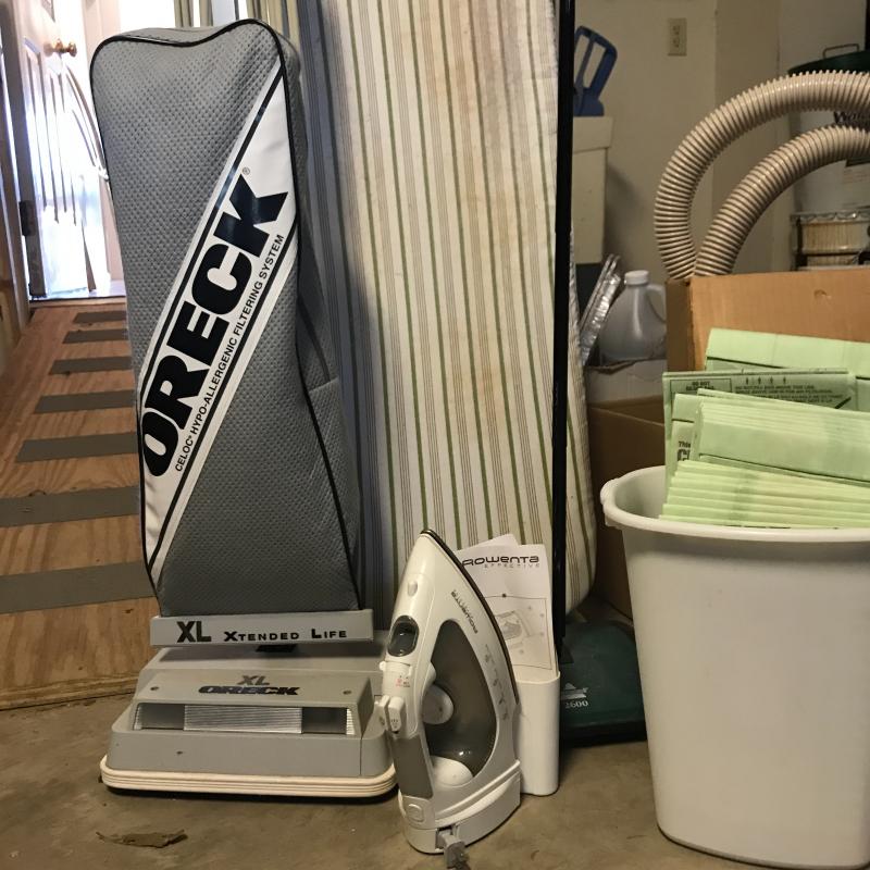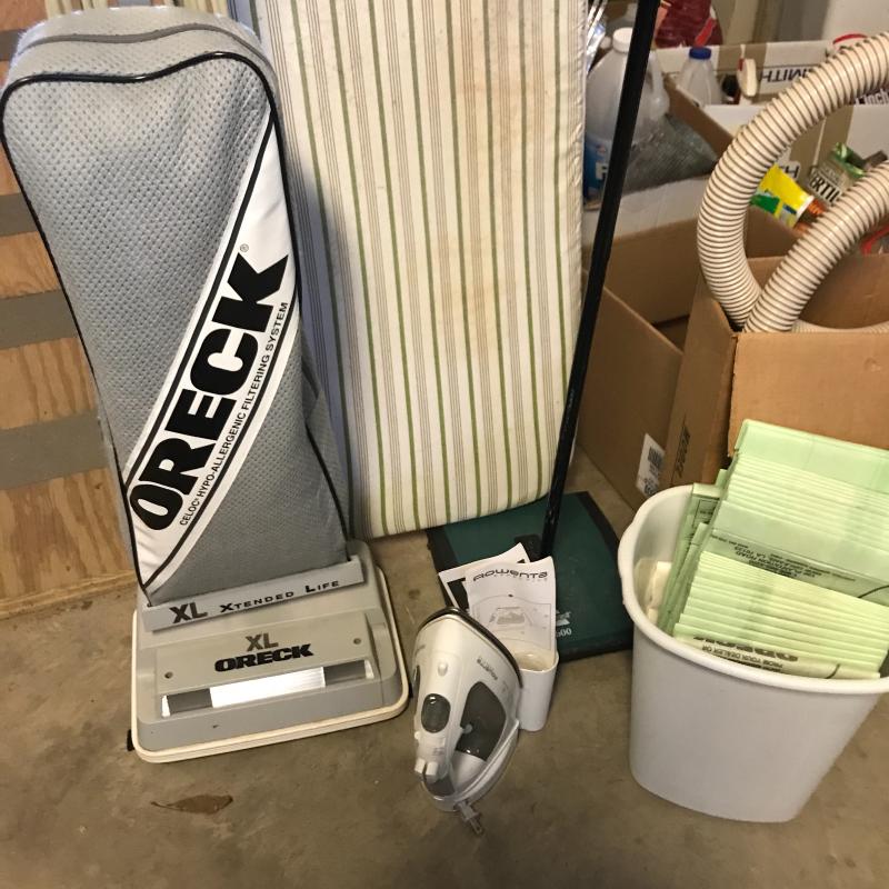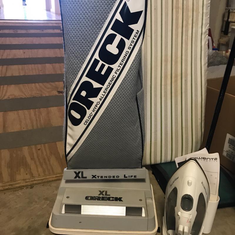 Oreck XL Xtended Life vacuum with attachments and plenty of replacement bags. Bissell 2600 rolling sweeper. Folding ironing board. Rowenta Effective Iron with retractable cord. No shipping. Local pick up in Asheville, NC only.