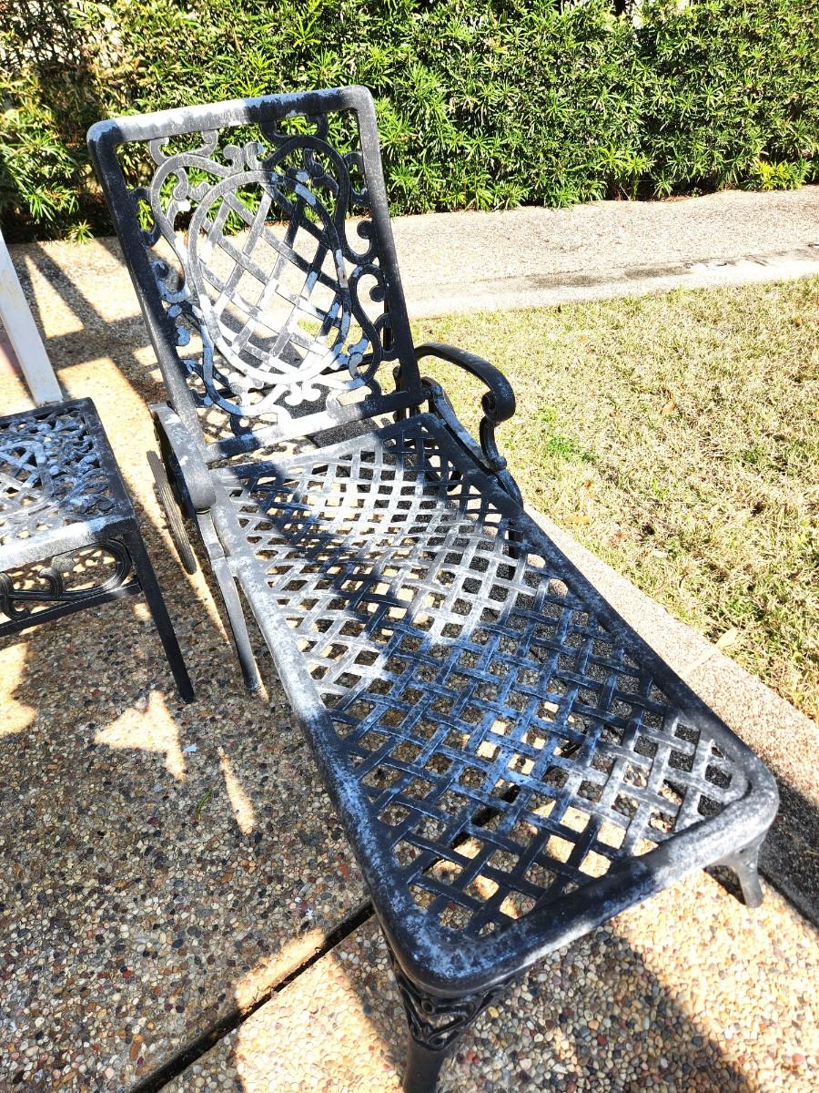 Pair of vintage metal patio loungers with matching center table - adjustable backs and wheels for moving. Each 55" long. Table is 17" x 17". Outdoor cushions in good condition.