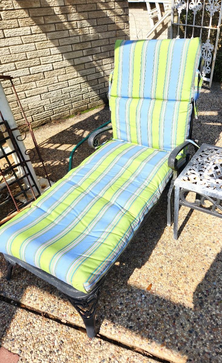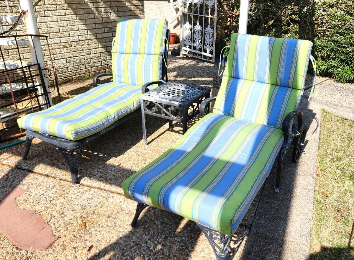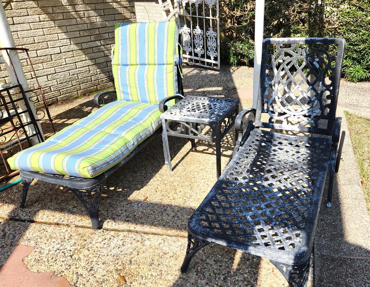 Lot #215 Pair of Vintage Patio Loungers with Cushions and Table