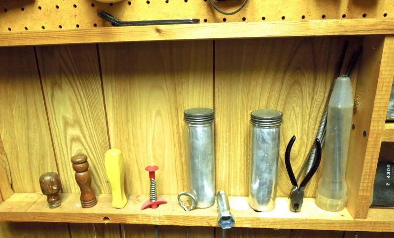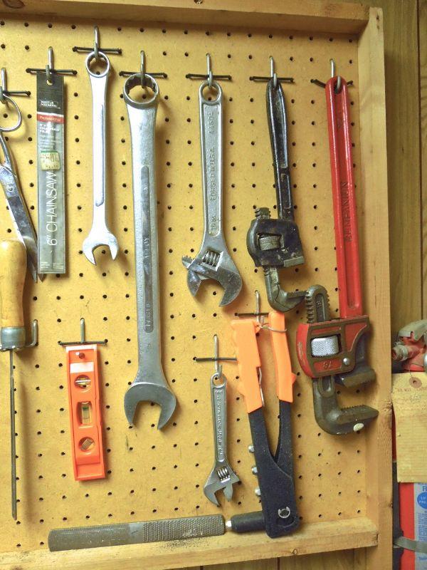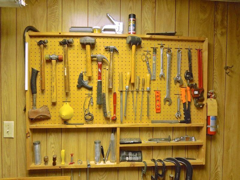 See pictures for details of tools included. Winning bidder may take rack and peg board off wall if desired. It is mounted to wall.