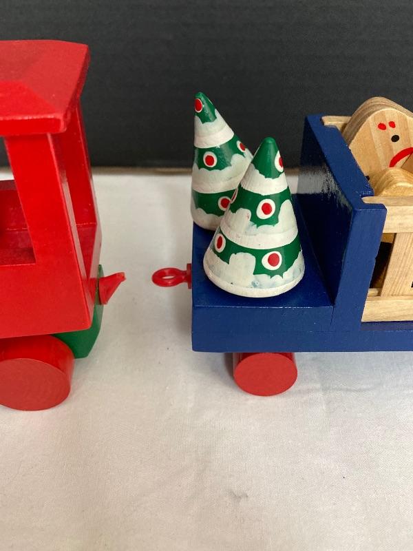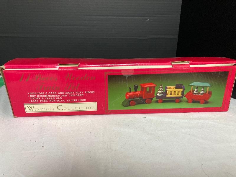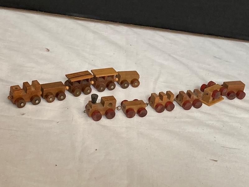 Windsor Collection eleven piece wooden train set, one of the hooks is broken. Two mini wooden trains. Wooden Sleigh measures 14” long x 6” wide