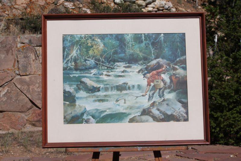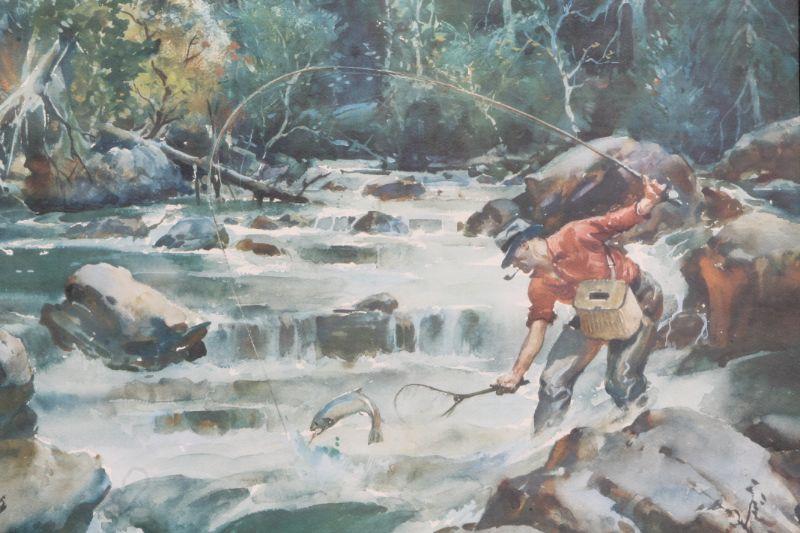 Lot 2-153: Vintage Watercolor Print "Strike of a Steelhead" SIGNED by JAMES SESSIONS {32" x 26"}