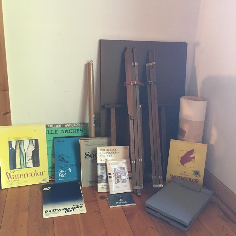 Get creative with this array of art supplies that includes not one but two Grumbacher #237 freestanding easels. Also included is one Anco Bilt table easel, sketch pad, watercolor pads, sketch boards, storage clipboard with brushes and more.