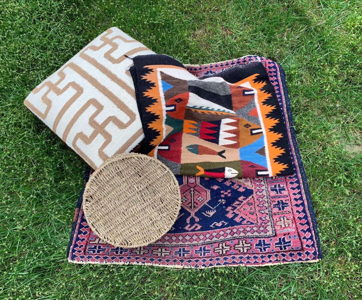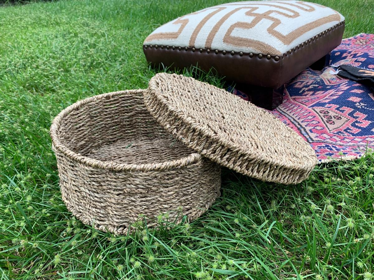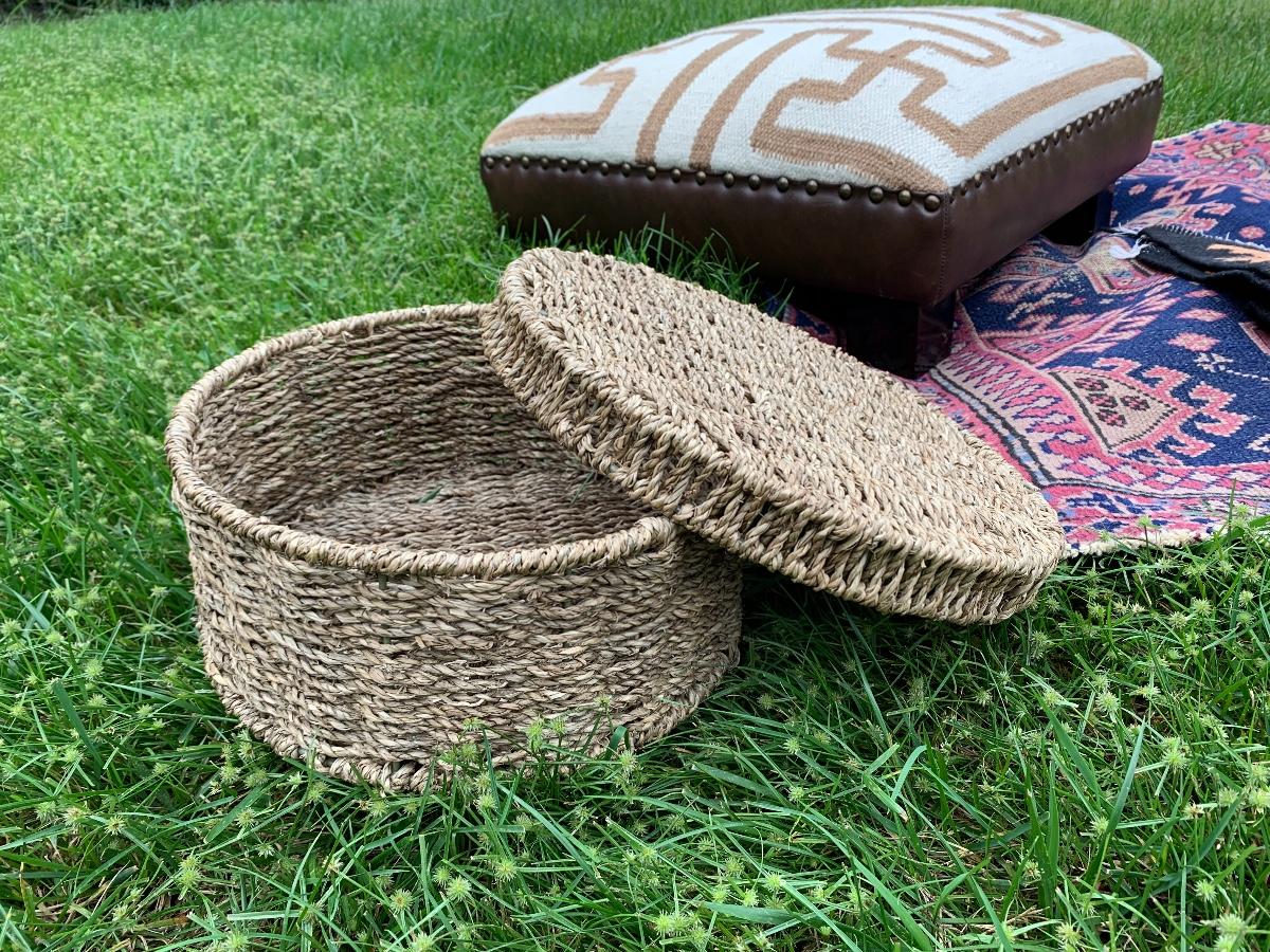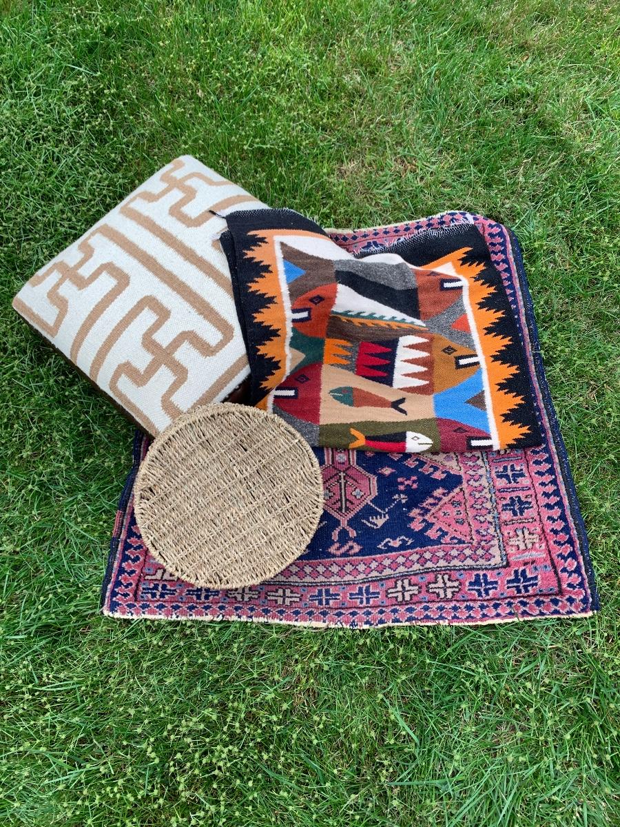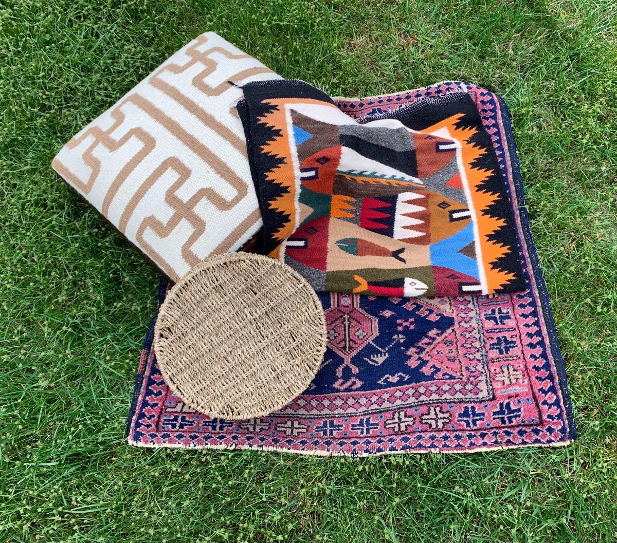Native hand woven wall hanging, sabai grass & metal storage basket, 20 x 20 foot stool, and rug.