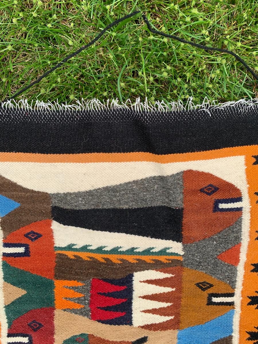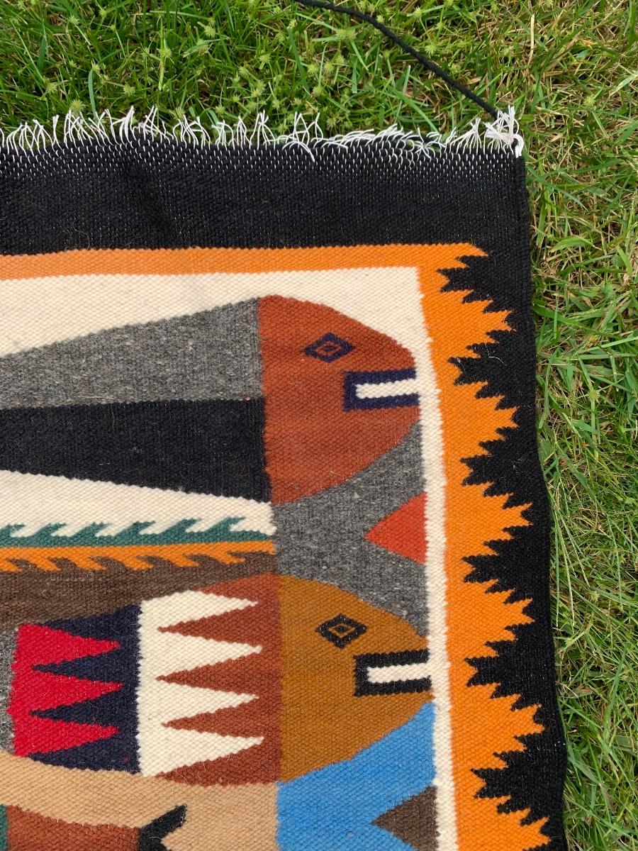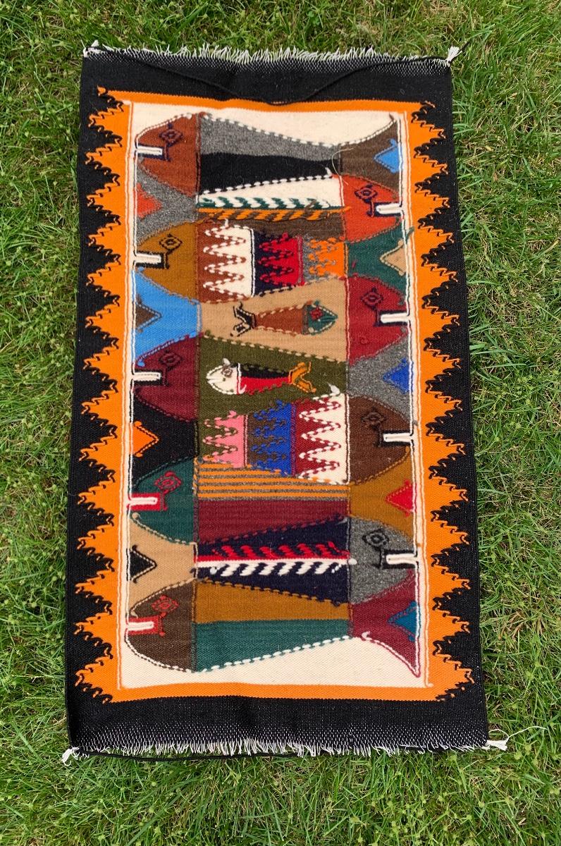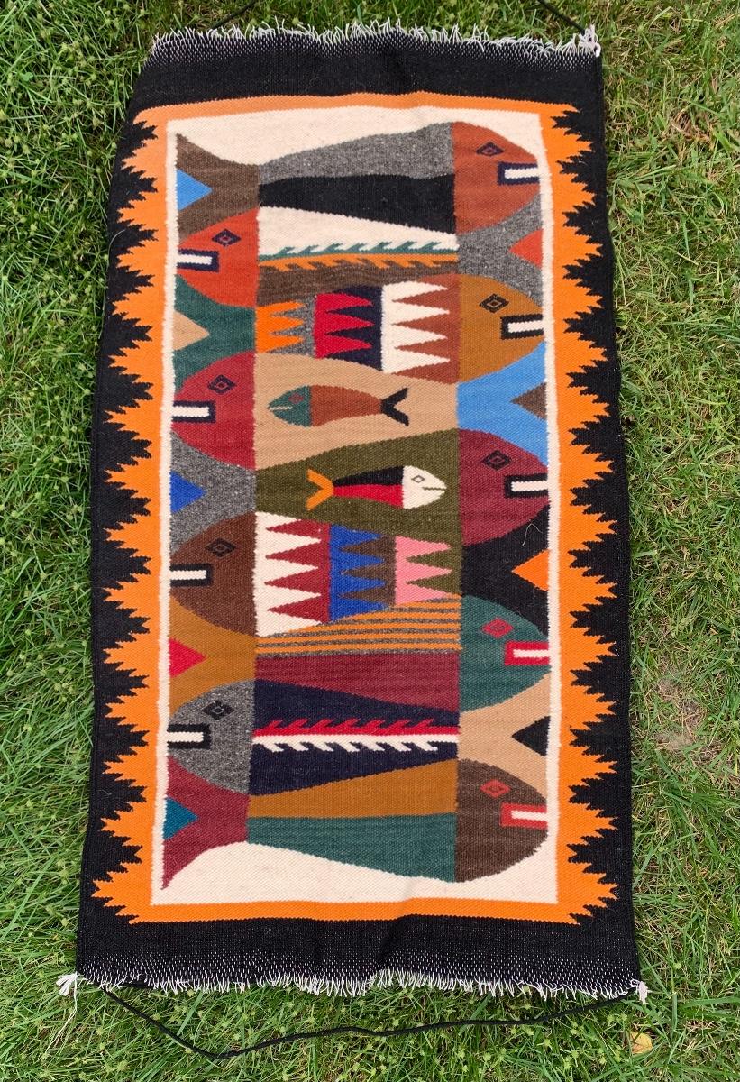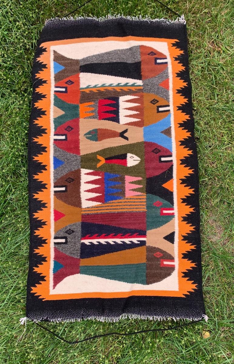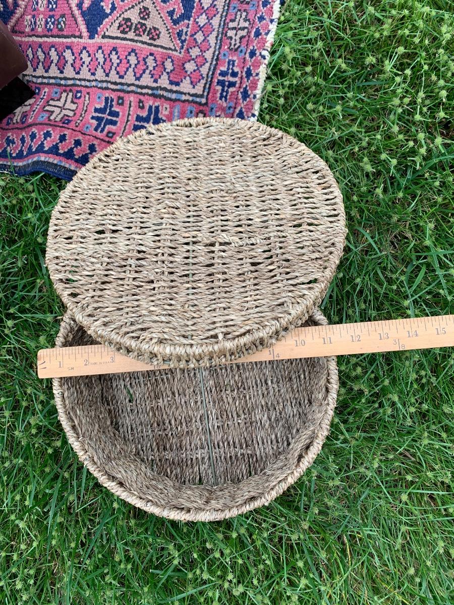 Native hand woven wall hanging, sabai grass & metal storage basket, 20 x 20 foot stool, and rug.