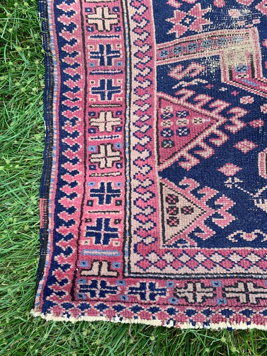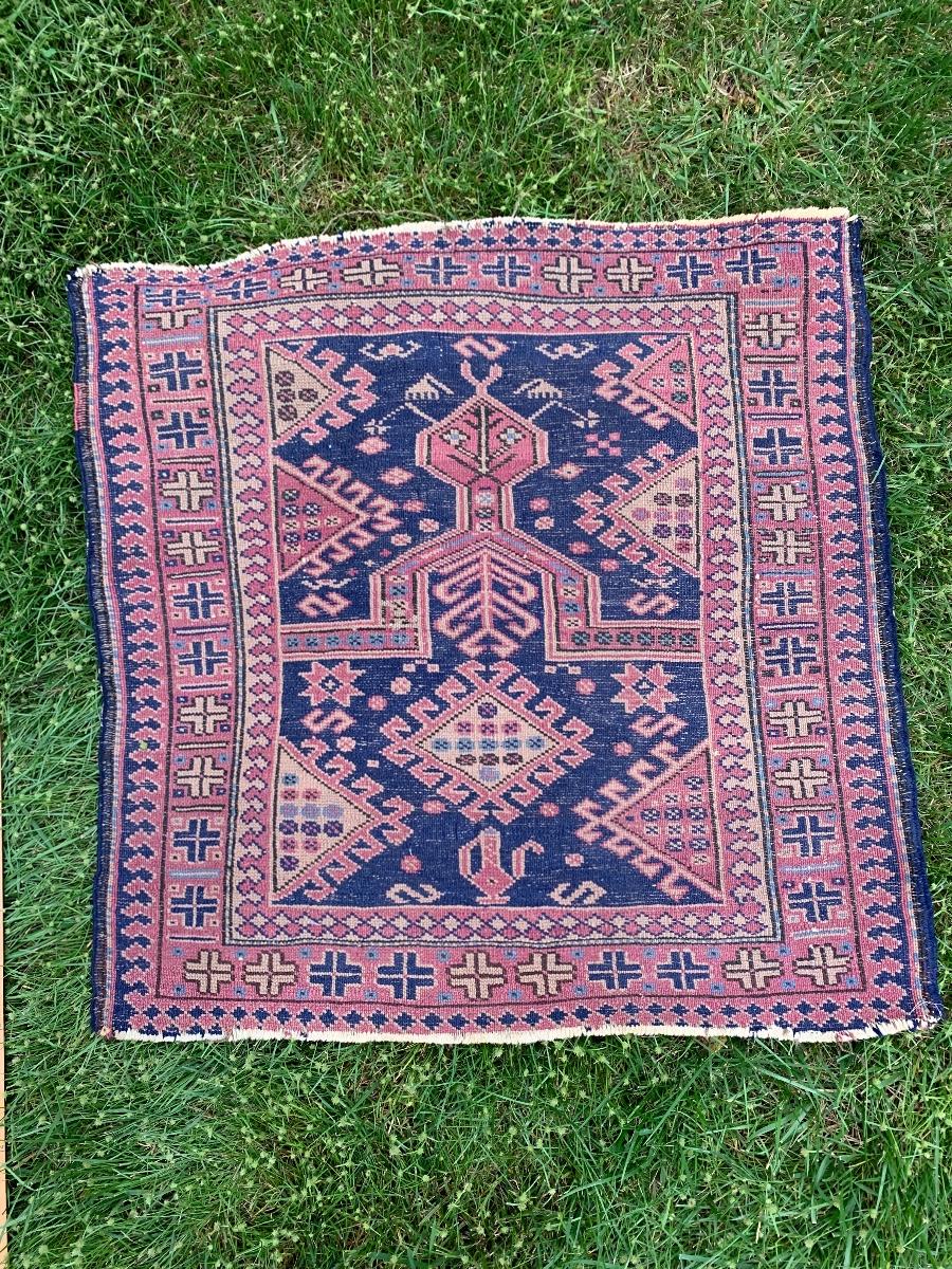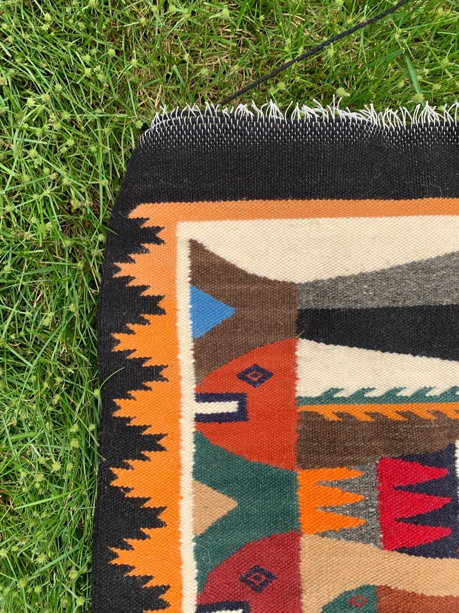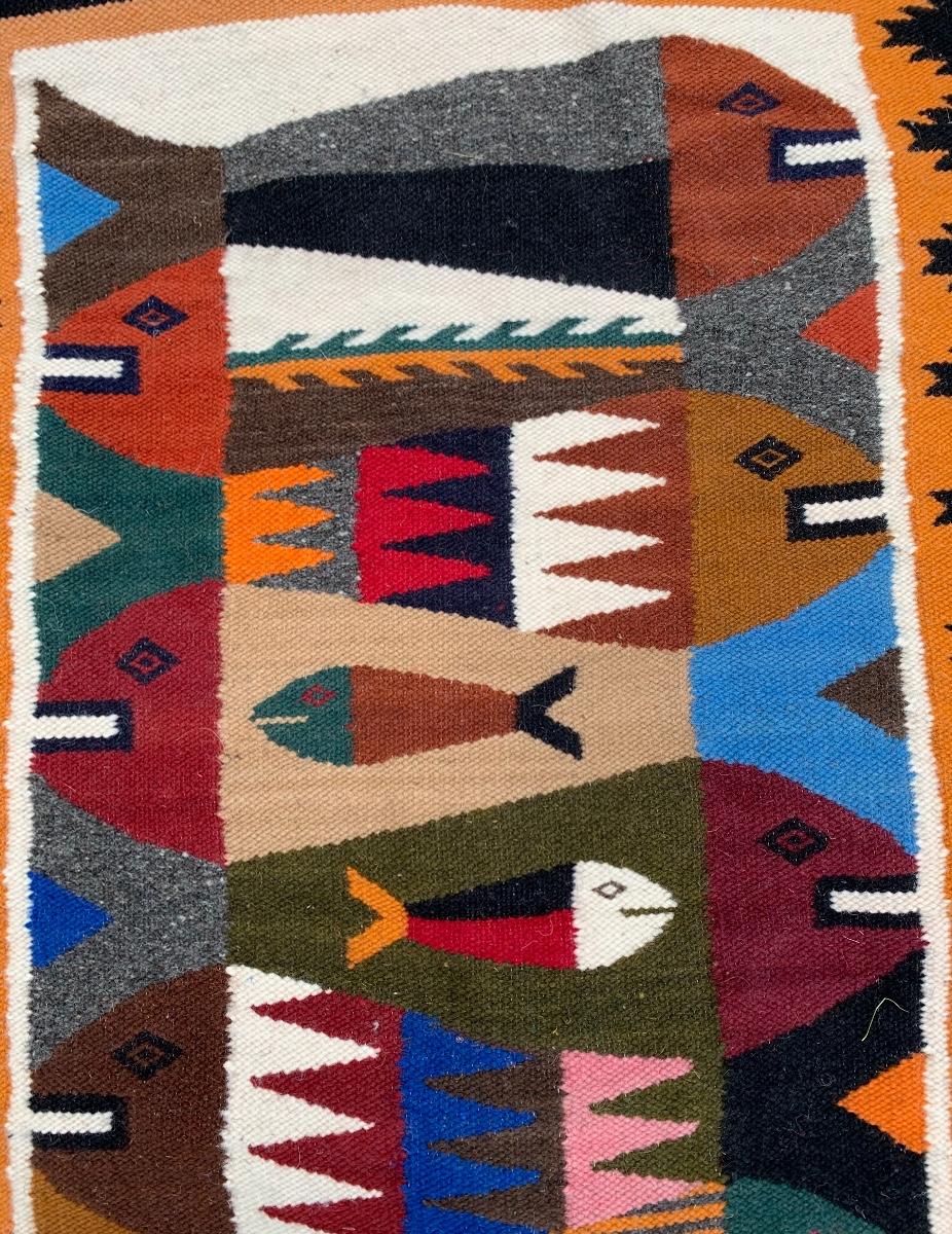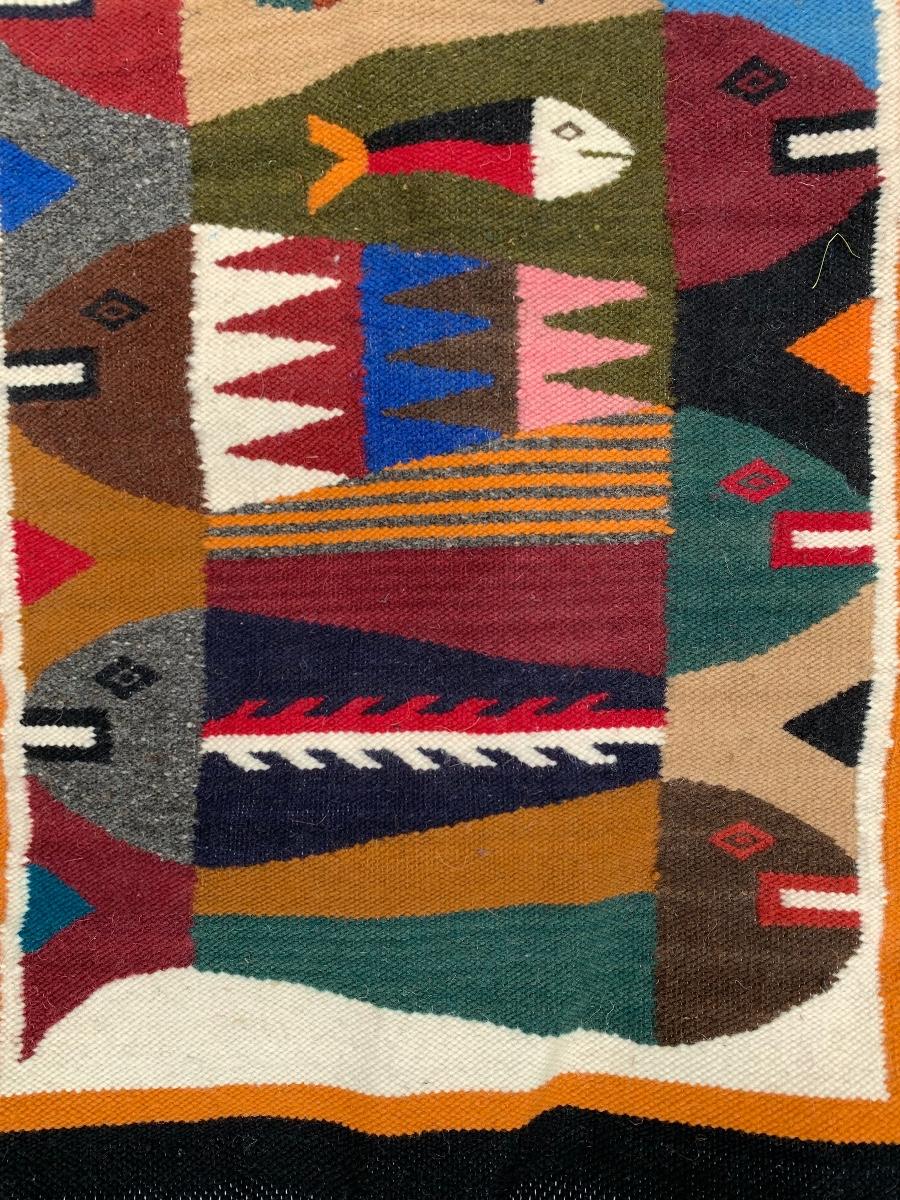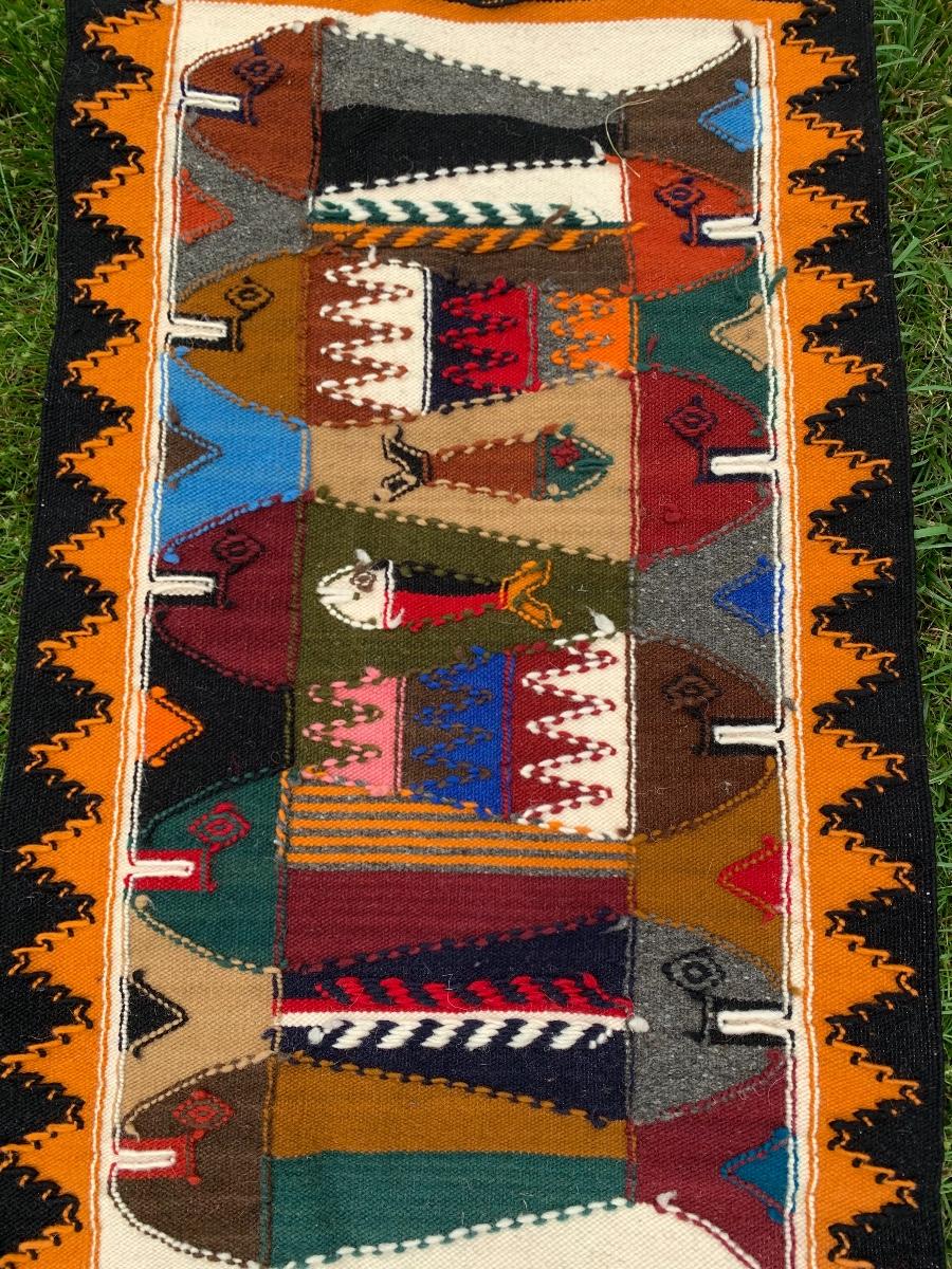 Native hand woven wall hanging, sabai grass & metal storage basket, 20 x 20 foot stool, and rug.