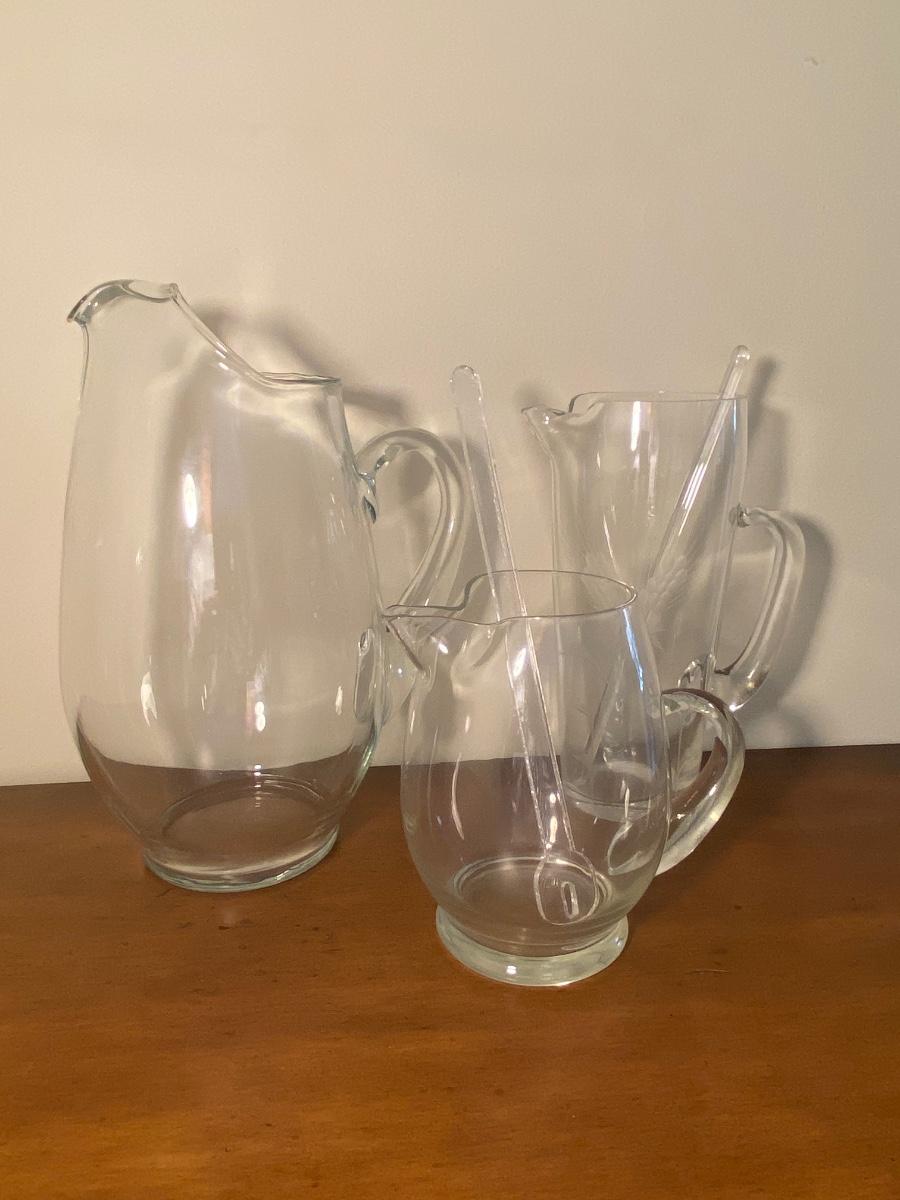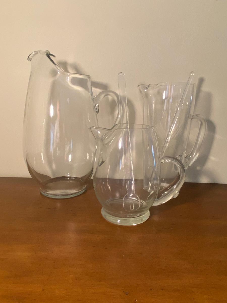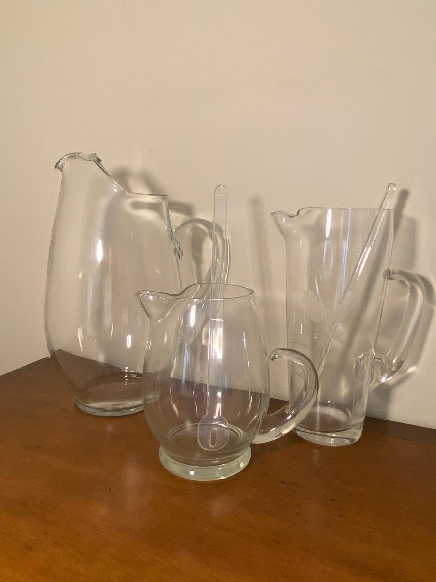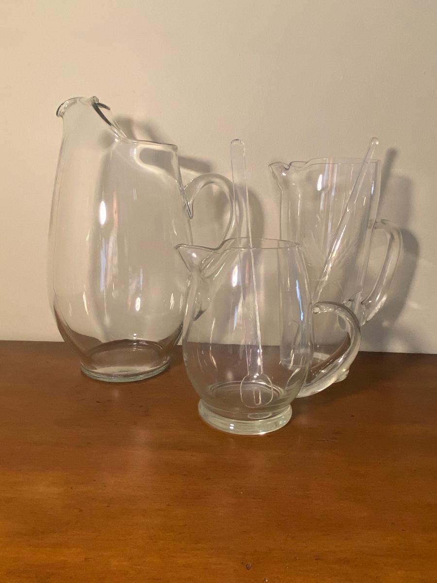 Collection of three glass pitchers and stirrers.