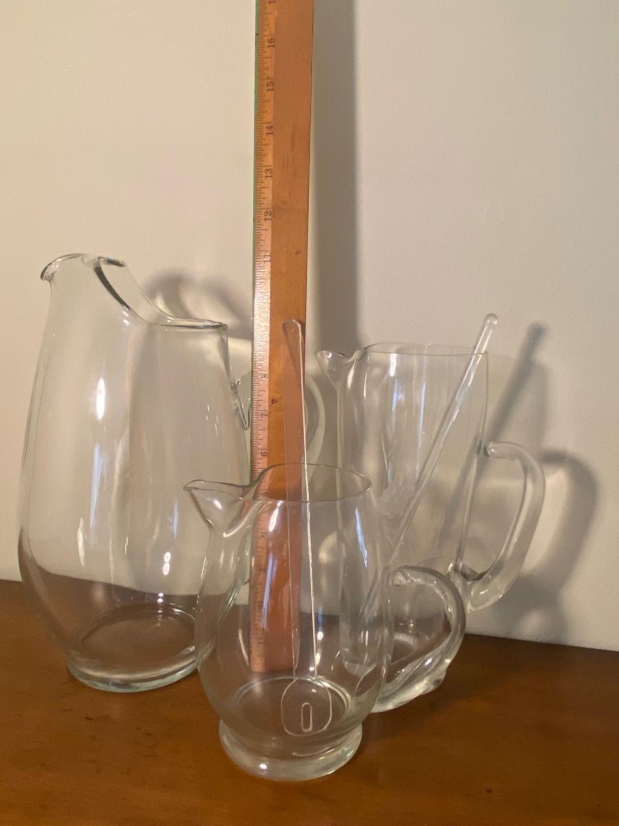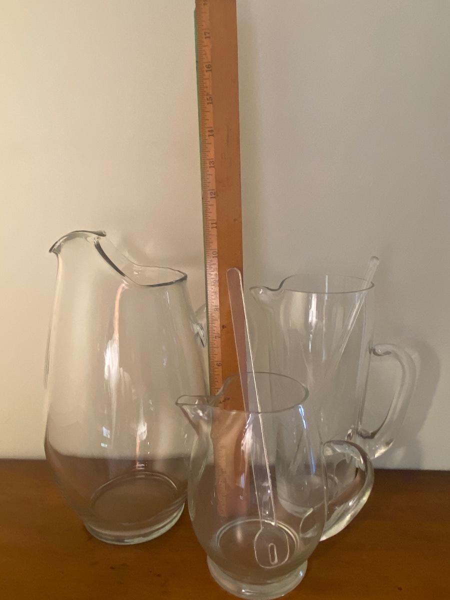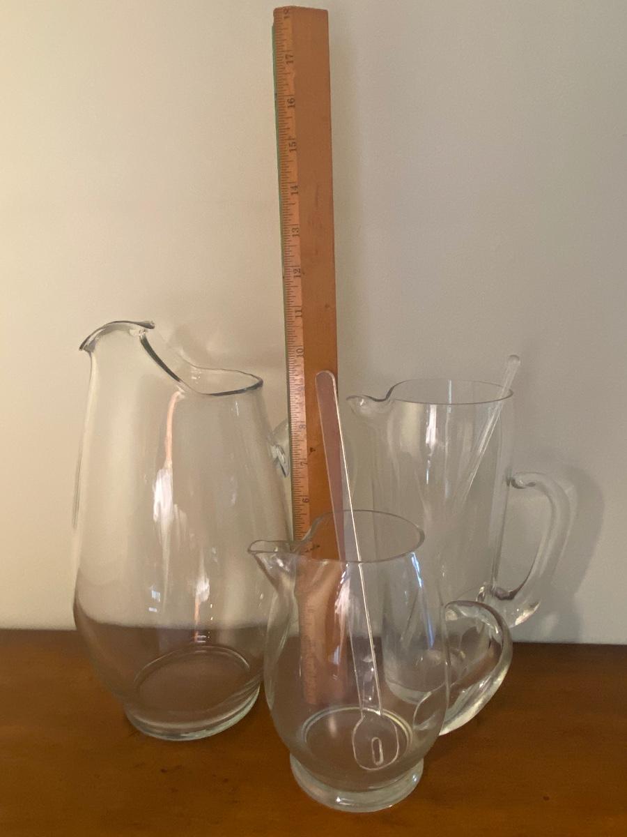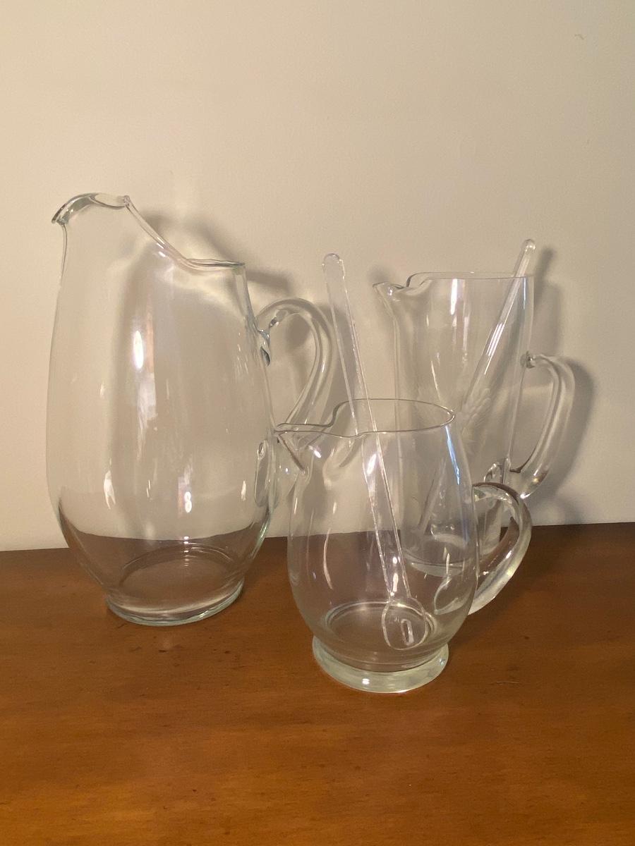 Collection of three glass pitchers and stirrers.